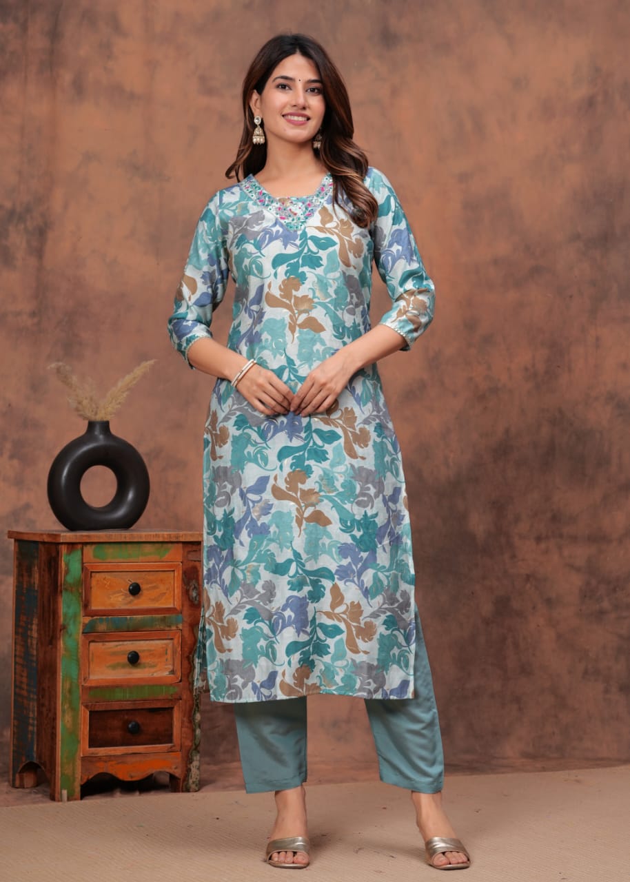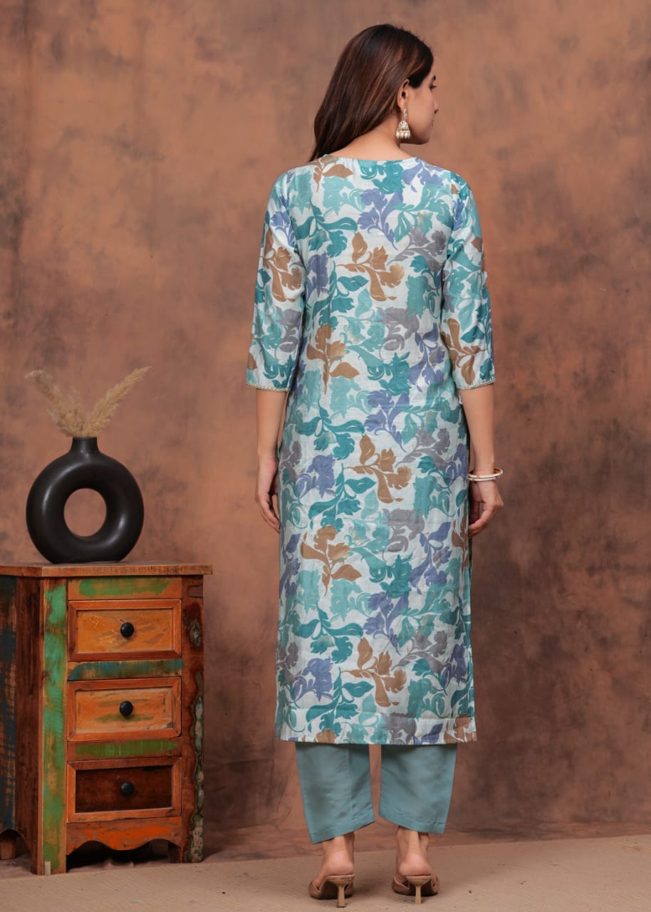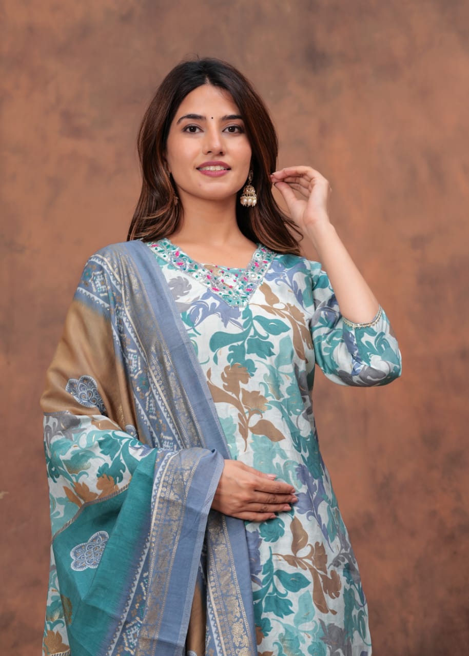 This Blue Casual Floral Printed Kurti Pant Dupatta Set offers a perfect blend of comfort and style. Crafted from soft muslin fabric, the straight-cut kurti features a vibrant floral print that exudes elegance and charm. The set includes matching pants for a coordinated look, while the accompanying dupatta adds a graceful touch. Ideal for casual outings or festive occasions, this 3-piece ensemble ensures a relaxed yet chic appearance. With its breathable fabric and modern design, this Salwar Kameez Dress promises both style and comfort, making it a versatile addition to any wardrobe. Perfect for everyday wear or special events.