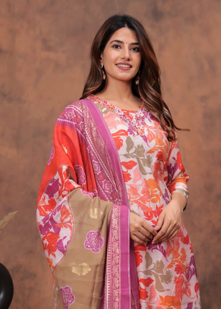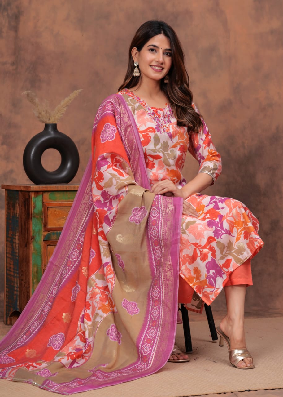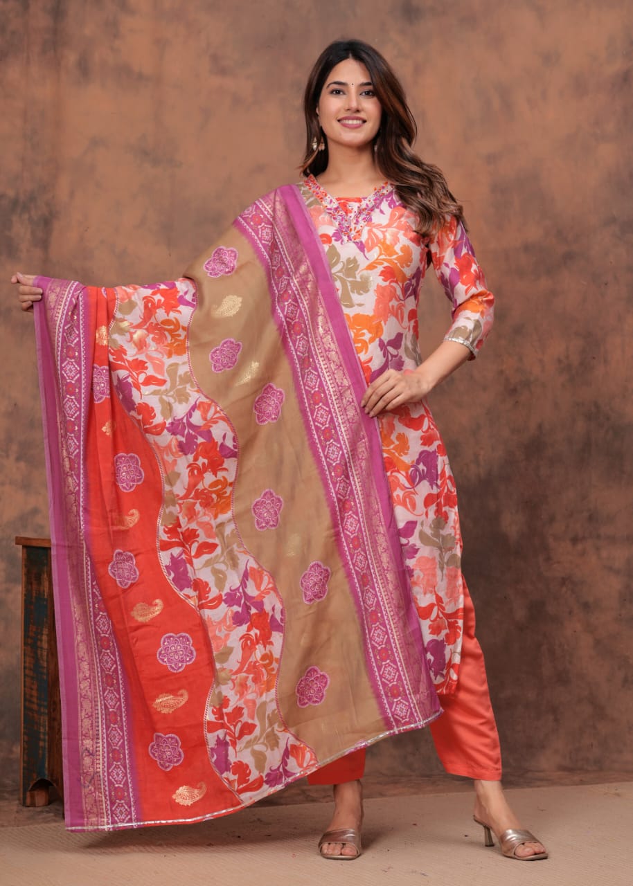This Orange Casual Floral Printed Kurti Pant Dupatta Set offers a perfect blend of comfort and style. Crafted from soft muslin fabric, the straight-cut kurti features a vibrant floral print that exudes elegance and charm. The set includes matching pants for a coordinated look, while the accompanying dupatta adds a graceful touch. Ideal for casual outings or festive occasions, this 3-piece ensemble ensures a relaxed yet chic appearance. With its breathable fabric and modern design, this Salwar Kameez Dress promises both style and comfort, making it a versatile addition to any wardrobe. Perfect for everyday wear or special events.