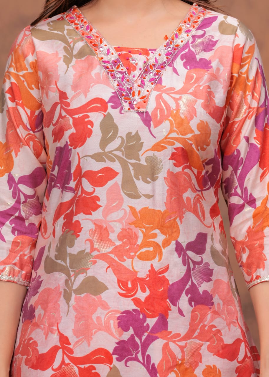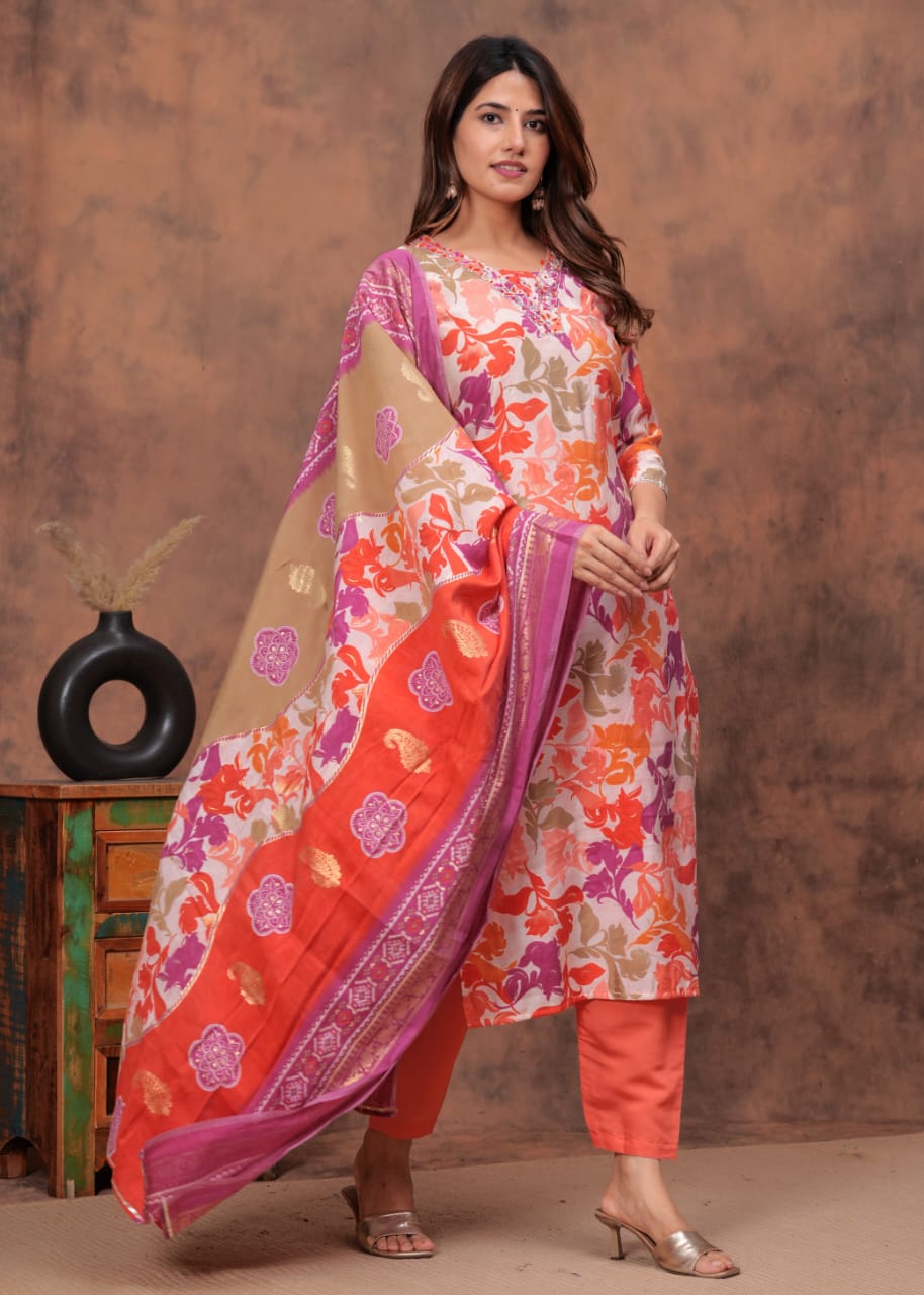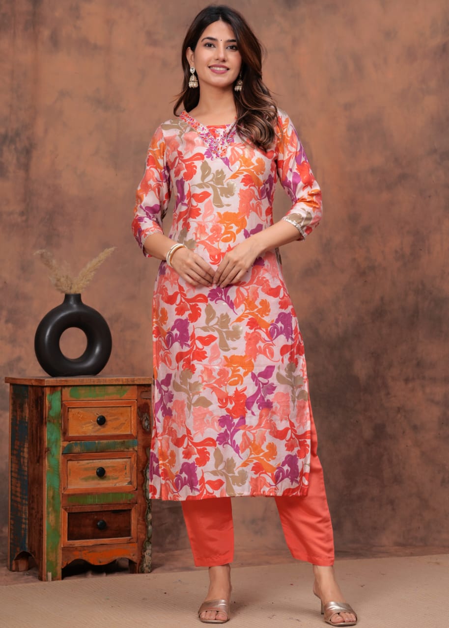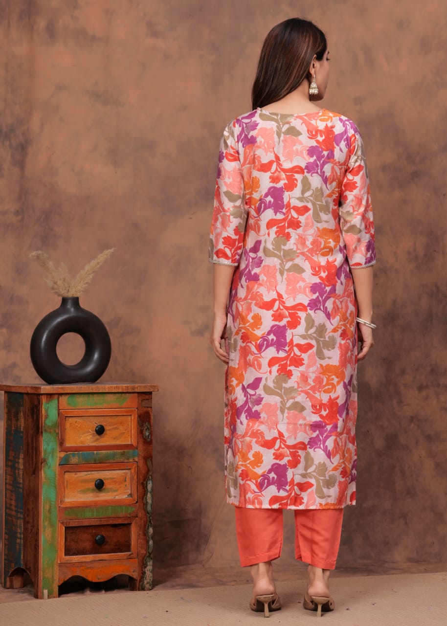 This Orange Casual Floral Printed Kurti Pant Dupatta Set offers a perfect blend of comfort and style. Crafted from soft muslin fabric, the straight-cut kurti features a vibrant floral print that exudes elegance and charm. The set includes matching pants for a coordinated look, while the accompanying dupatta adds a graceful touch. Ideal for casual outings or festive occasions, this 3-piece ensemble ensures a relaxed yet chic appearance. With its breathable fabric and modern design, this Salwar Kameez Dress promises both style and comfort, making it a versatile addition to any wardrobe. Perfect for everyday wear or special events.