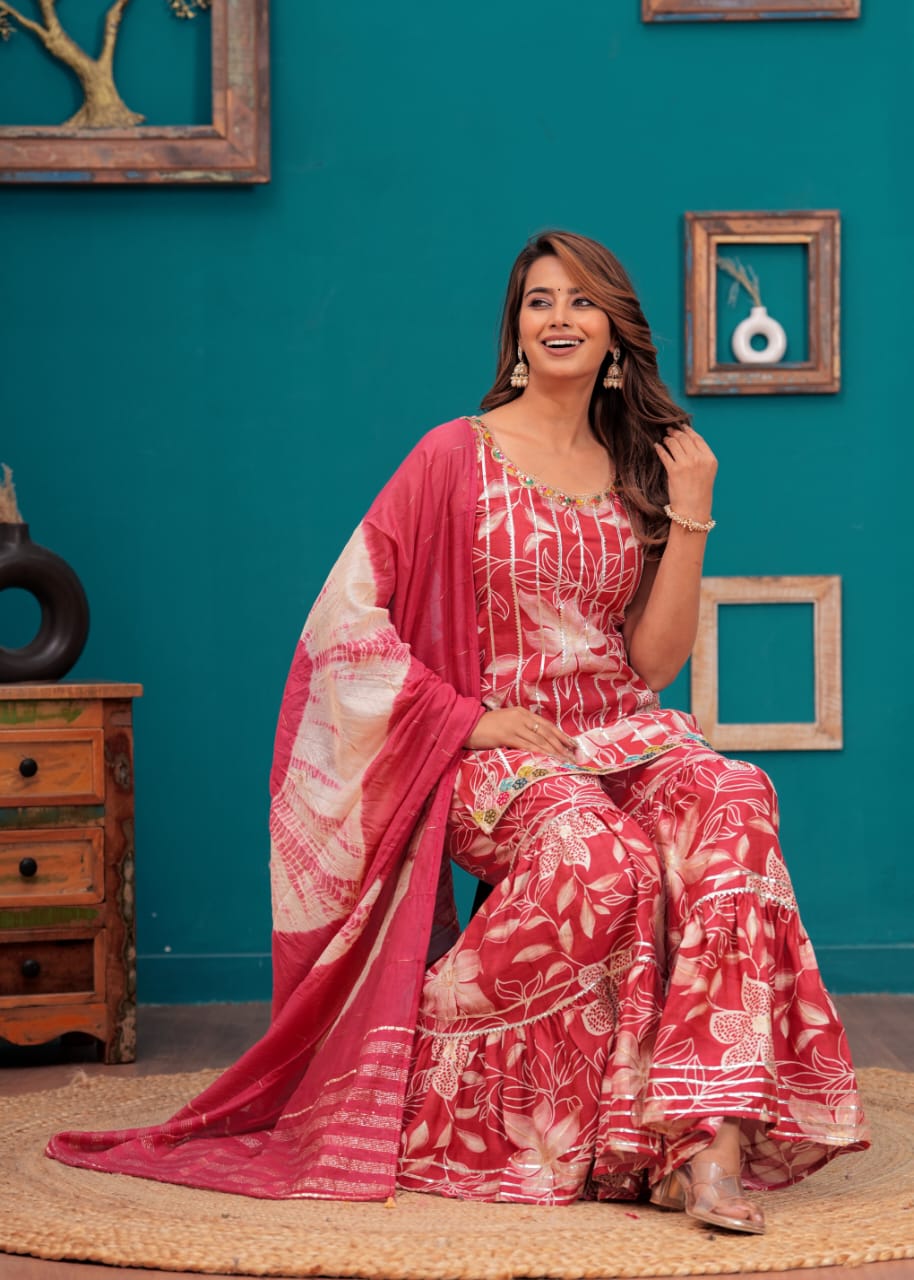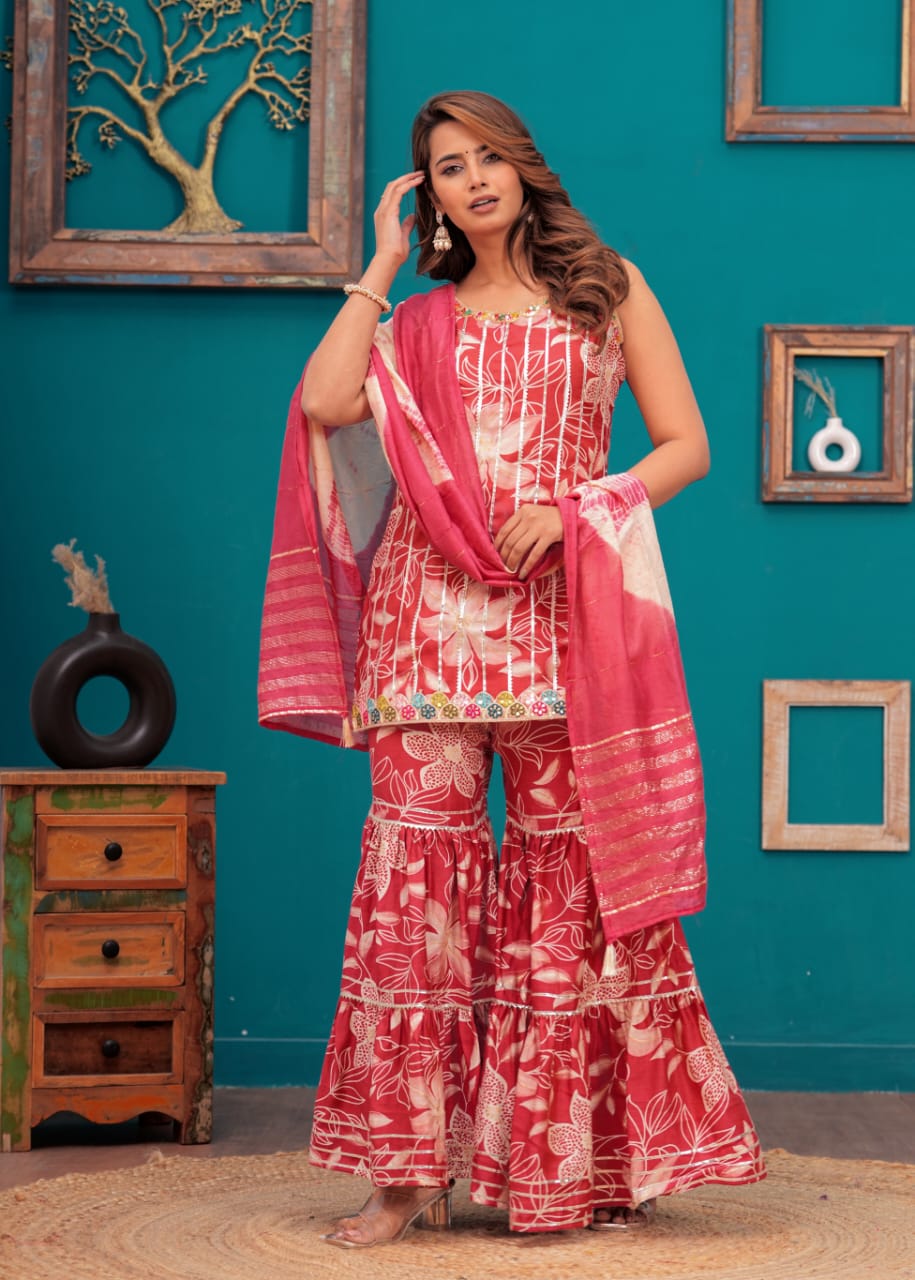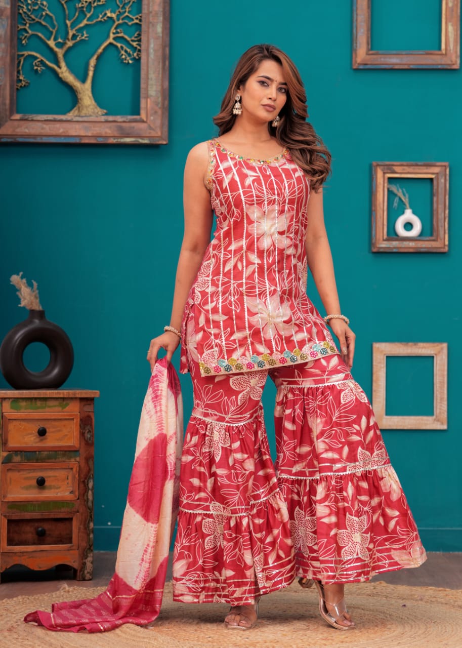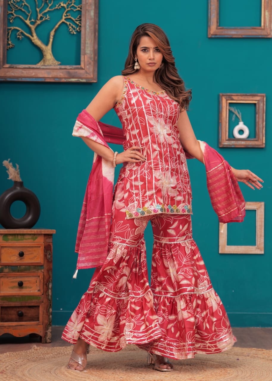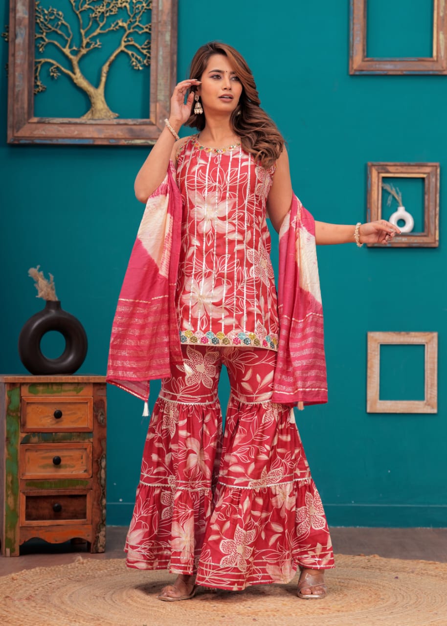 This Pink Indian Pakistani Readymade Floral Sleeveless Salwar Kameez Set combines classic elegance with modern flair. The dress features a vibrant floral print, intricately designed to add a touch of sophistication to your ethnic look. Made from high-quality fabric, the sleeveless kameez offers comfort and style, while the flowy sharara bottoms provide a graceful silhouette. Perfect for weddings, festive events, or casual gatherings, this designer suit stands out with its contemporary charm and traditional appeal. Easy to wear and maintain, it's a versatile and stylish addition to any woman's wardrobe.