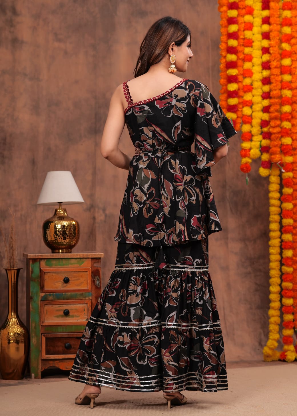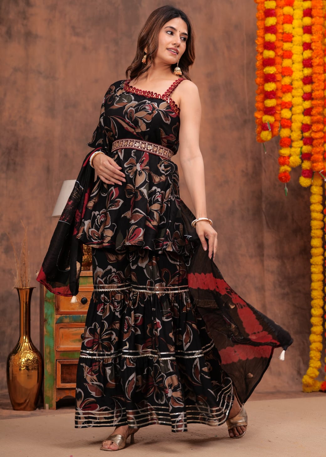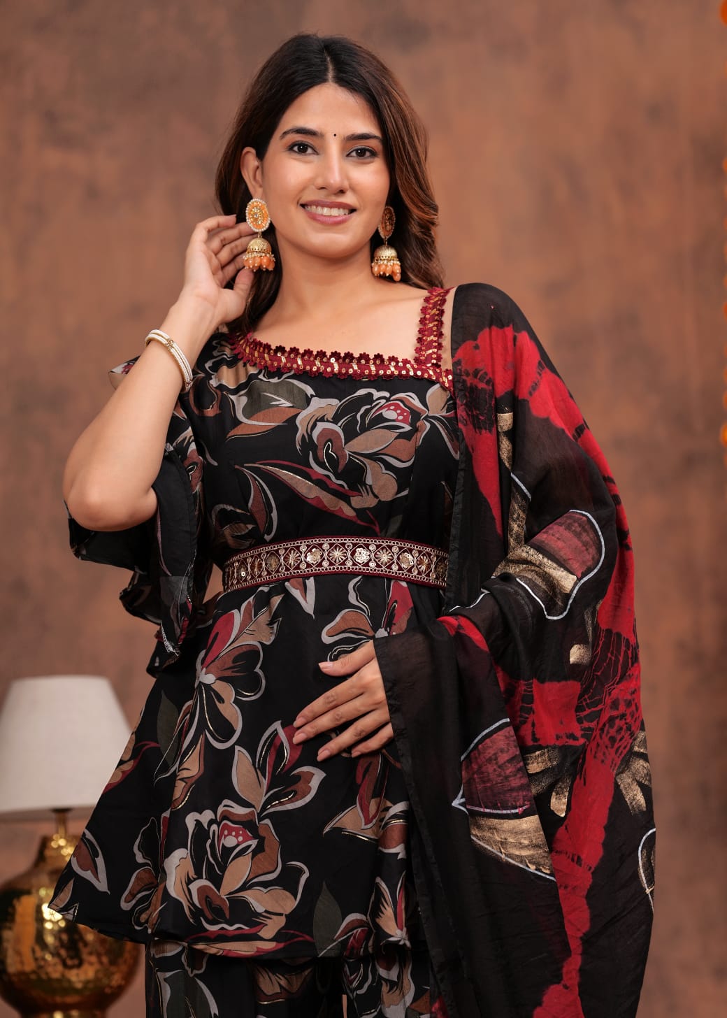 This Black Indian Pakistani Readymade Floral Salwar Kameez Set combines classic elegance with modern flair. The dress features a vibrant floral print, intricately designed to add a touch of sophistication to your ethnic look. Made from high-quality Muslin fabric, the Sharara Suit offers comfort and style, while the flowy bottoms provide a graceful silhouette. Perfect for weddings, festive events, or casual gatherings, this designer suit stands out with its contemporary charm and traditional appeal. Easy to wear and maintain, it's a versatile and stylish addition to any woman's wardrobe.