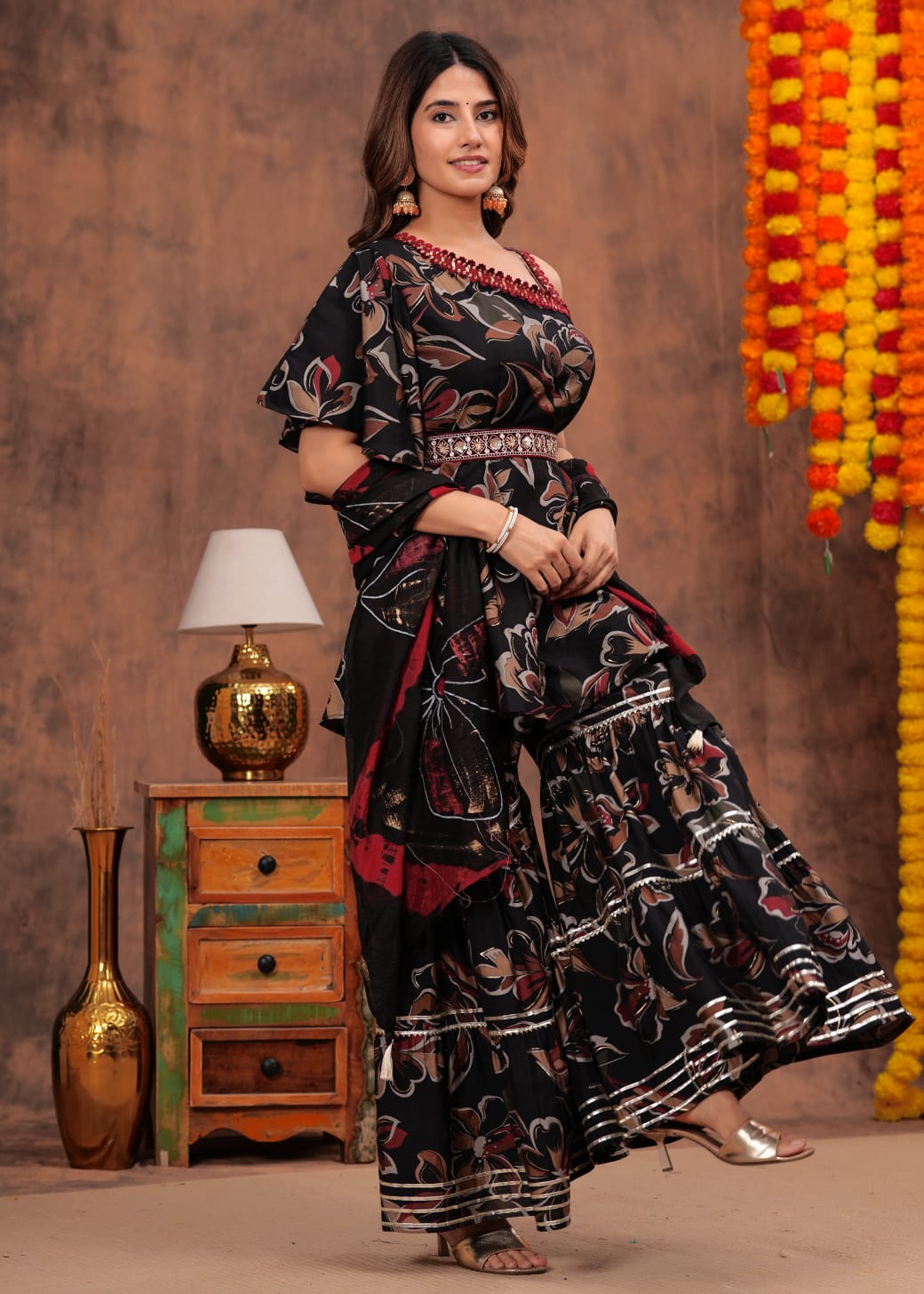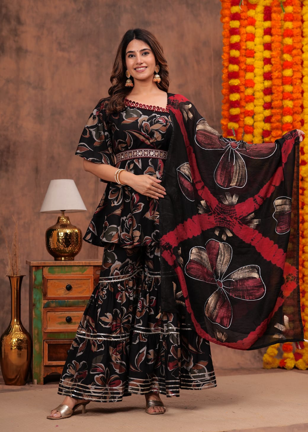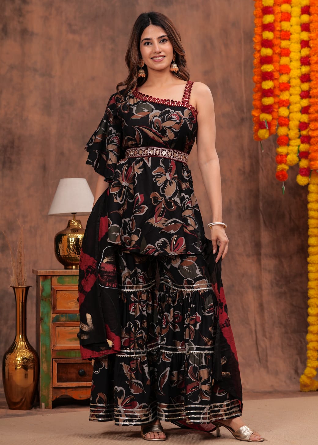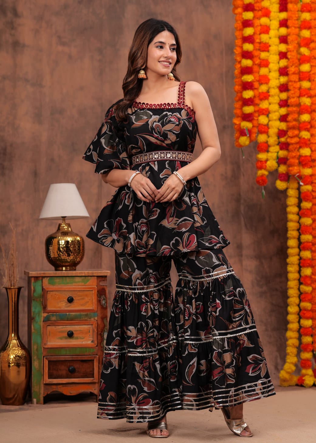 This Black Indian Pakistani Readymade Floral Salwar Kameez Set combines classic elegance with modern flair. The dress features a vibrant floral print, intricately designed to add a touch of sophistication to your ethnic look. Made from high-quality Muslin fabric, the Sharara Suit offers comfort and style, while the flowy bottoms provide a graceful silhouette. Perfect for weddings, festive events, or casual gatherings, this designer suit stands out with its contemporary charm and traditional appeal. Easy to wear and maintain, it's a versatile and stylish addition to any woman's wardrobe.