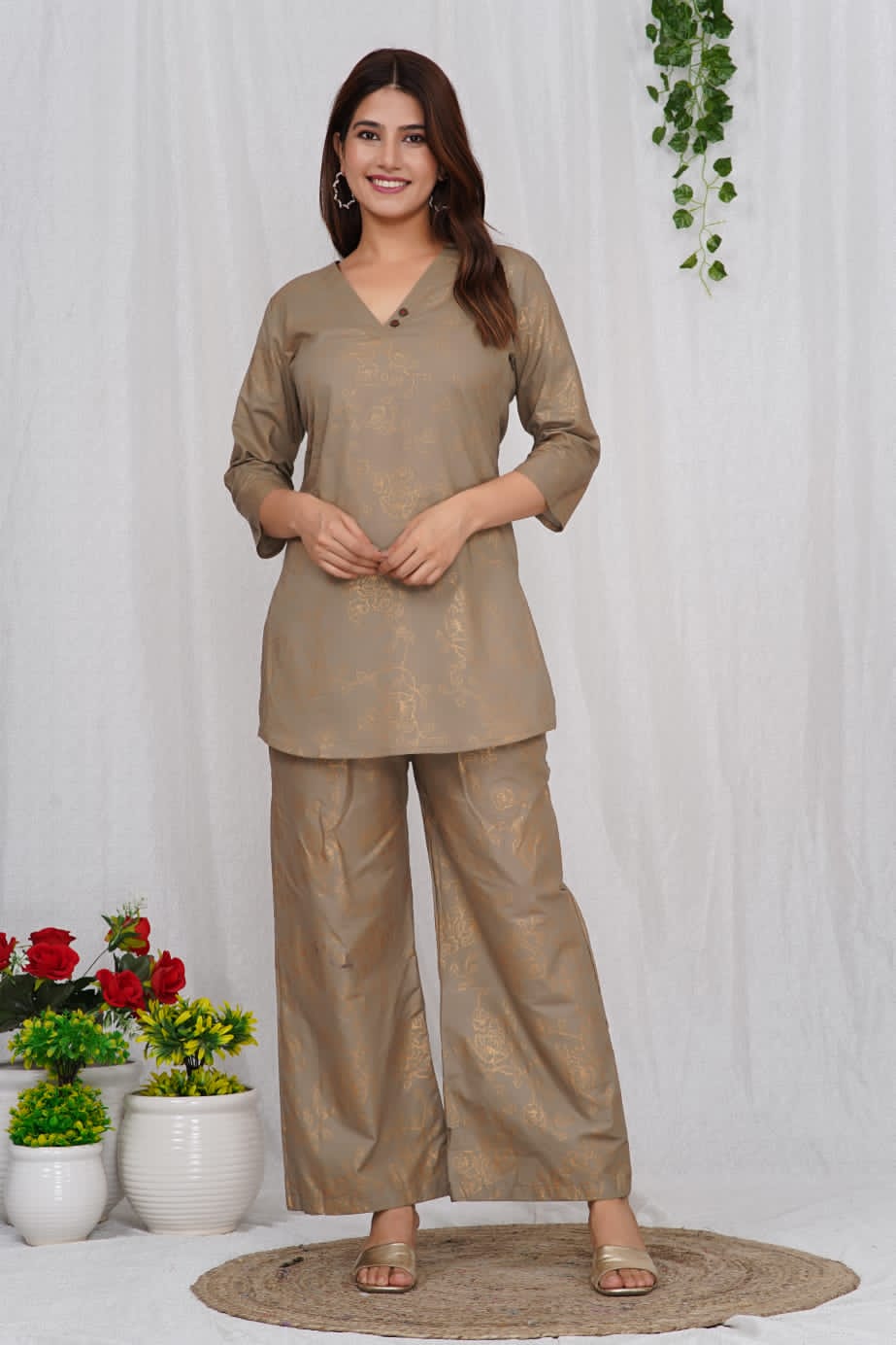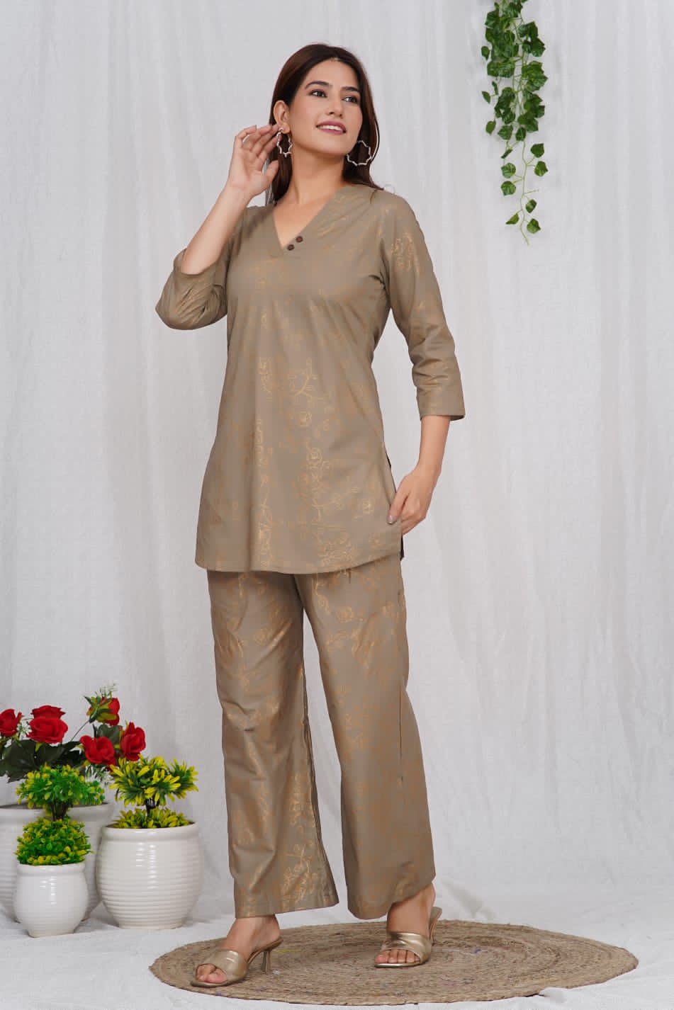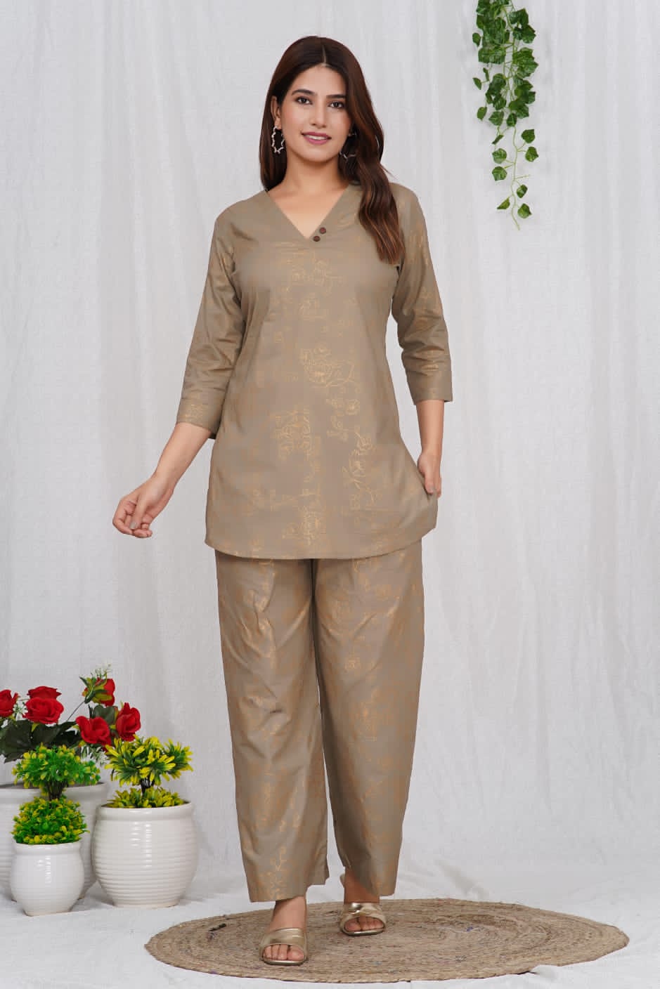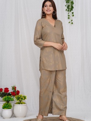 Brown Cotton Golden Printed Dress Kurti Pant Co Ord Set for Summer