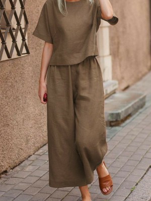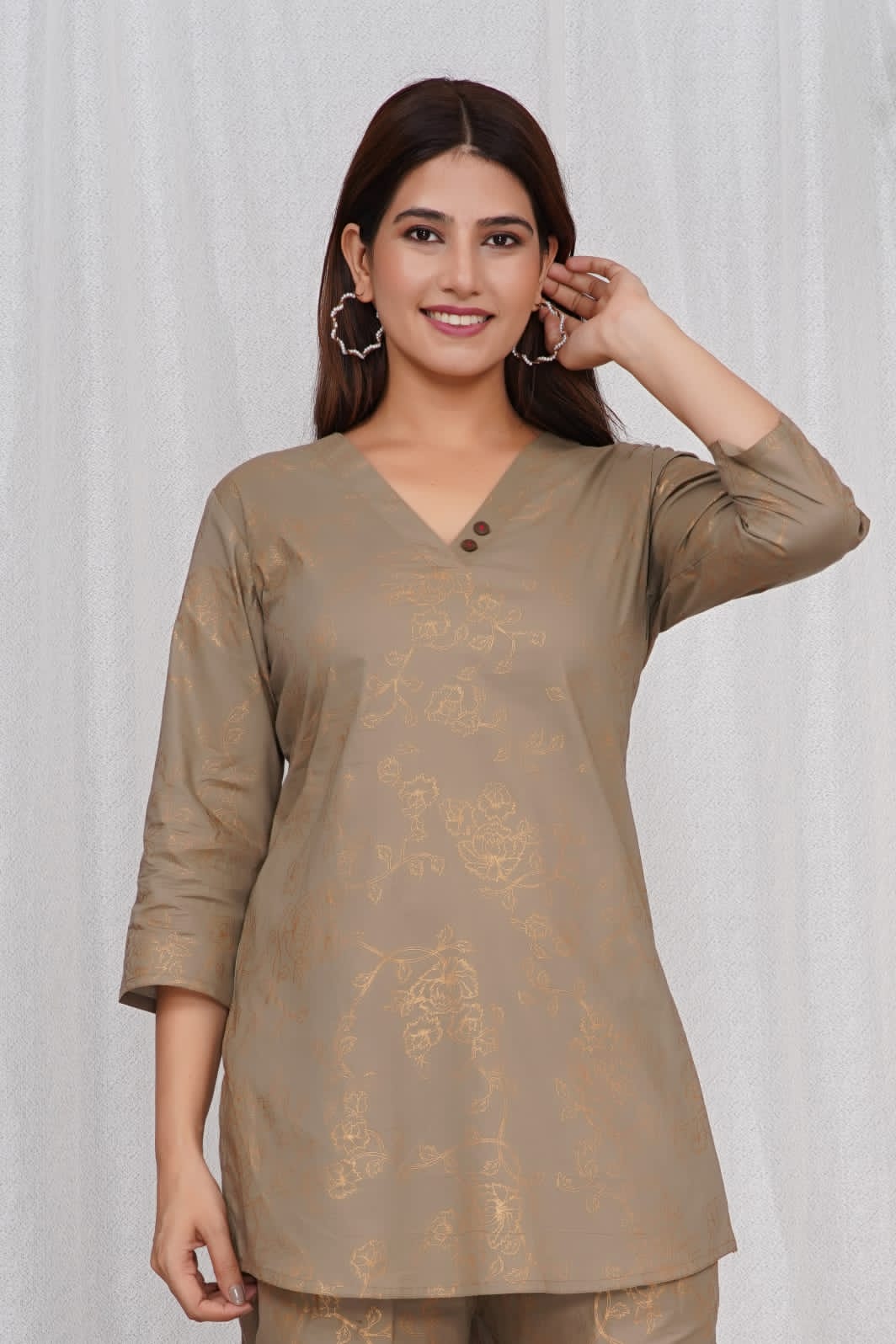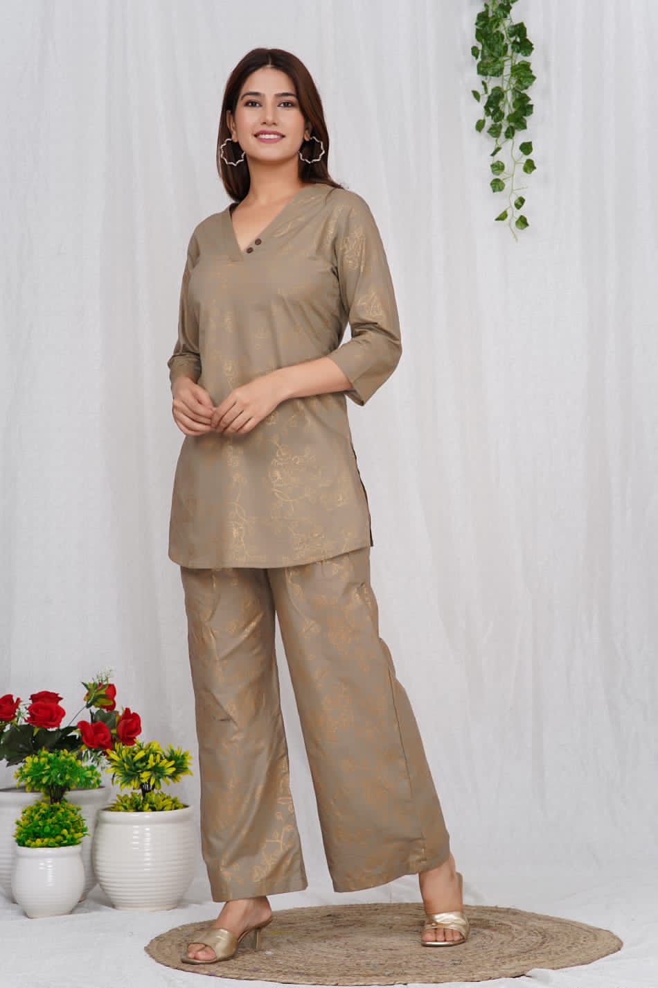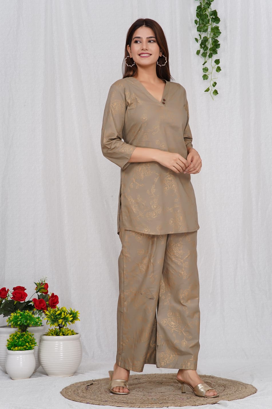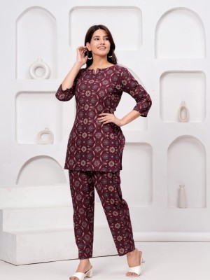 Brown Cotton Golden Printed Dress Kurti Pant Co Ord Set for Summer