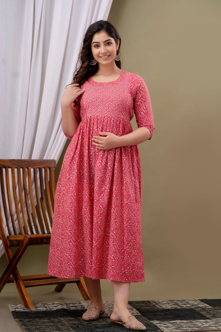Pink Floral Cotton Maternity Baby Feeding Gown Anarkali Kurti with Hidden Feeding Zip