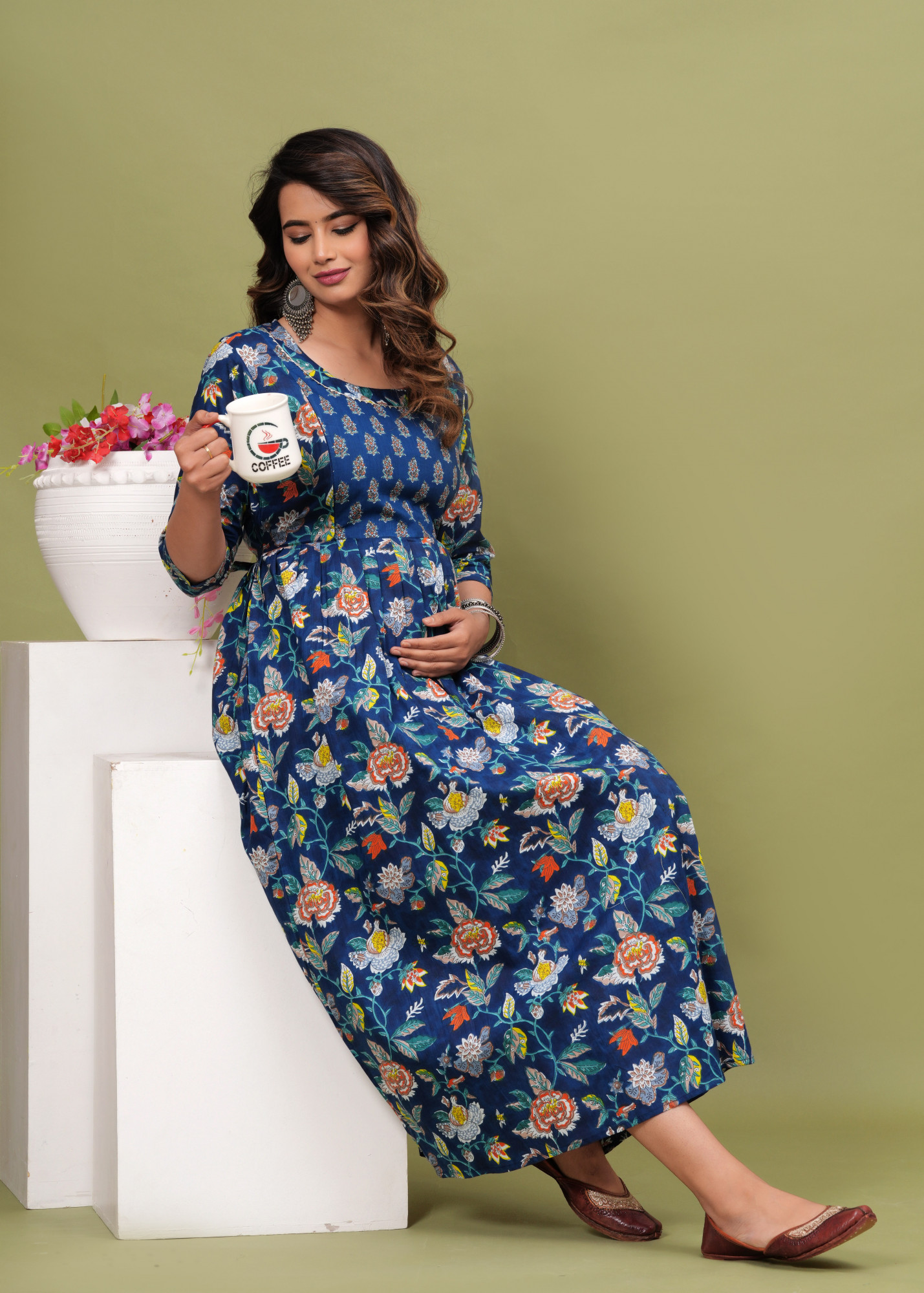 Blue Cotton Maternity Baby Feeding Gown Anarkali Kurti with Hidden Feeding Zip