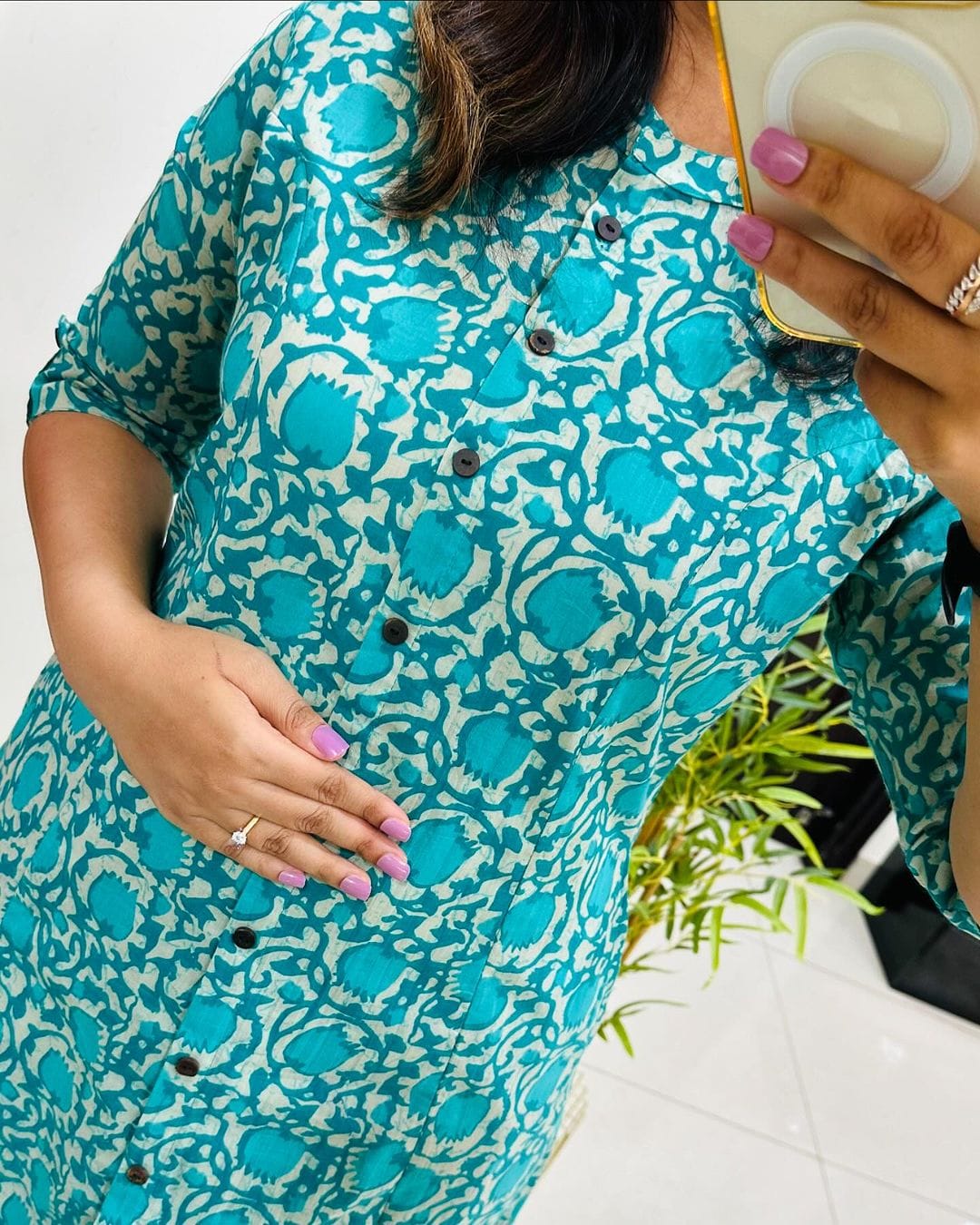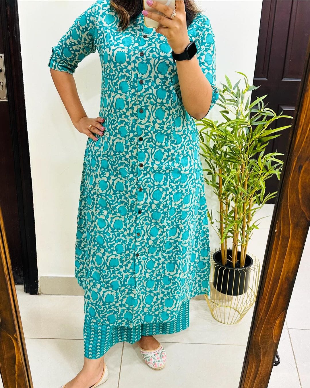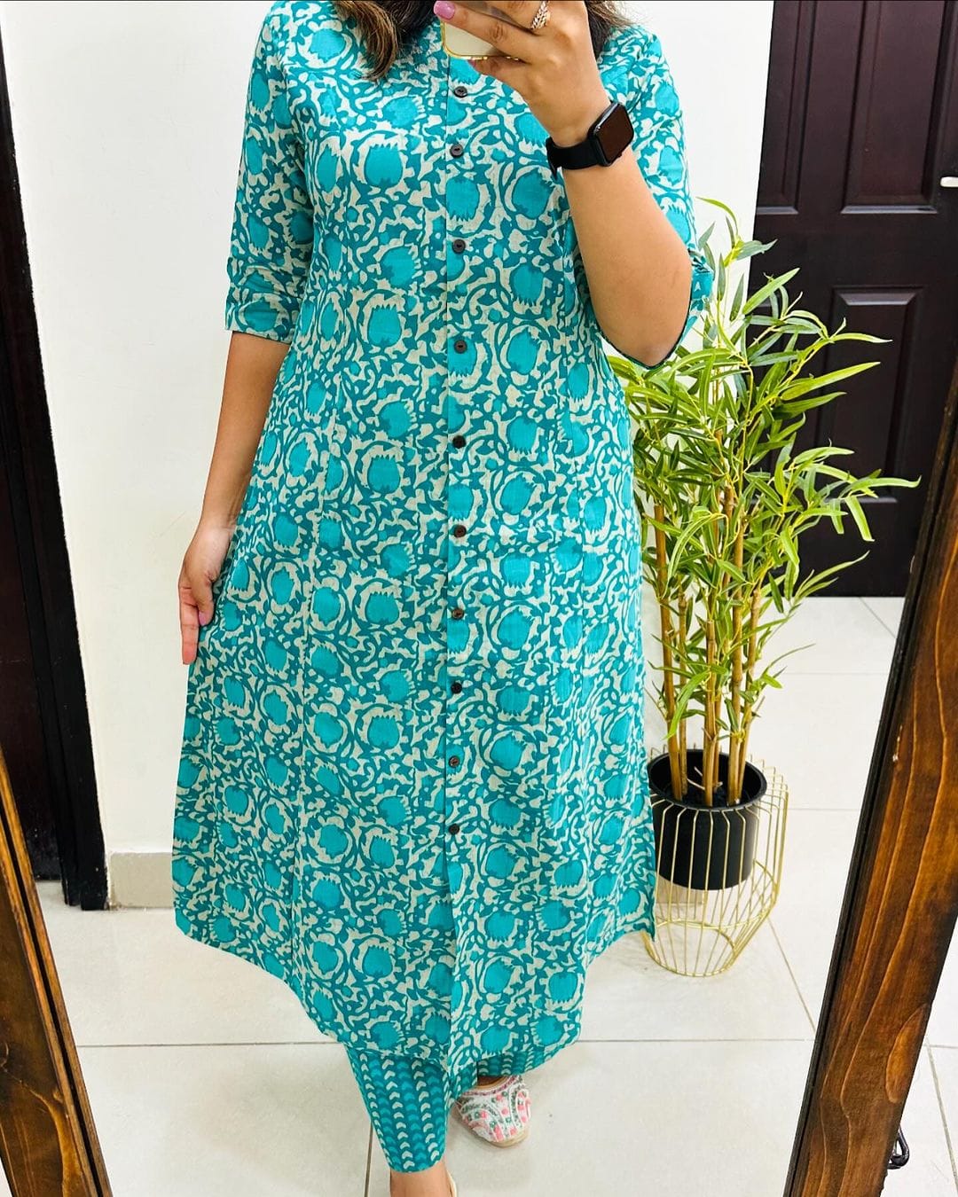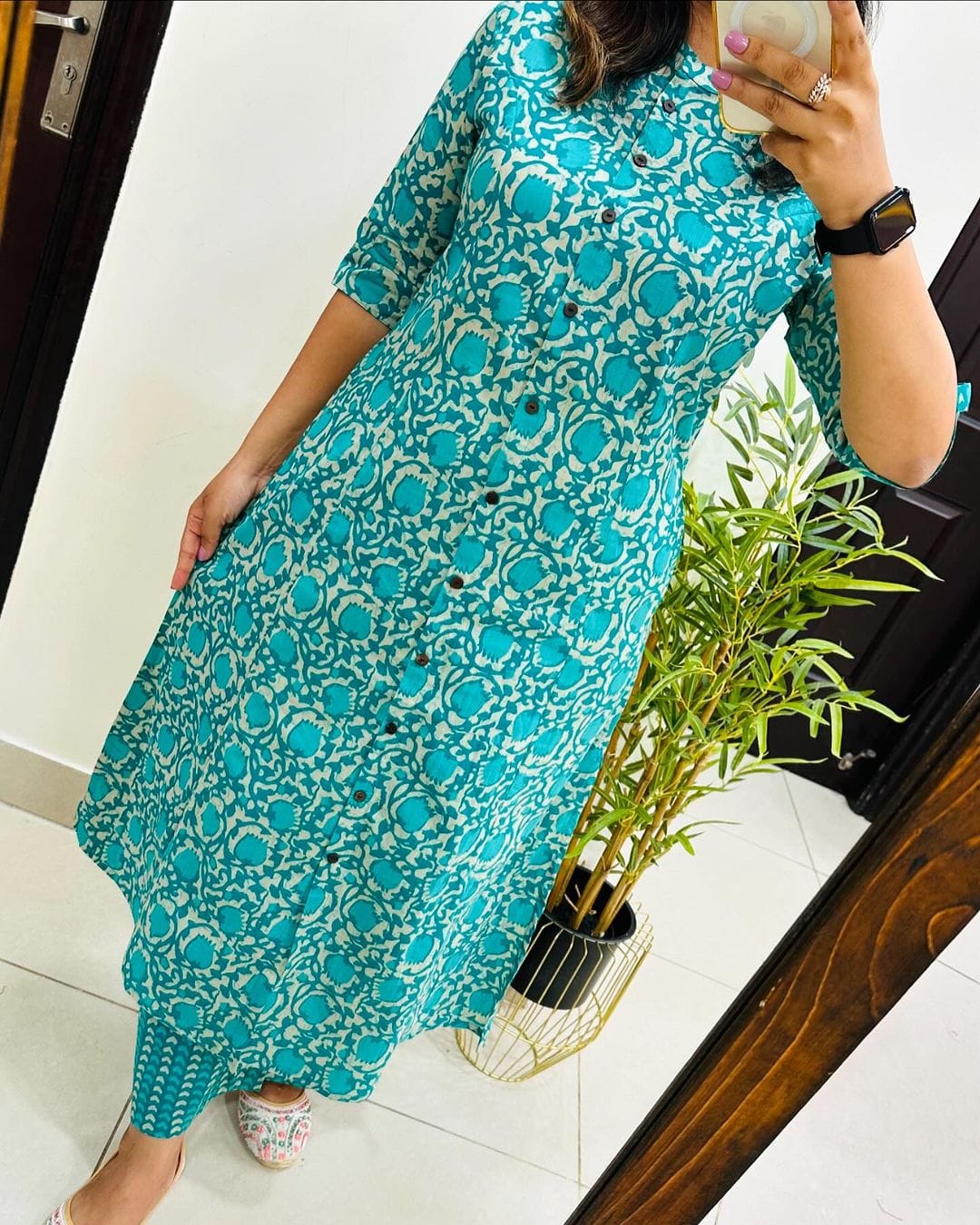 Sufiyana Blue Floral Printed Indian A line Cotton Salwar Kameez Kurti Pant Co Ord Set