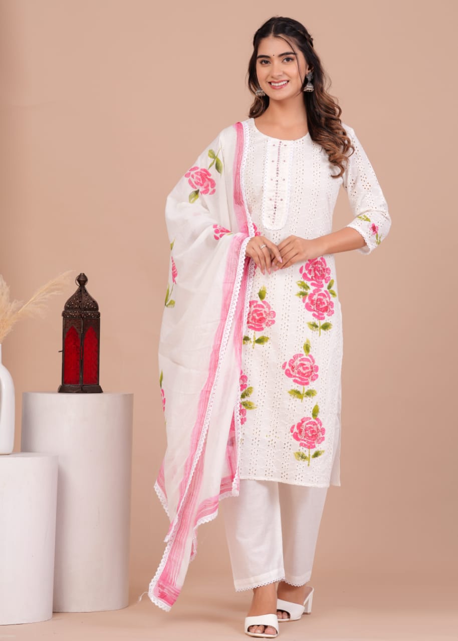 Pink White Color Schiffli Indian Pakistani Straight Salwar Kameez Kurti Pant Set for Women Partywear Dress