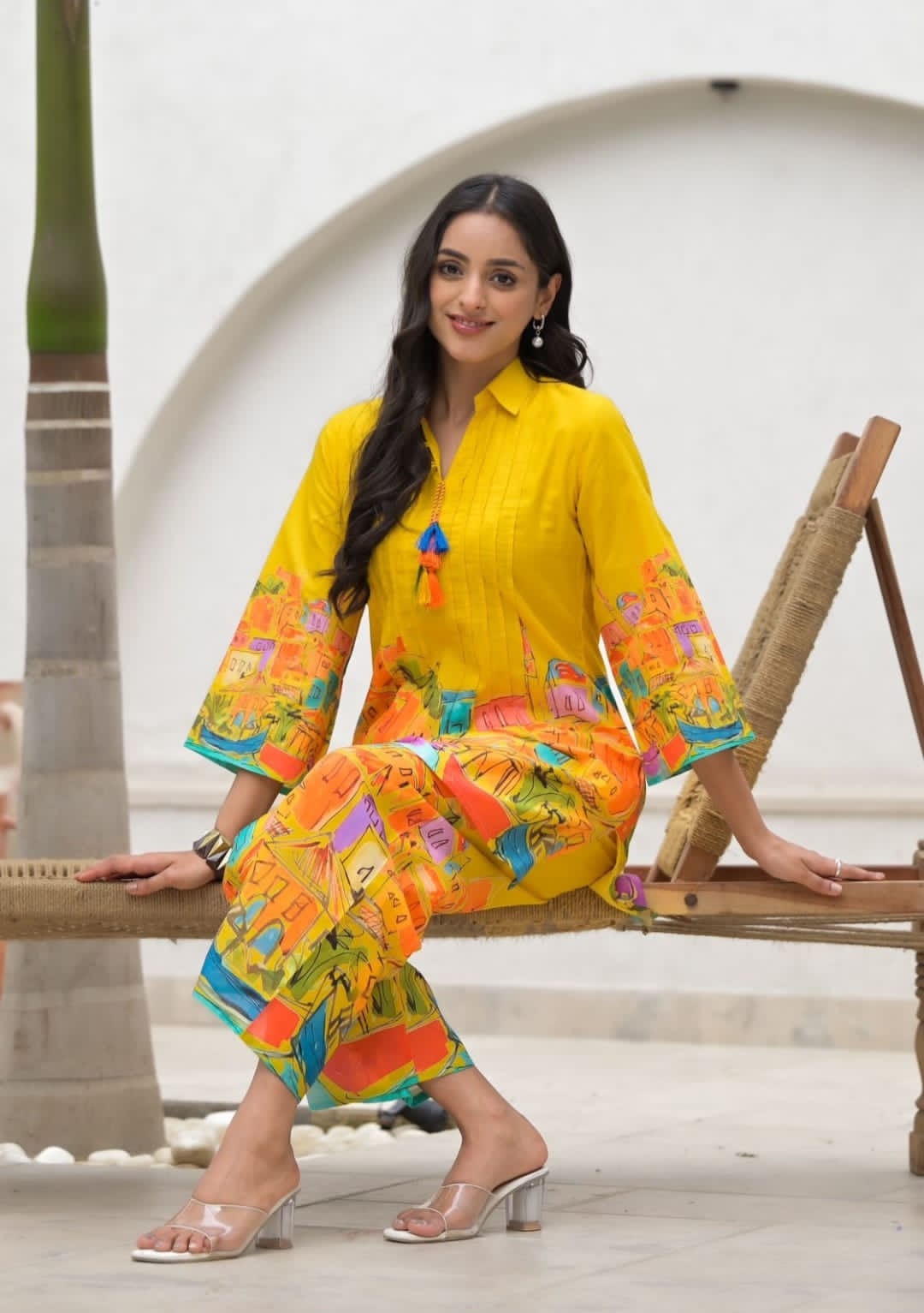 Yellow Printed Kurti Pant Co Ord Set Straight Muslin Party Wear Salwar Kameez Dress (Set of 2)