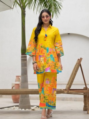 Elevate your wardrobe with this Yellow Printed Kurti Pant Co-Ord Set. Crafted from soft, breathable muslin fabric, the set features a beautifully printed straight-cut kurti paired with a matching pant. Ideal for parties or festive occasions, this elegant salwar kameez ensemble exudes sophistication and comfort. The vibrant yellow hue adds a pop of color, while the stylish design ensures a flattering fit. This set is a must-have for effortless chic style, combining tradition with modern flair. (Set of 2)