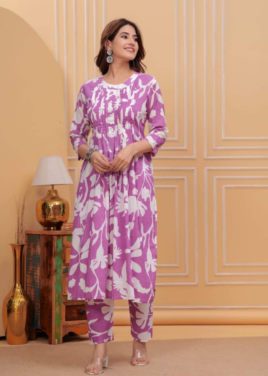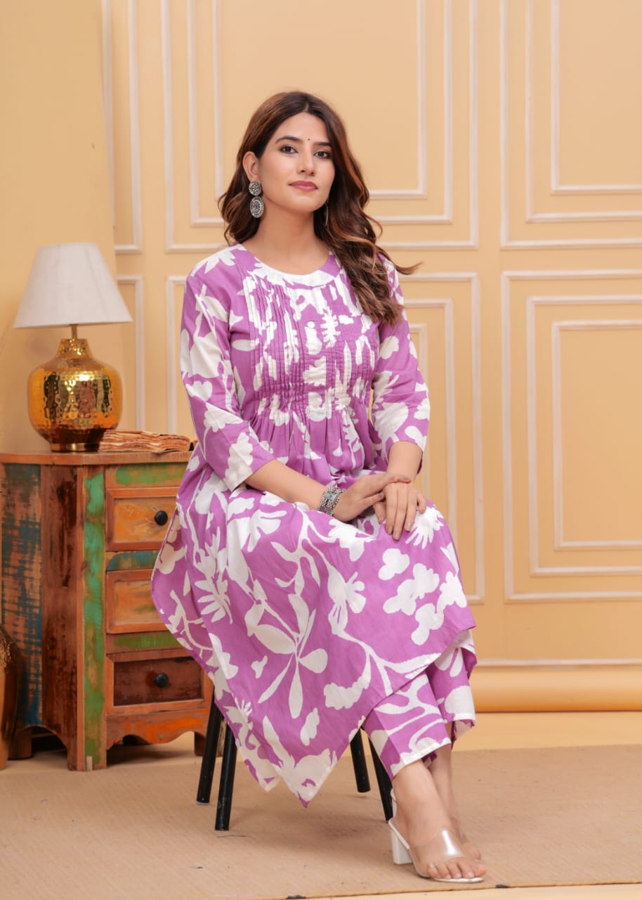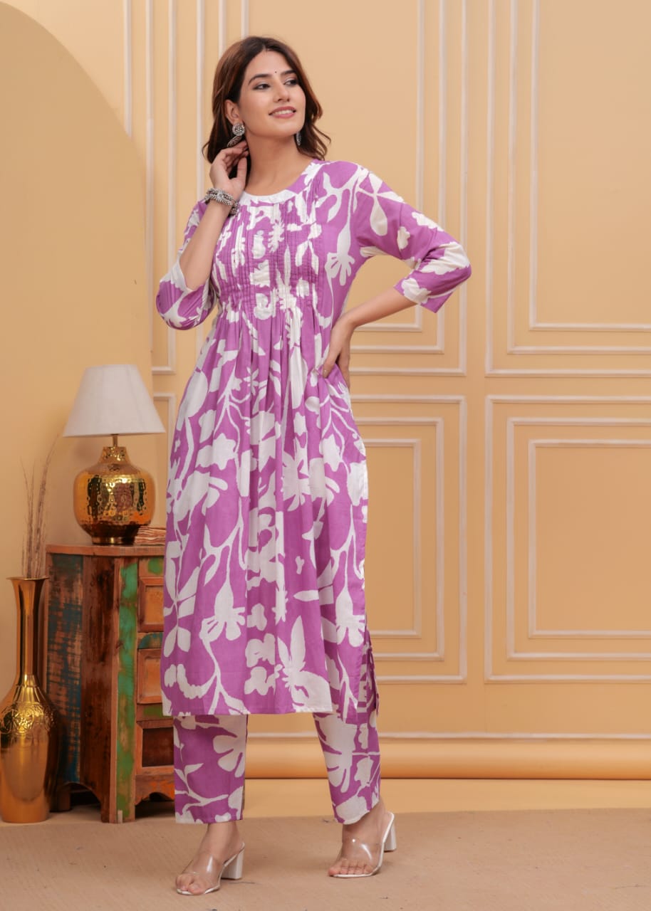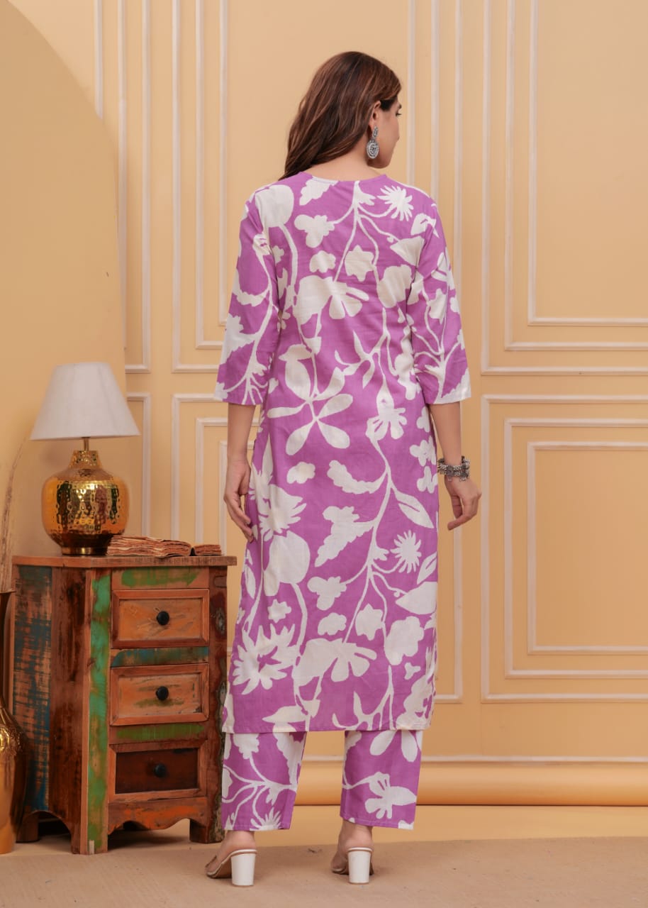Embrace elegance and comfort with this Lavender Floral Printed Kurti Pant Co-Ord Set. Crafted from breathable cotton, this salwar kameez ensemble showcases a delicate floral print that exudes grace and sophistication. The kurti features a simple yet refined design, perfectly paired with coordinated pants for a polished look. Ideal for casual outings, workwear, or festive occasions, this set effortlessly combines style and functionality.