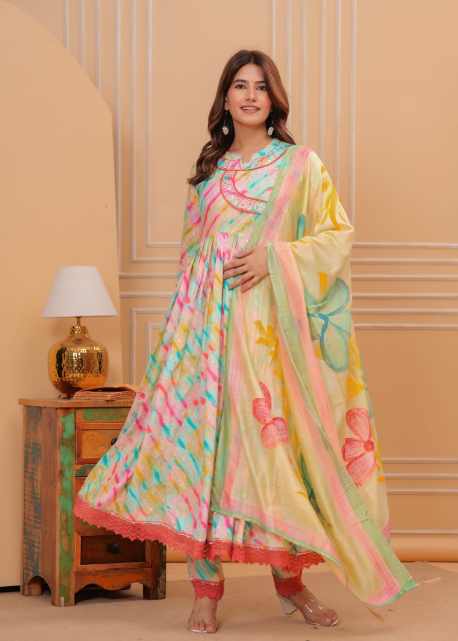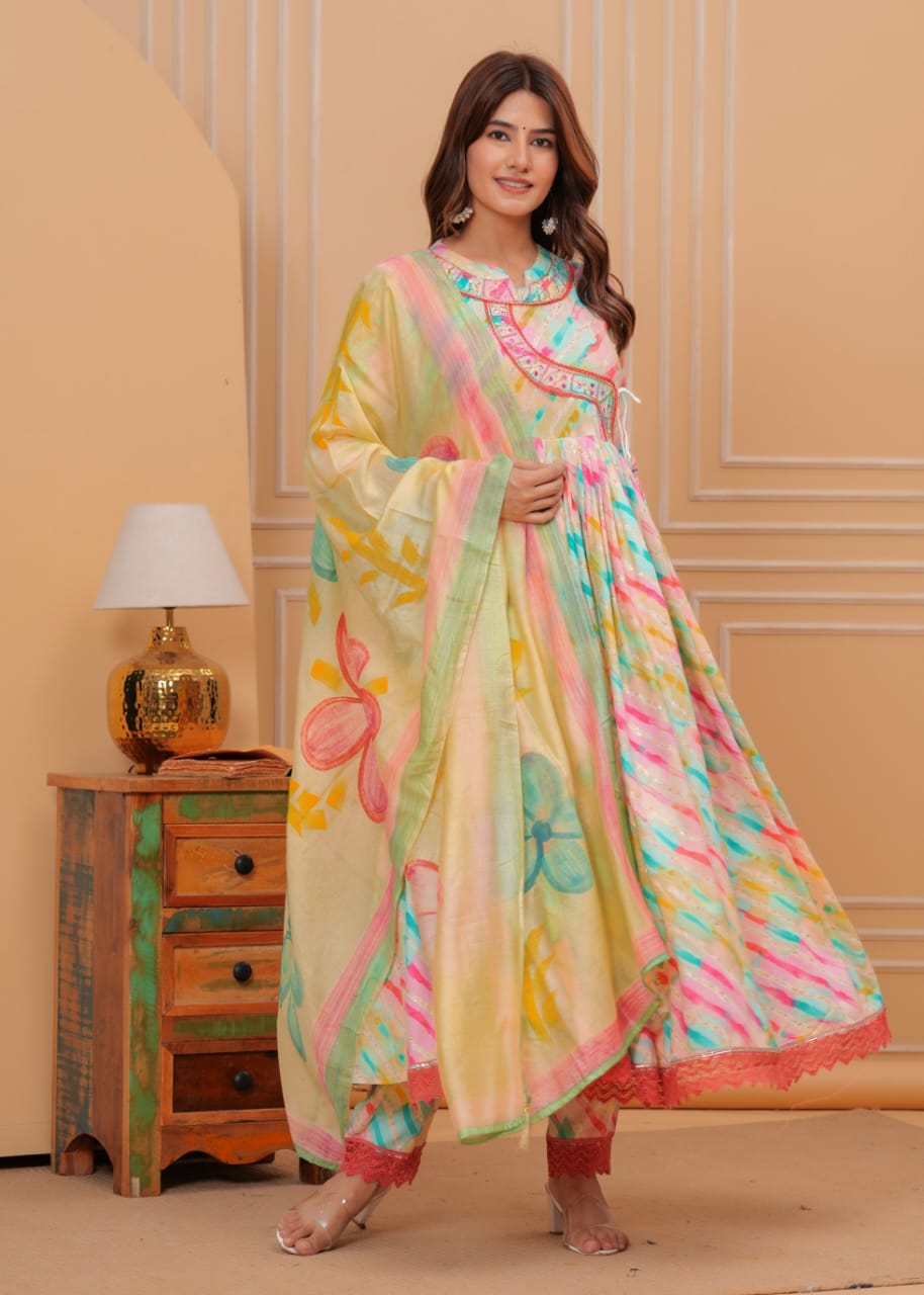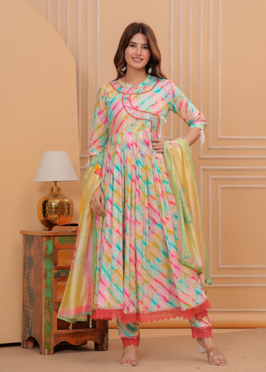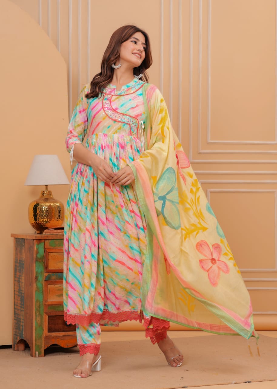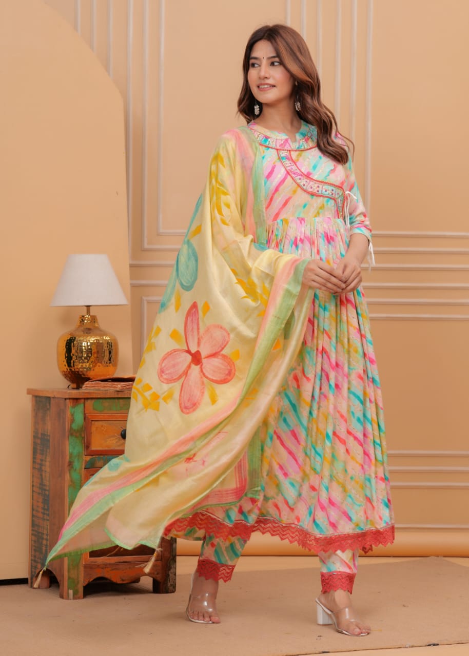 This Yellow Rayon Lehariya Print Angrakha Frock Style Anarkali Kurta Kurti Pant Dupatta Set exudes elegance and charm. Crafted from soft rayon fabric, the Angrakha-style kurta features a mesmerizing Lehariya print and a flattering frock silhouette. Paired with matching pants and a lightweight dupatta, this set is perfect for festive occasions or casual outings. Its vibrant design and comfortable fit make it a must-have addition to your ethnic wardrobe.