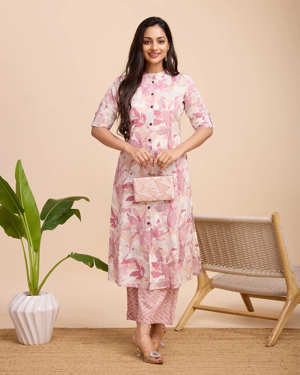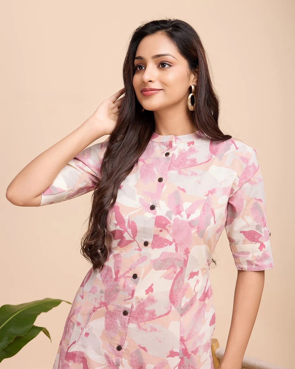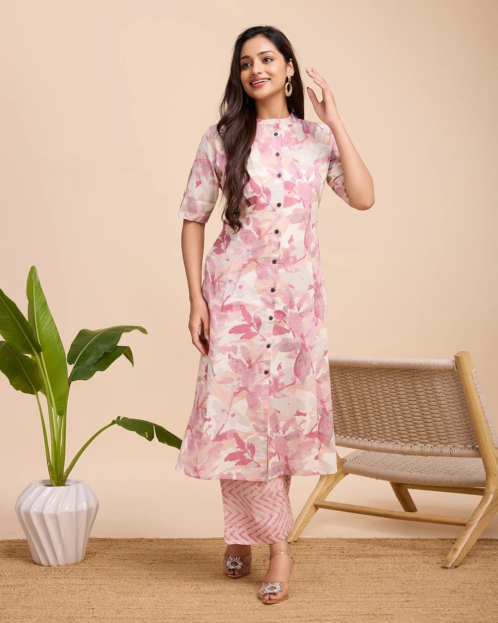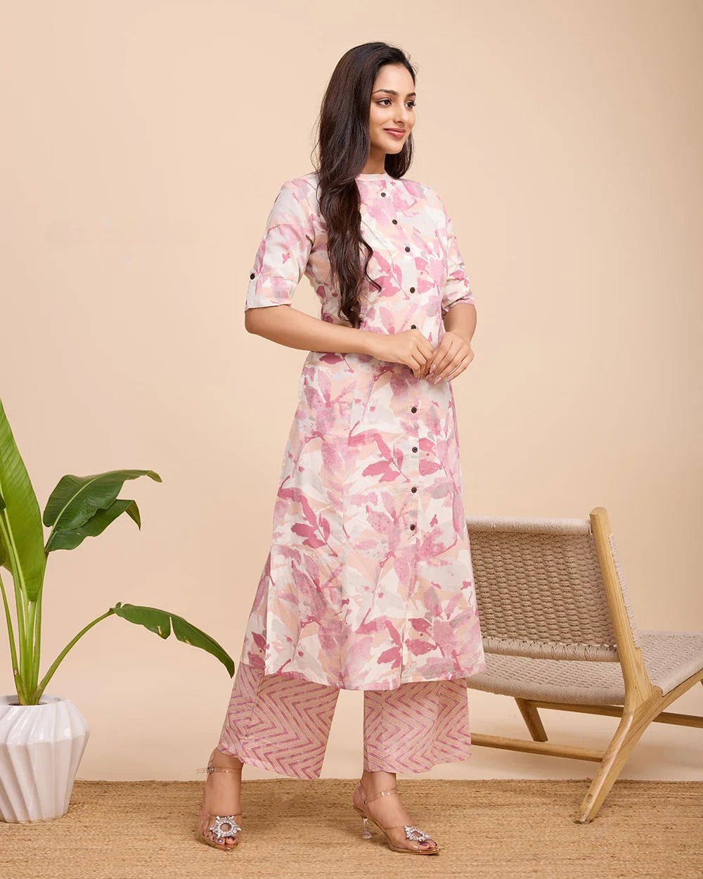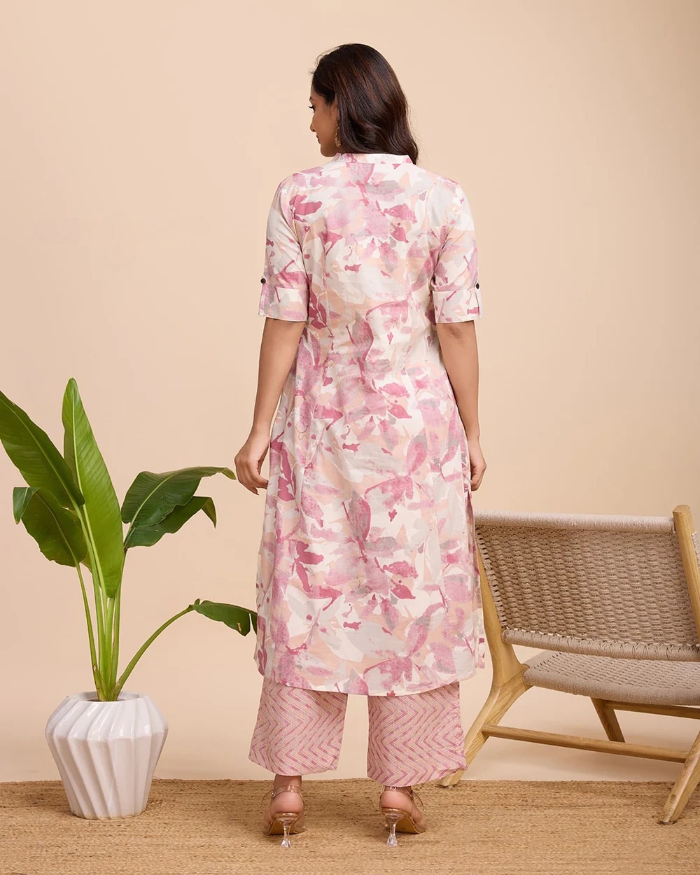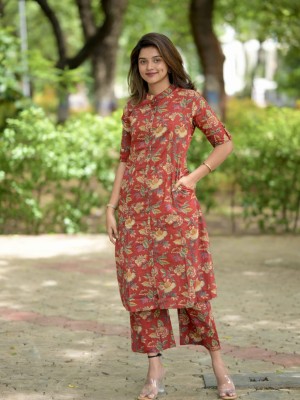 Pastel Cream Color Co Ord Set Floral Printed Indian A line Cotton Salwar Kameez Kurti Pant Co Ord Set