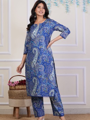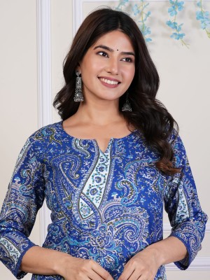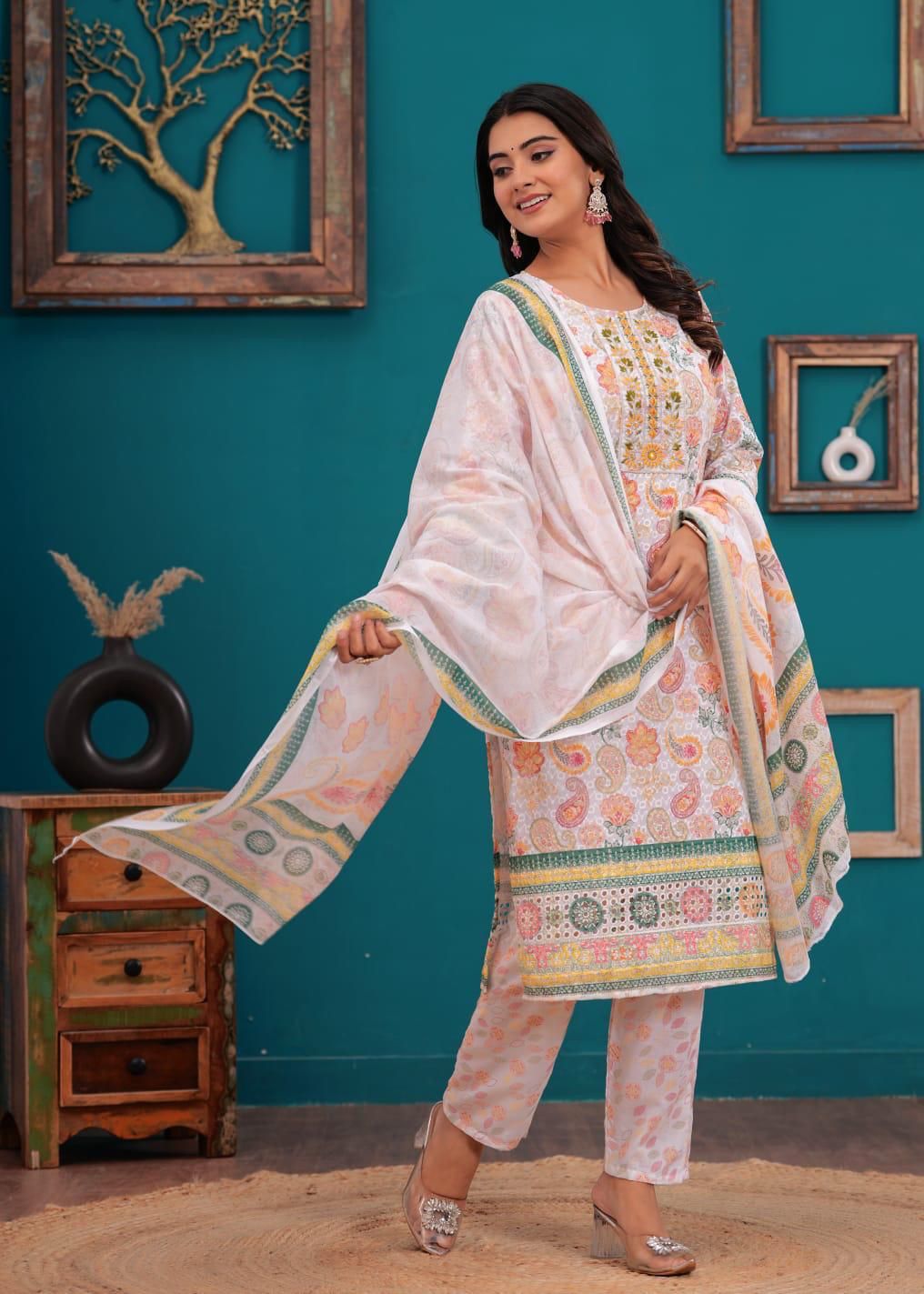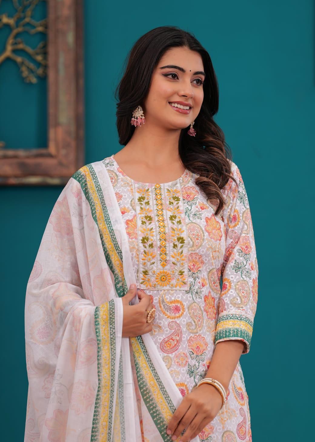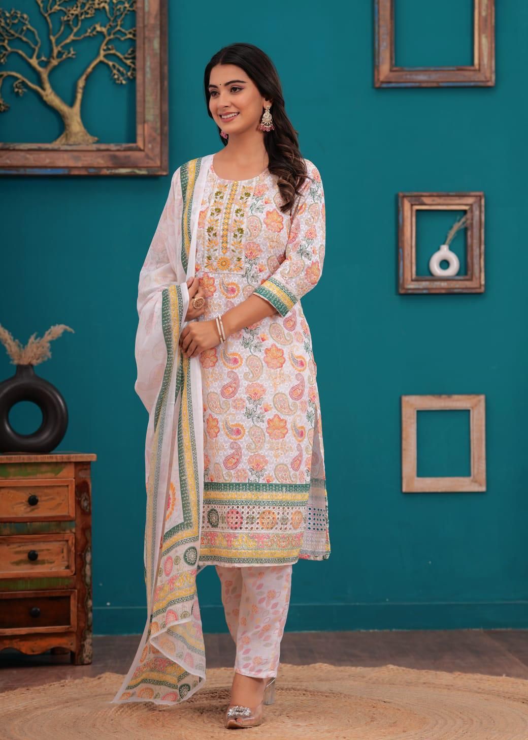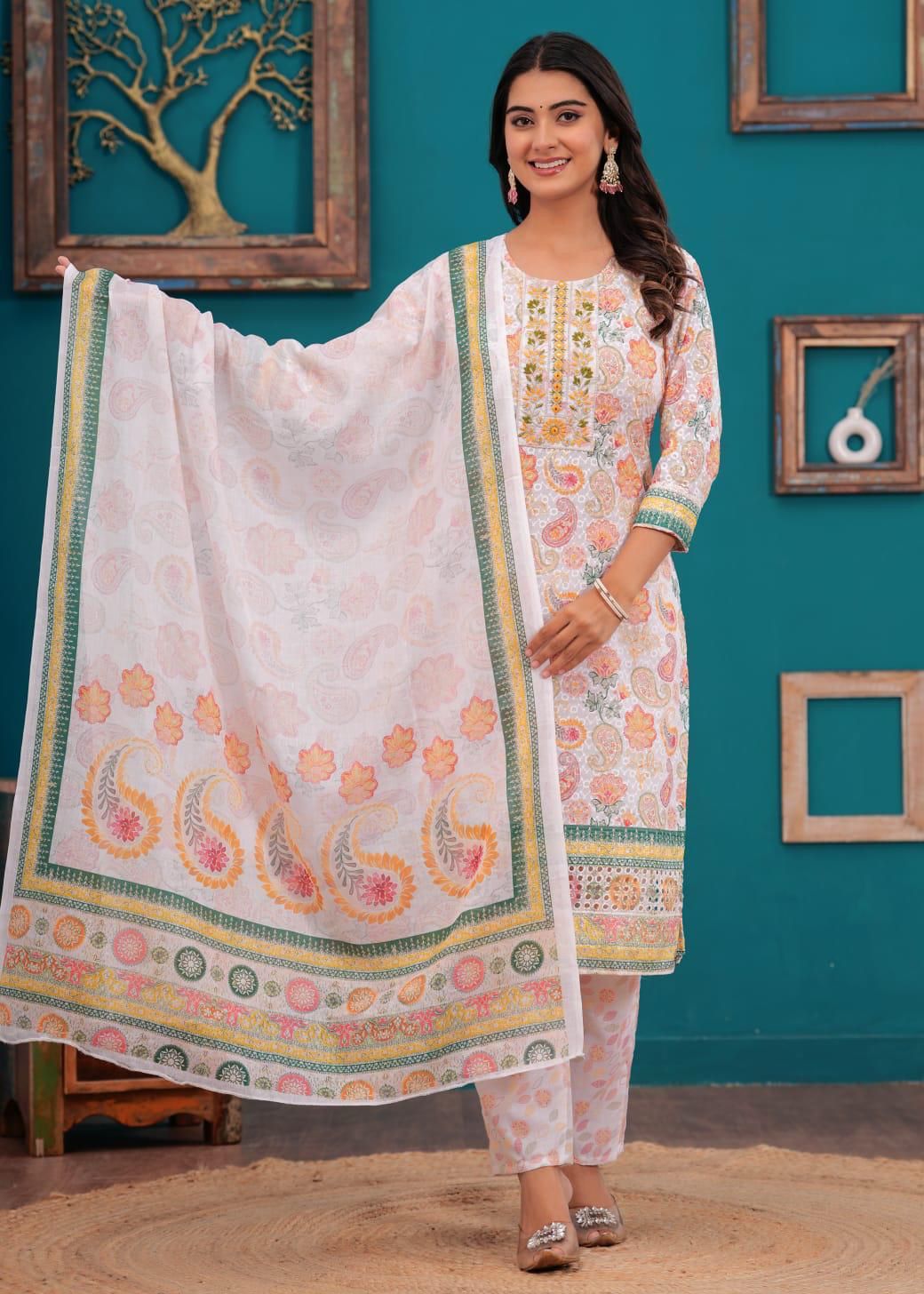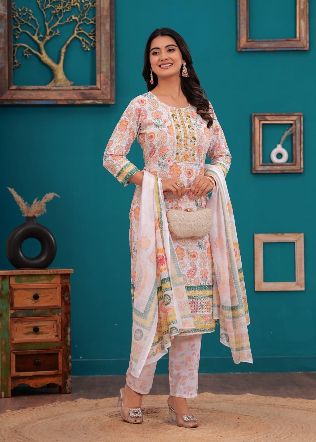 Floral Paisley Printed Indian Chikankari Cotton Straight Salwar Kameez Kurti Pant Set for Women Ethnic Dress