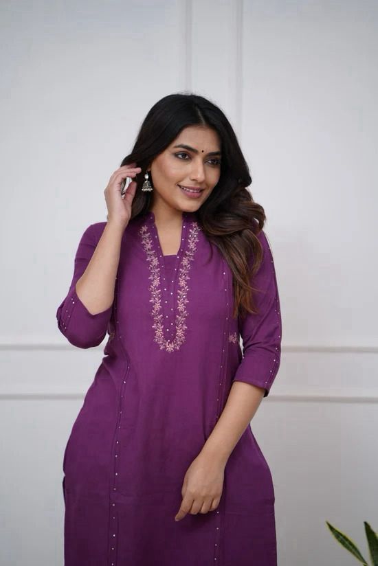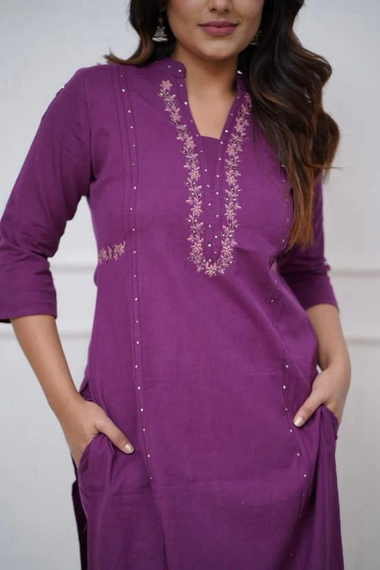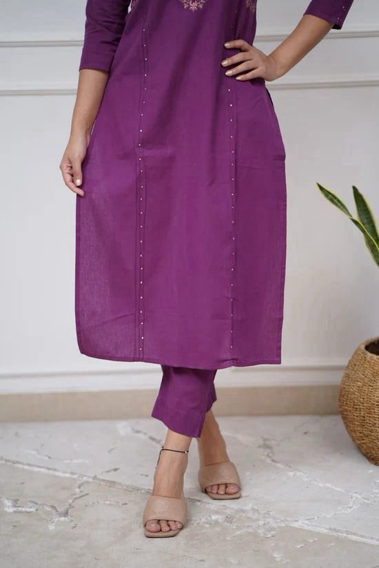 Elevate your ethnic style with this Wine Embroidered Indian Cotton Salwar Kameez Set. The straight-cut kurti features elegant embroidery, paired with matching pants for a chic co-ord look. Crafted from breathable cotton, it ensures all-day comfort while exuding timeless charm. Perfect for festive events, casual outings, or office wear, this stylish set adds grace to any wardrobe.