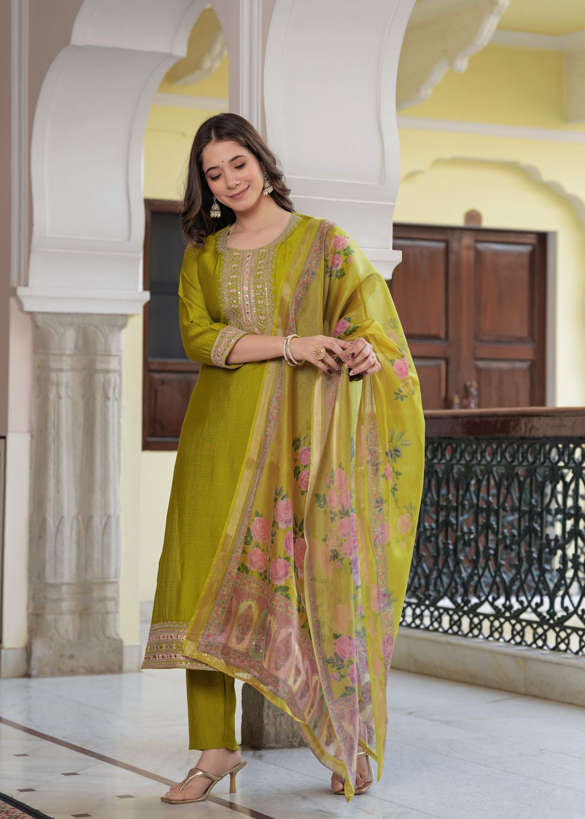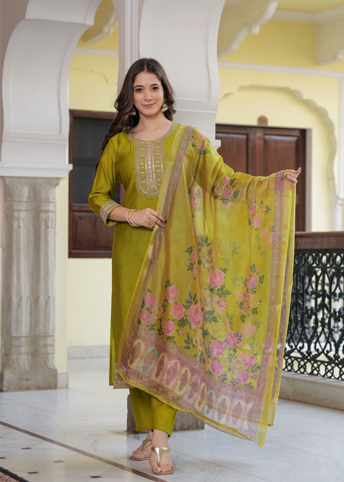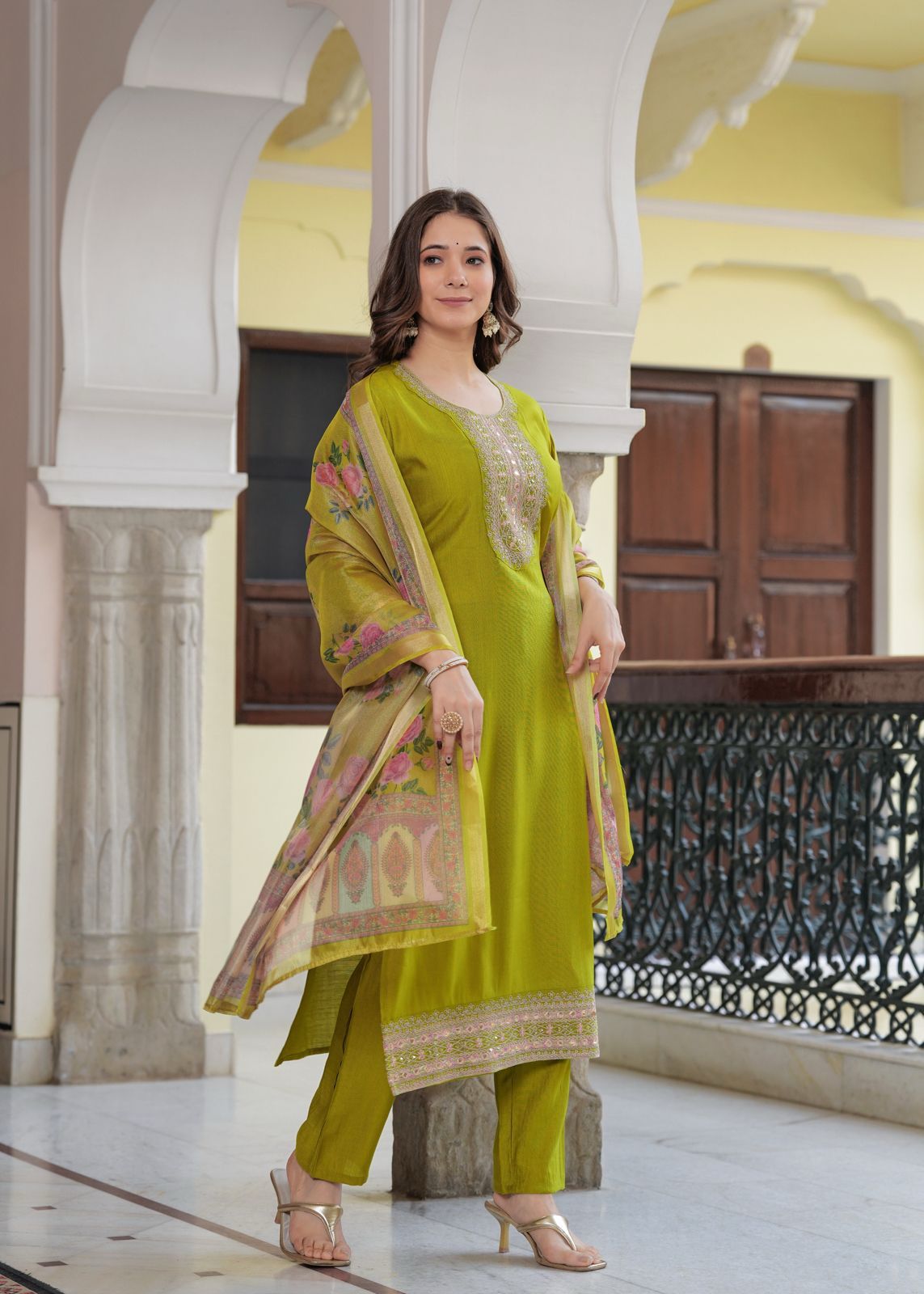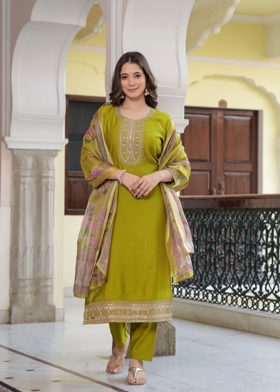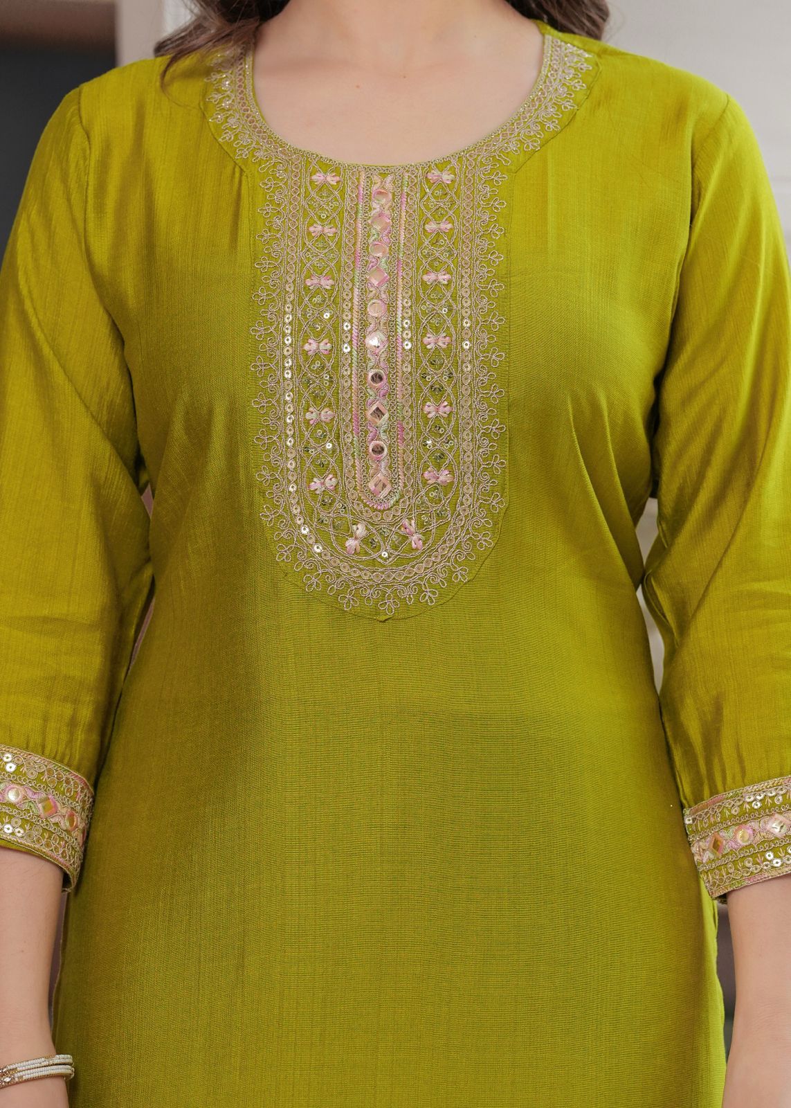 Elevate your ethnic style with this Mehandi Green Indian Rayon Straight Embroidered Salwar Kameez Kurti Pant Dupatta Set for Women. Crafted from premium rayon fabric, the straight-cut kurti features elegant embroidery, adding a touch of sophistication. Paired with comfortable matching pants and a beautiful dupatta, this set is perfect for festive celebrations, casual outings, or family gatherings. Its stylish design and comfortable fit make it a must-have addition to your wardrobe for a timeless ethnic look.