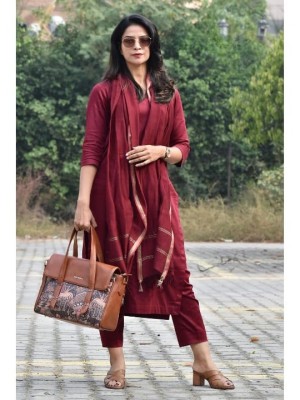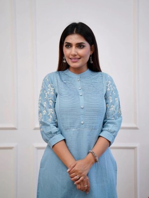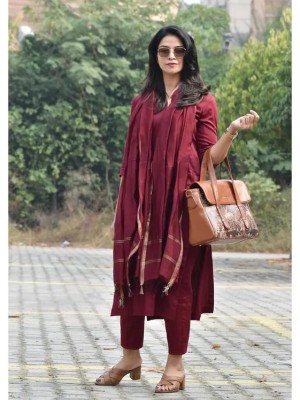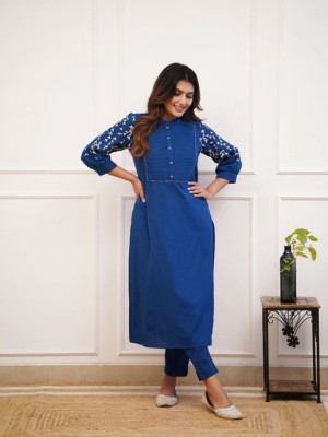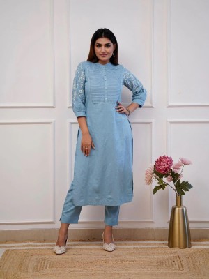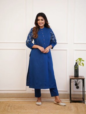 Gulabi City's this Trisha solid tone straight-fit rayon kurta features a mandarin neckline with a button detailing on designer pleats on yoke and three-quarter sleeves, this style features matching pant. This is Adorned with leaves embroidered on sleeves, this elegant style is ideal for light festivities.
