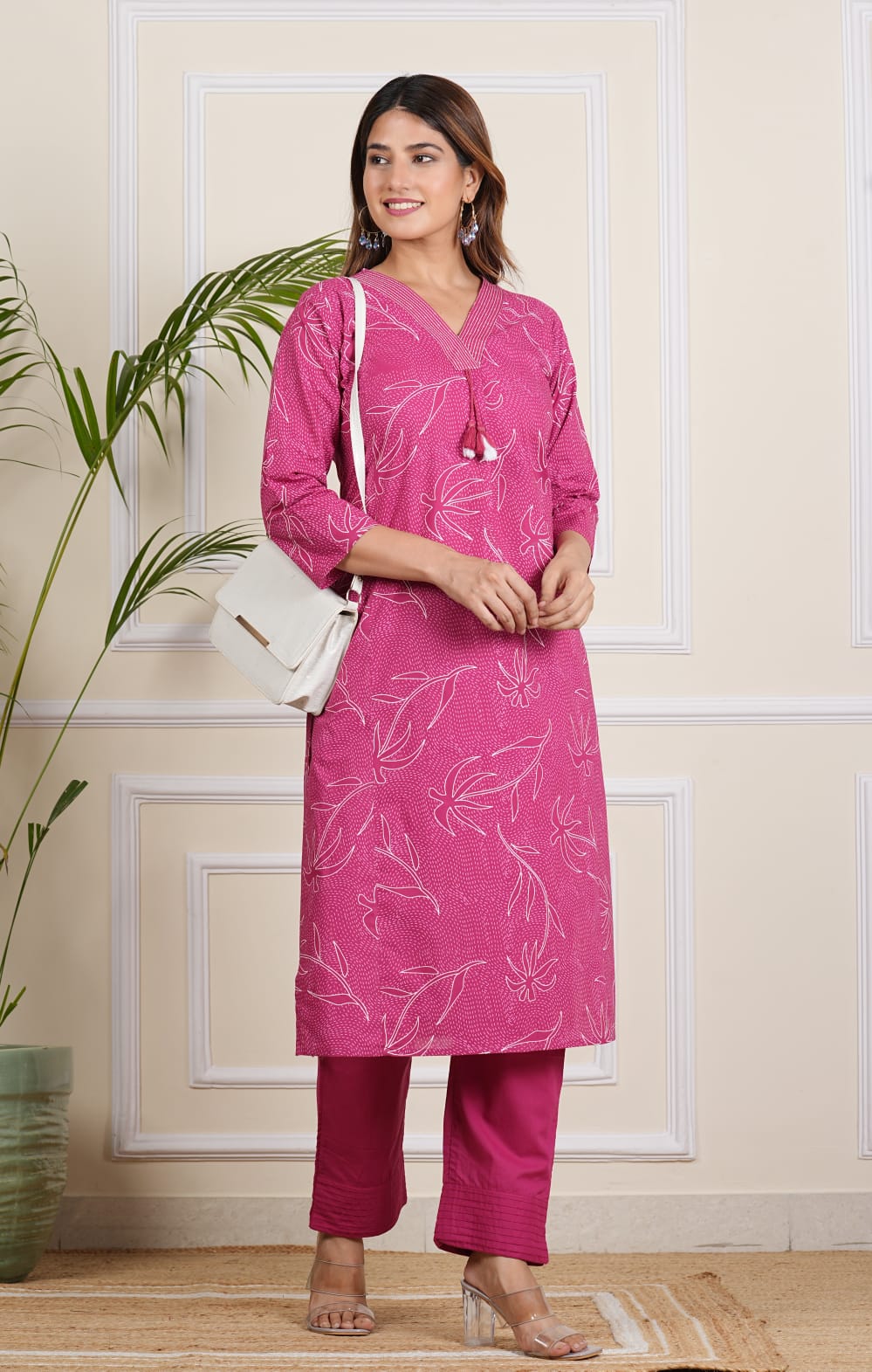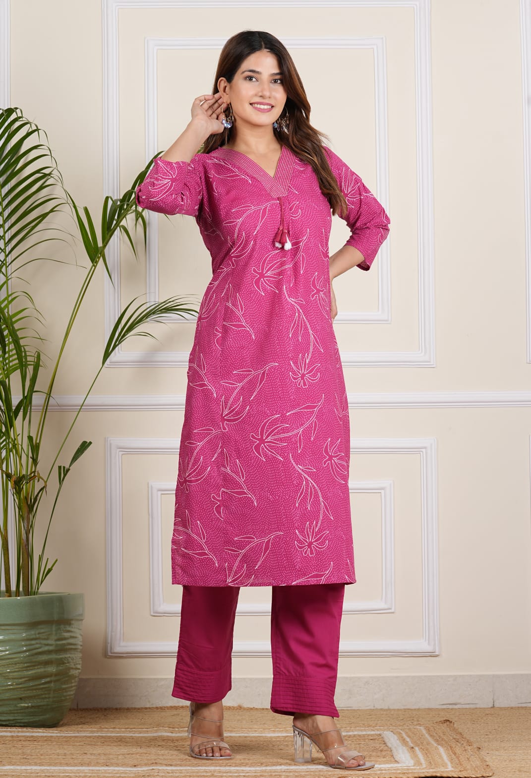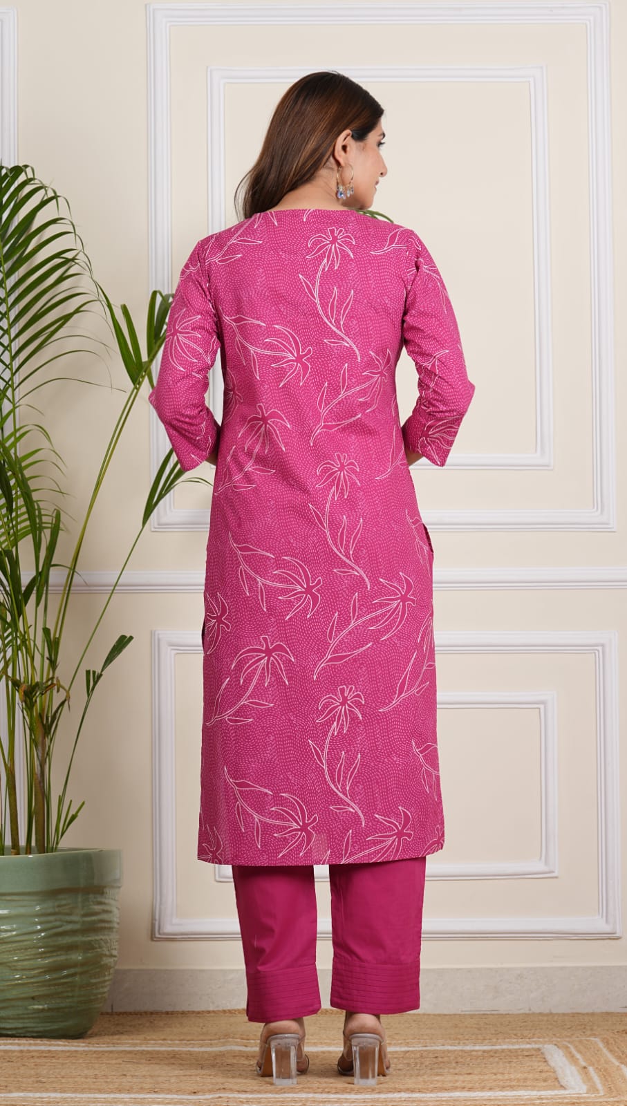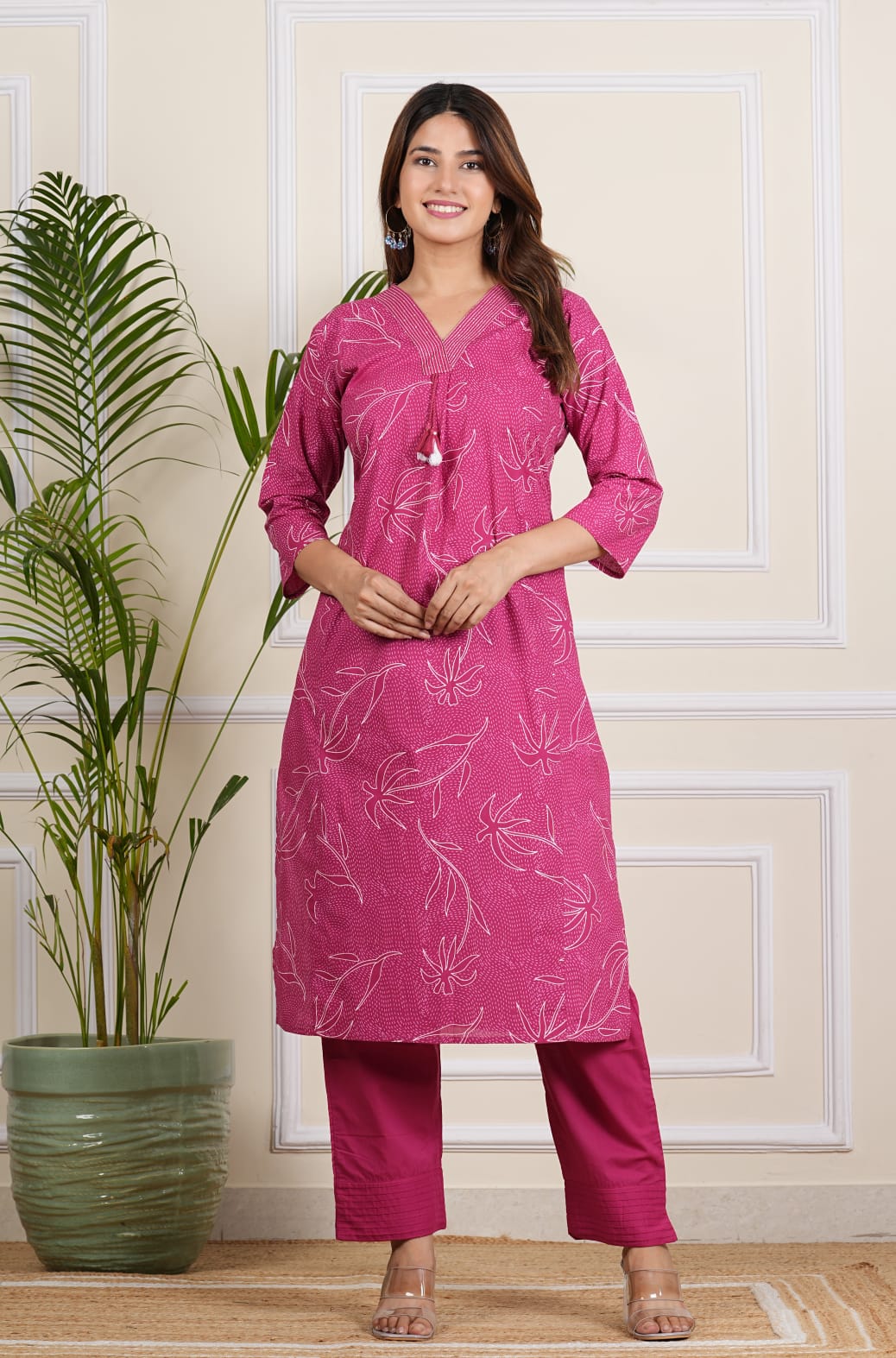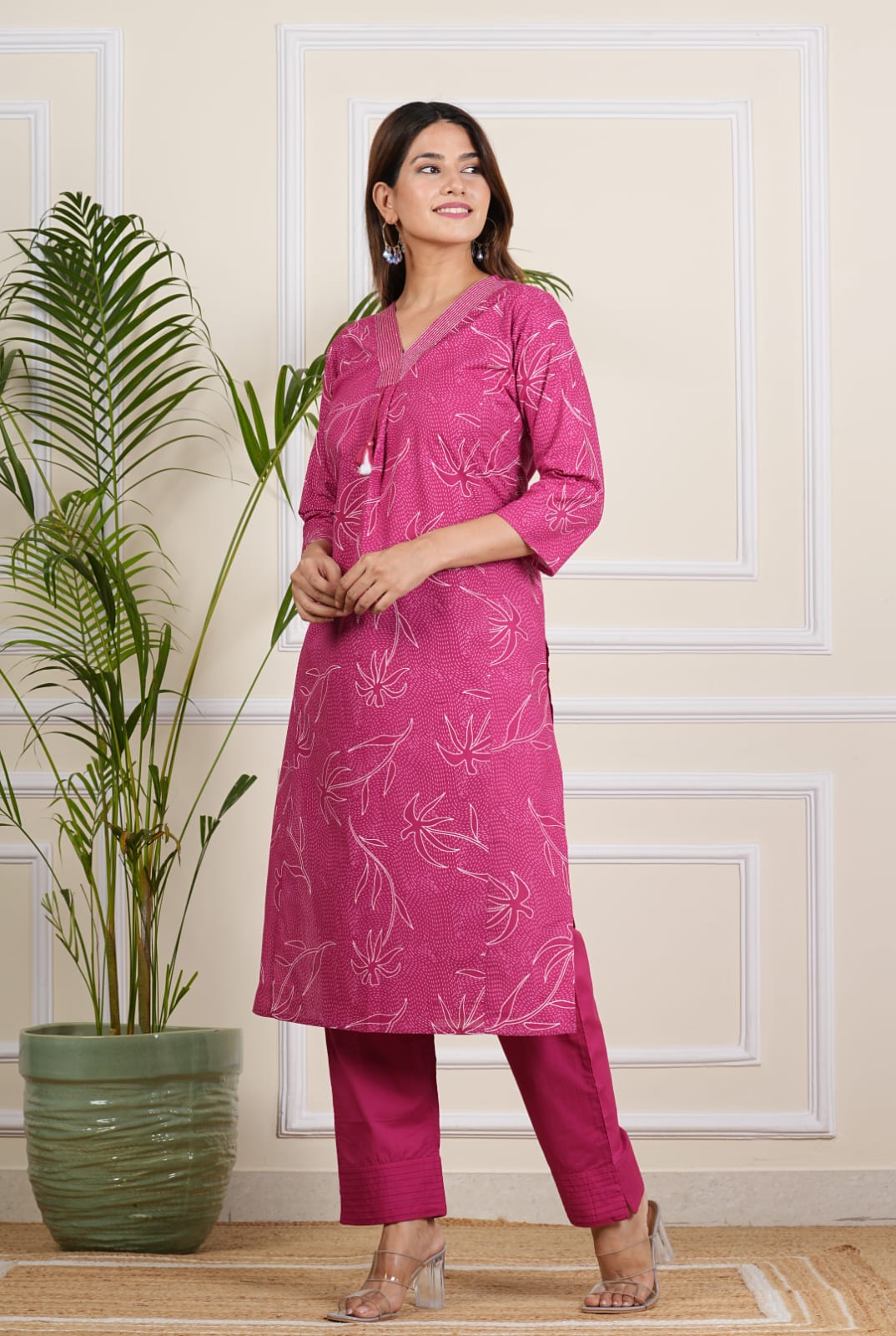 Elevate your style with our Pink Floral Kurti Pant Set. This co-ord set features a straight-cut kurti with floral print, crafted from soft, breathable cotton. The pant includes a pocket for additional convenience. Paired with matching pants, this set seamlessly blends traditional charm with modern functionality. Perfect for casual wearings, it ensures comfort and elegance, making it a versatile addition to your wardrobe.