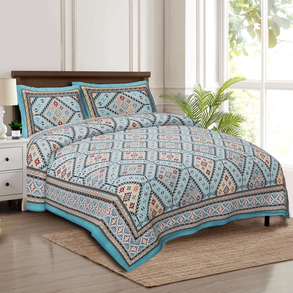 Multi Color Ajrakh Print Cotton Multi Color Printed Bed Sheet with 2 Pillow Covers - for King Size Bed
