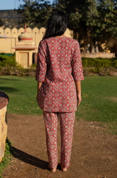 Experience the perfect blend of comfort and style with our Geometric Ajrakh Print Night suit. Crafted from high-quality cotton, this PJ features a top with 3/4 sleeves and pants, both adorned with striking geometric prints. Ideal for lounging at home or enjoying a casual meal with family, this pyjama adds a touch of elegance to your relaxation. Make it a staple in your wardrobe for ultimate comfort and timeless style.