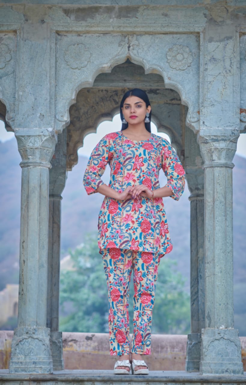 Elevate your relaxation with our Cotton Lounge Wear. Featuring a delightful Cream hue, this PJ is adorned with a charming floral print on a serene Pastel base. Crafted from premium cotton, it ensures unparalleled comfort and style. Ideal for lounging at home or casual outings, this night suit adds a touch of elegance to your everyday wear. Embrace the perfect blend of relaxation and sophistication with this beautiful ensemble.