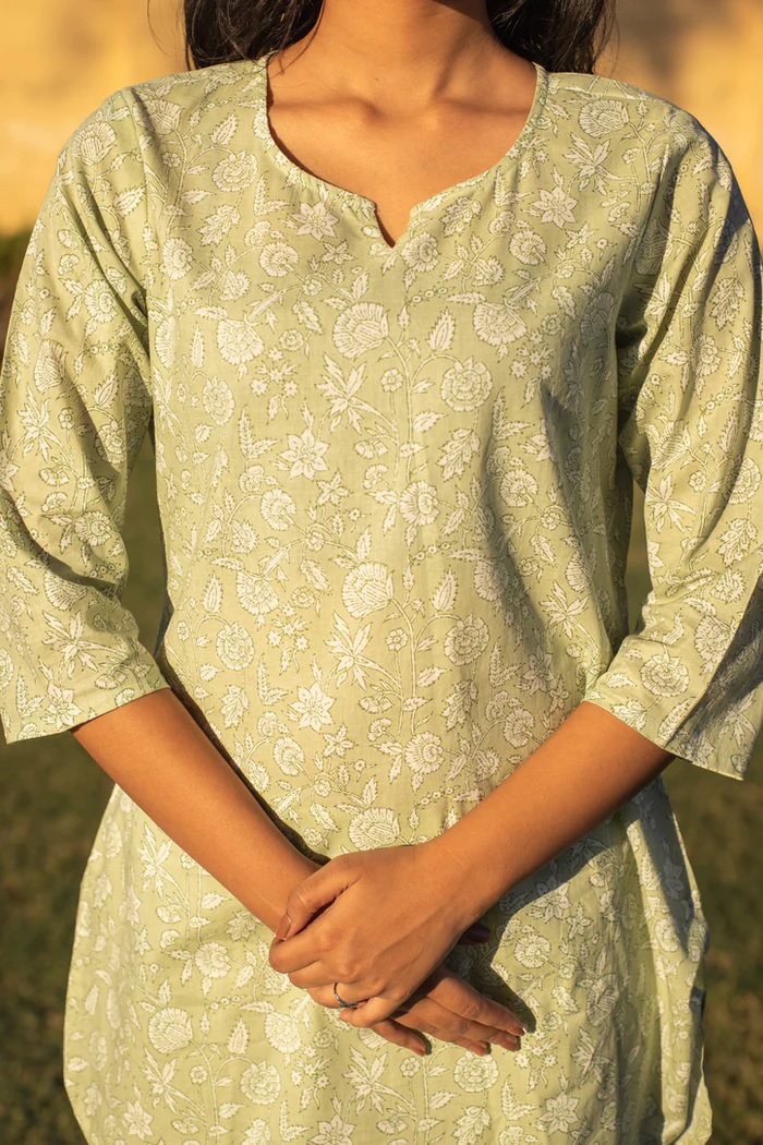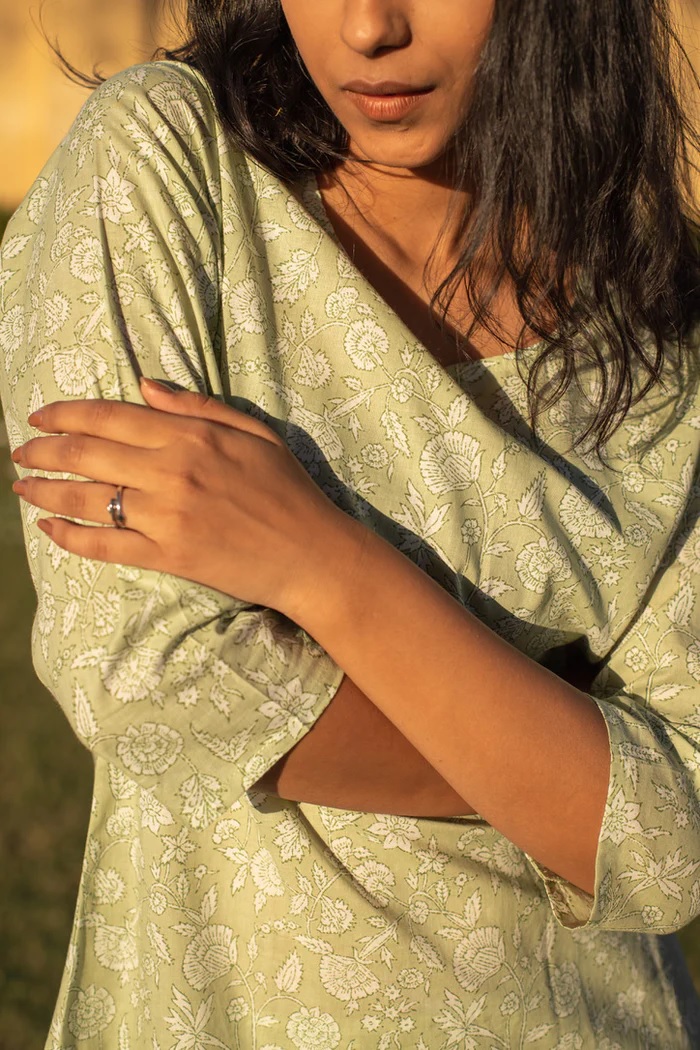 Light Green Floral Block Print Lounge Wear Night Suit Dress Co Ord PJ Set for Summer Night Pyjama