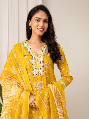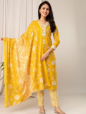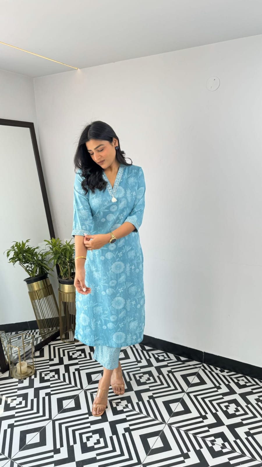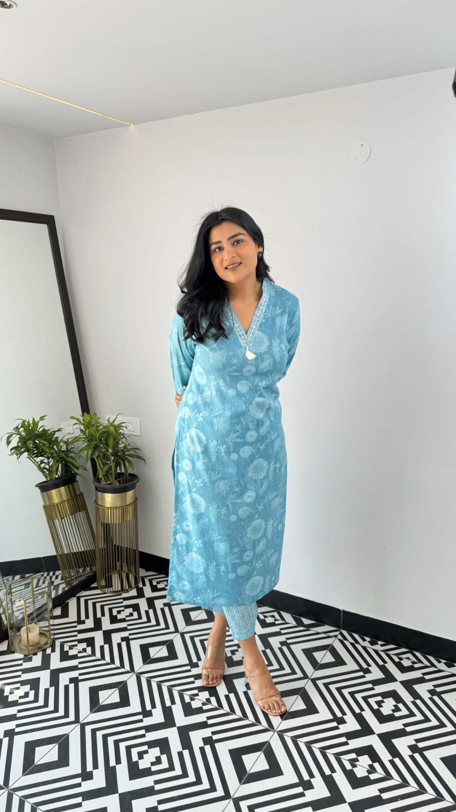 Brighten up your wardrobe with our Blue Floral V-Neck Straight Salwar Kameez Kurti Pant Set. This Indian traditional ensemble features a beautiful V-neck kurti adorned with vibrant floral prints, exuding a lively and elegant appeal. The straight-cut silhouette ensures a flattering fit, while the soft and breathable fabric keeps you comfortable throughout the day. Paired with matching pants, this set is perfect for festive occasions, casual outings, or office wear. The charming floral design and cheerful yellow hue bring a touch of freshness to your look. Style it with ethnic jewelry and sandals to complete your effortless, elegant appearance.