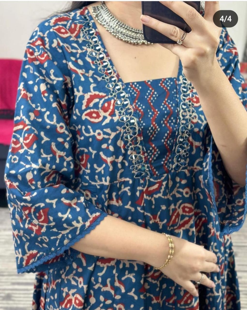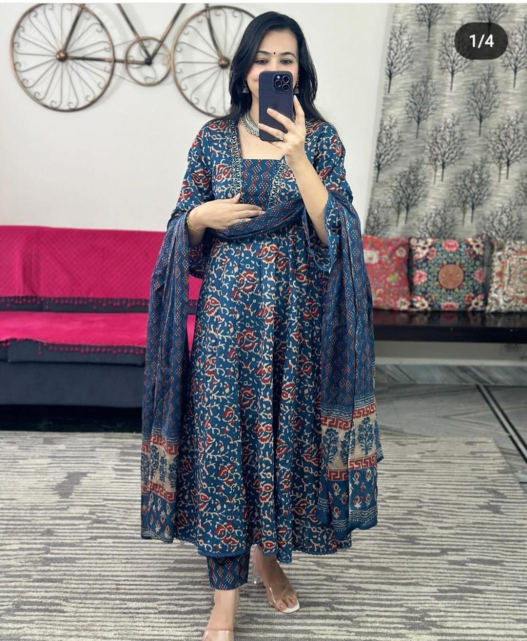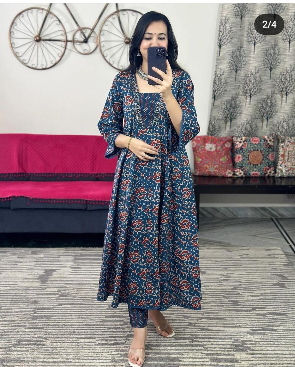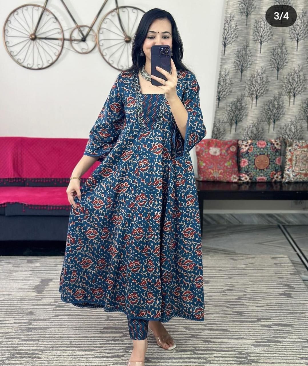 Blue & Green Floral Anarkali Frock Style Designer Salwar Kameez Kurta Kurti Pant Dupatta Set Gown Dress