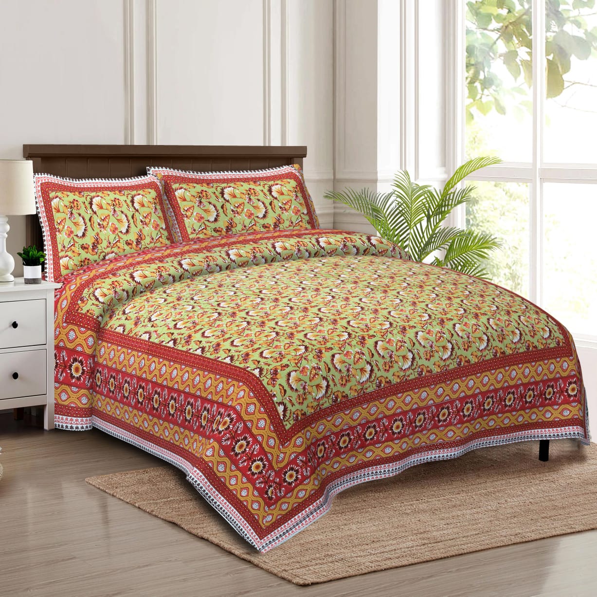 Attractive Floral Block Print Cotton Bed Sheet with 2 Pillow Covers - for King Size Bed