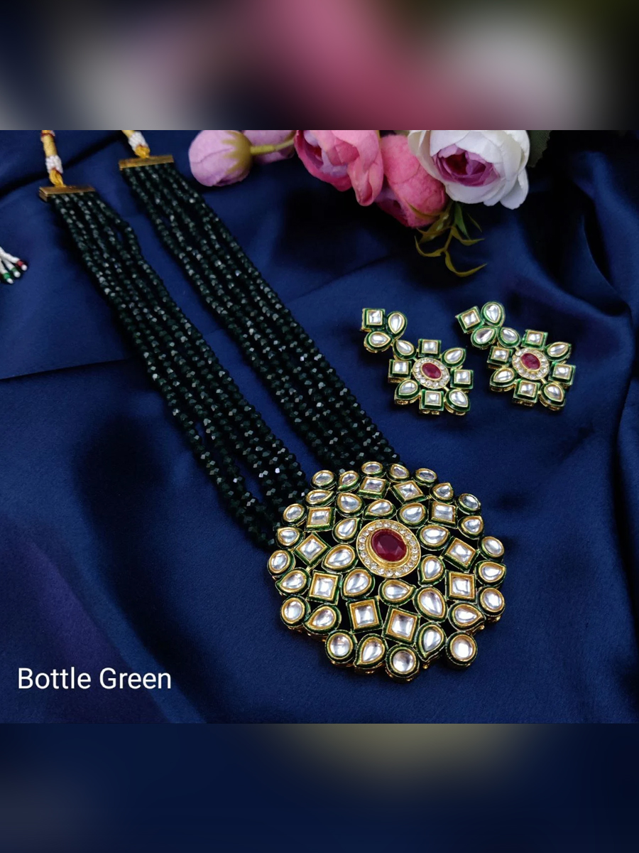Bottle Green Attractive Indian Bollywood Style Gold Plated Kundan Long Pendent Bridal Jewelry Necklace Earring Set