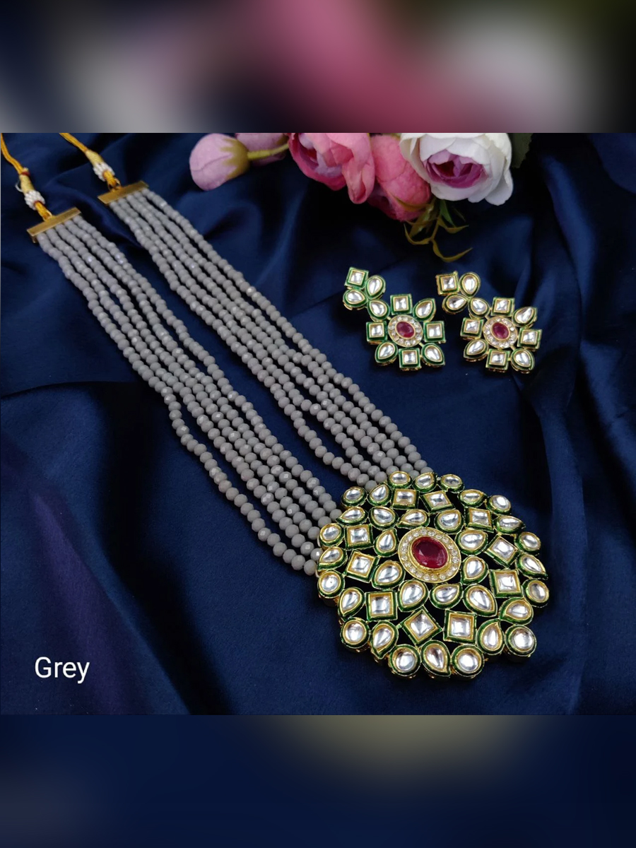 Grey Attractive Indian Bollywood Style Gold Plated Kundan Long Pendent Bridal Jewelry Necklace Earring Set