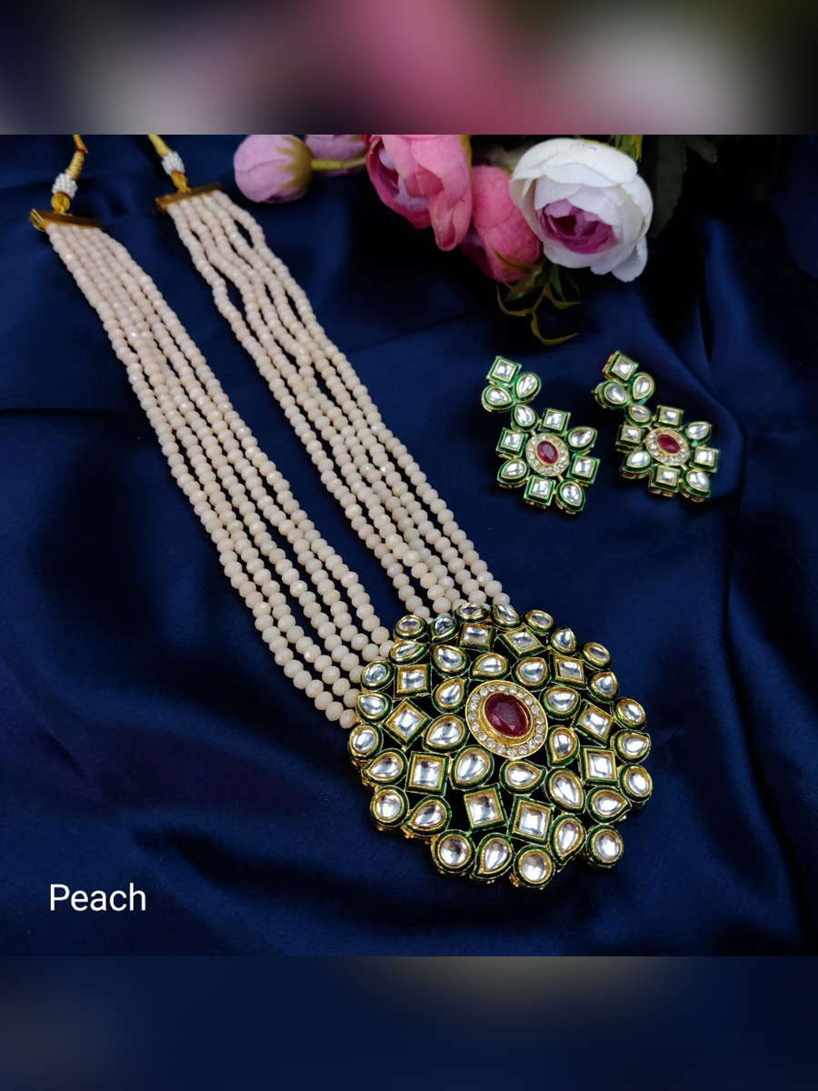 Peach Attractive Indian Bollywood Style Gold Plated Kundan Long Pendent Bridal Jewelry Necklace Earring Set