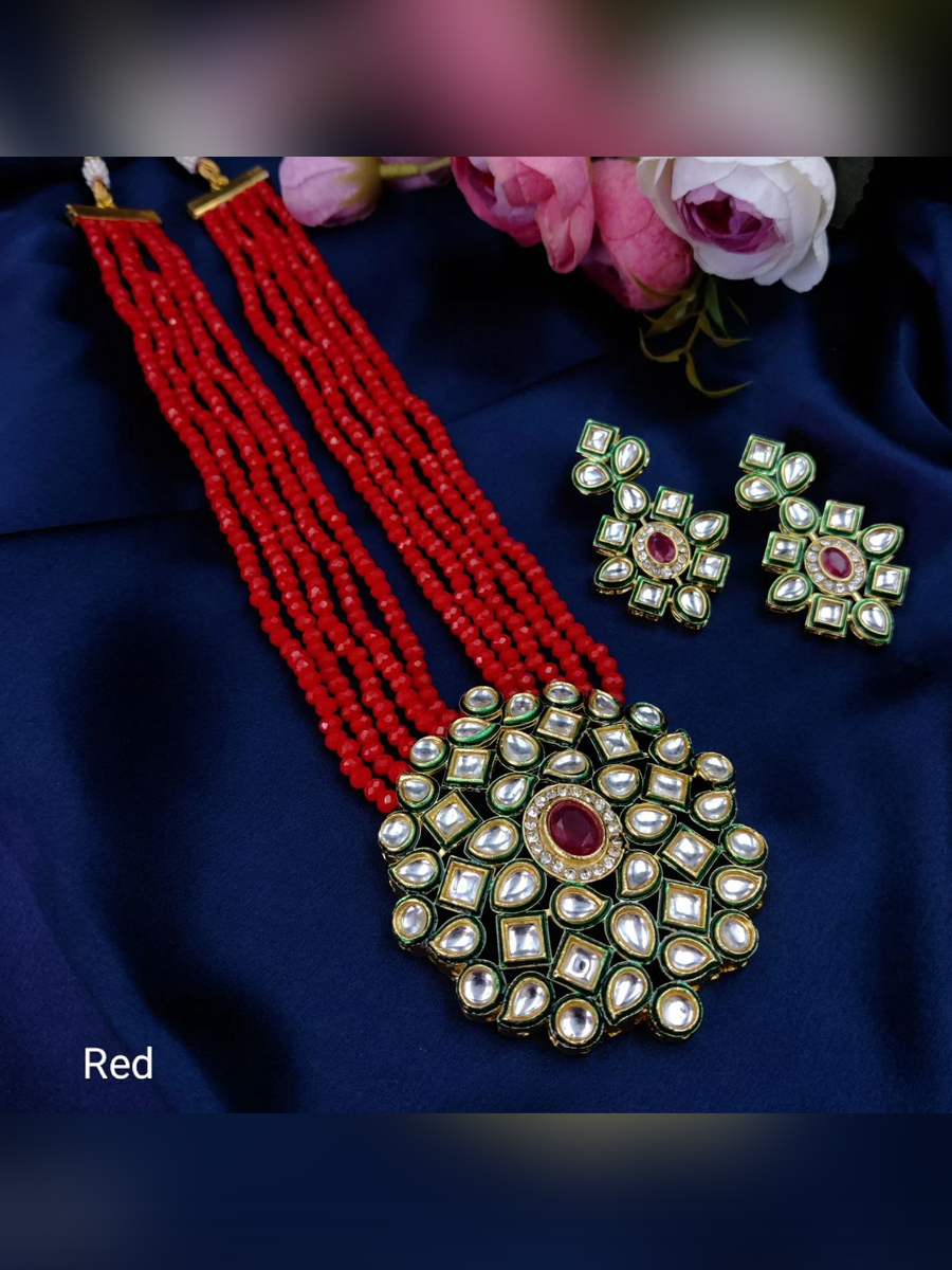 Red Attractive Indian Bollywood Style Gold Plated Kundan Long Pendent Bridal Jewelry Necklace Earring Set
