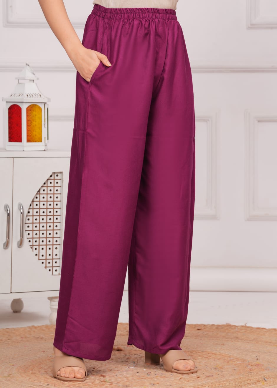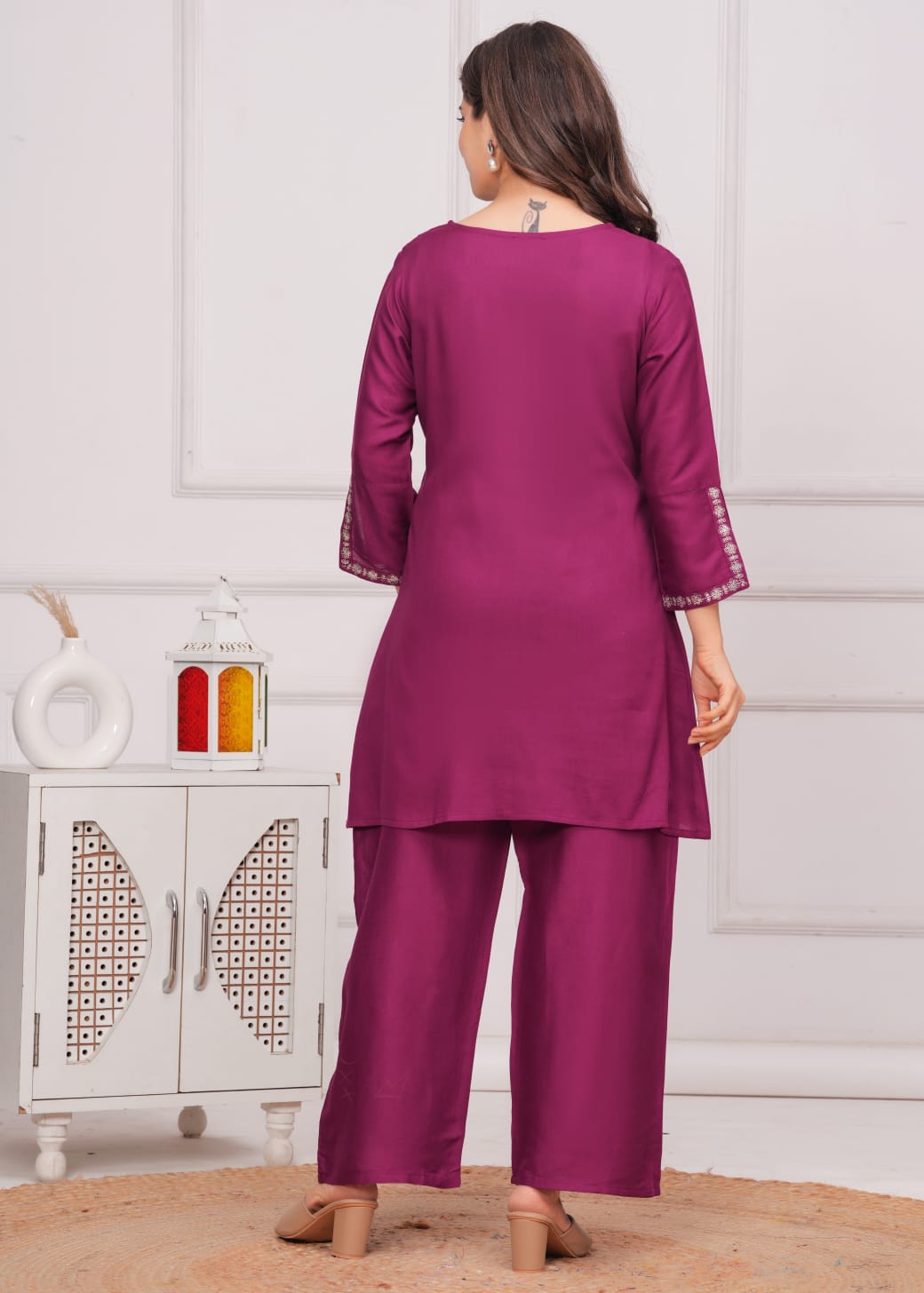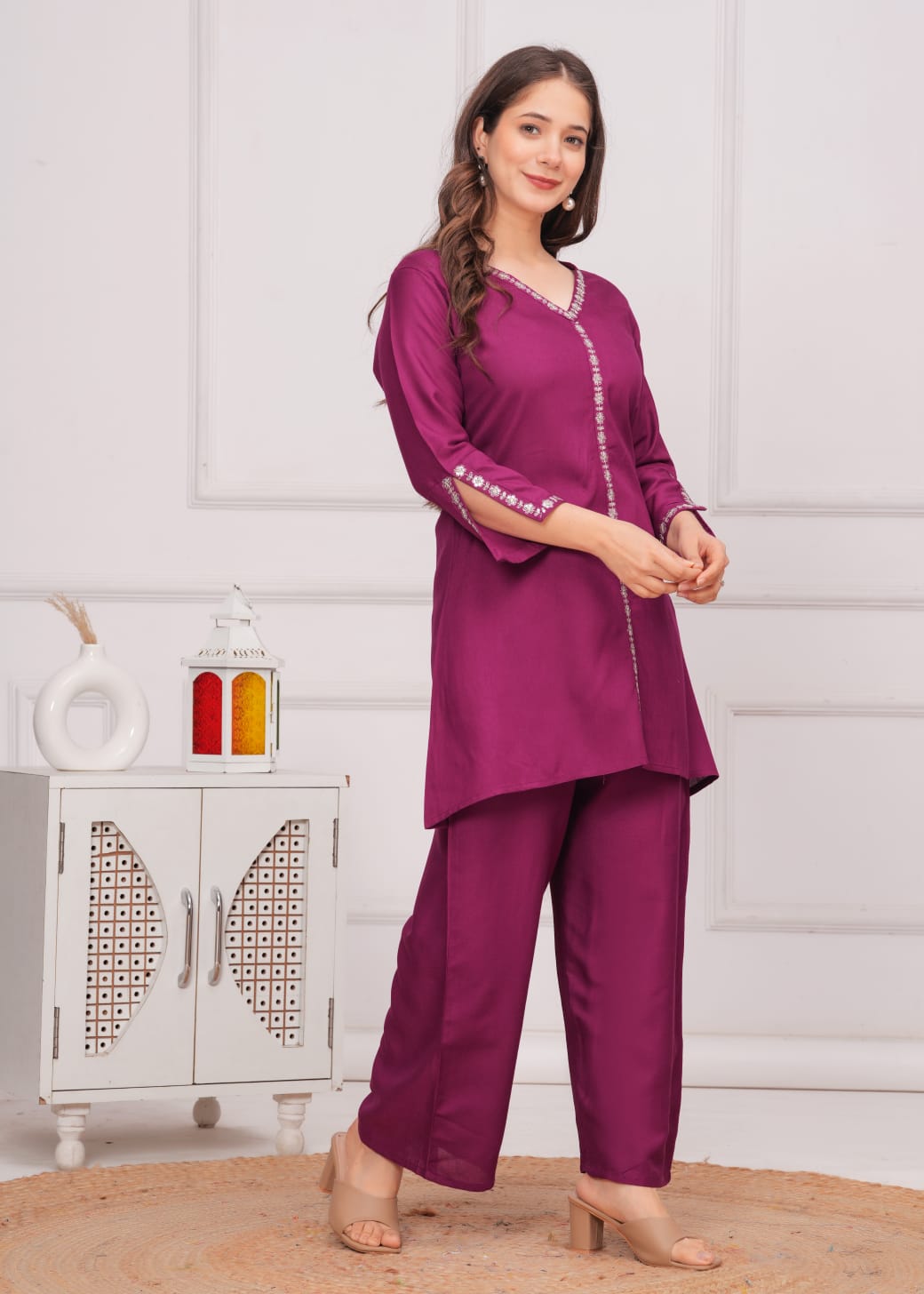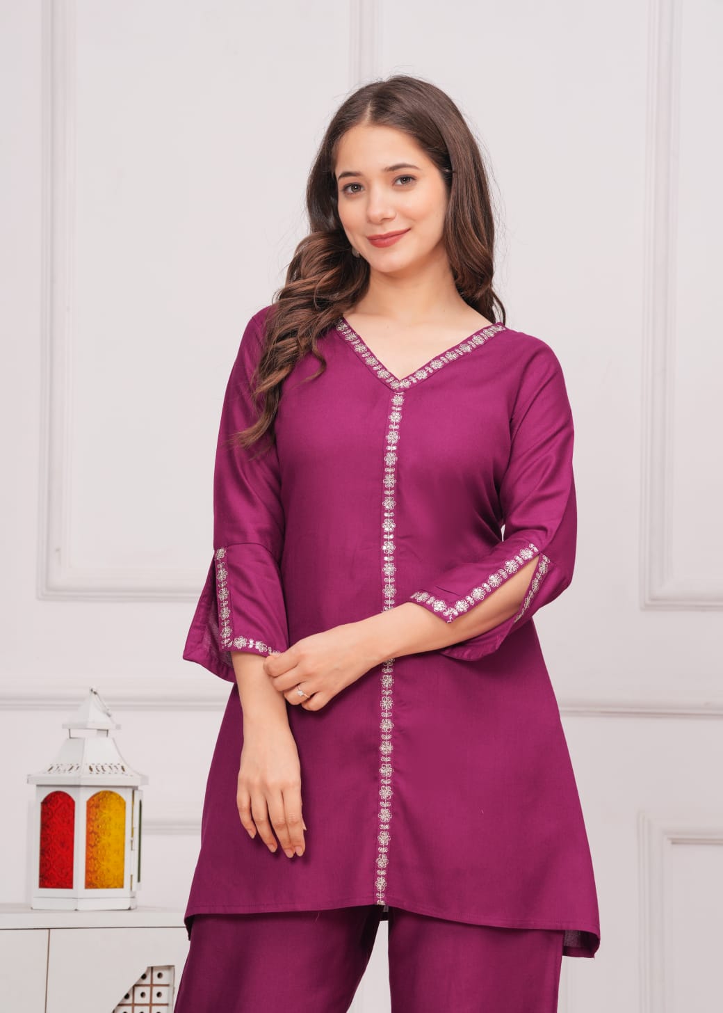 Magenta Pink Solid V-Neck Co Ord Set Kurti Pant Pakistani Readymade Embroidery Set for Women