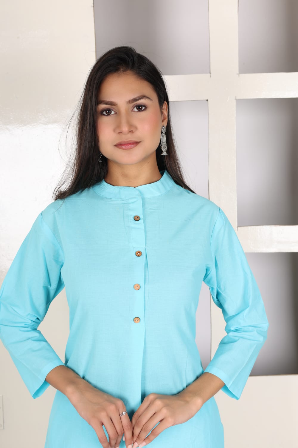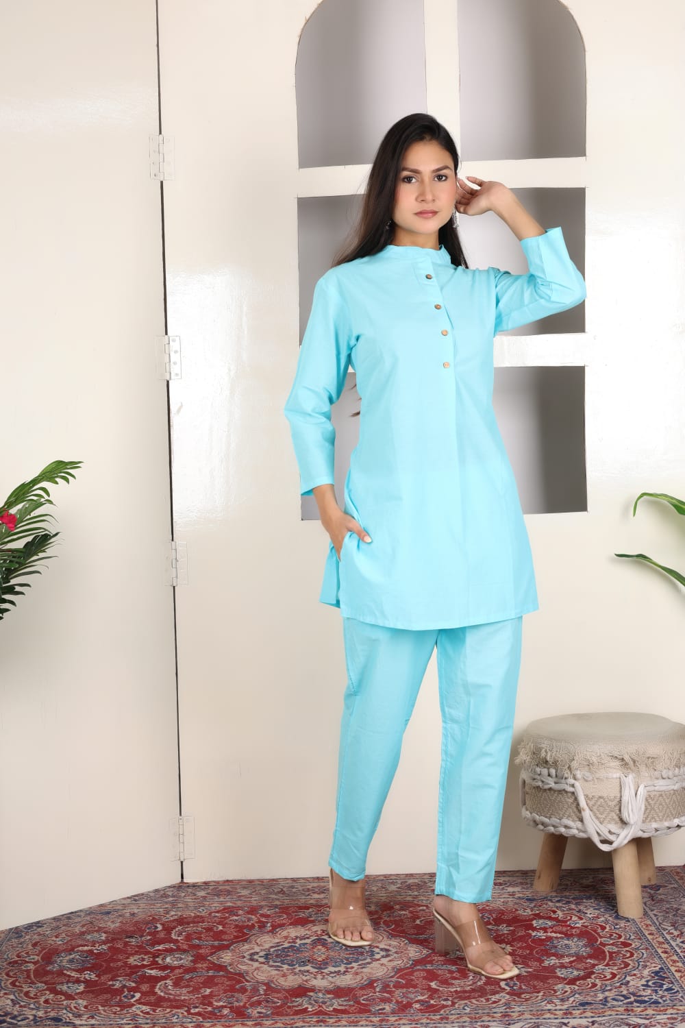 Sky Blue Solid Co Ord Set Kurti Pant Pakistani Readymade Embroidery Set for Women