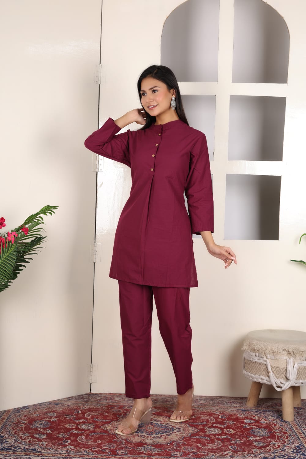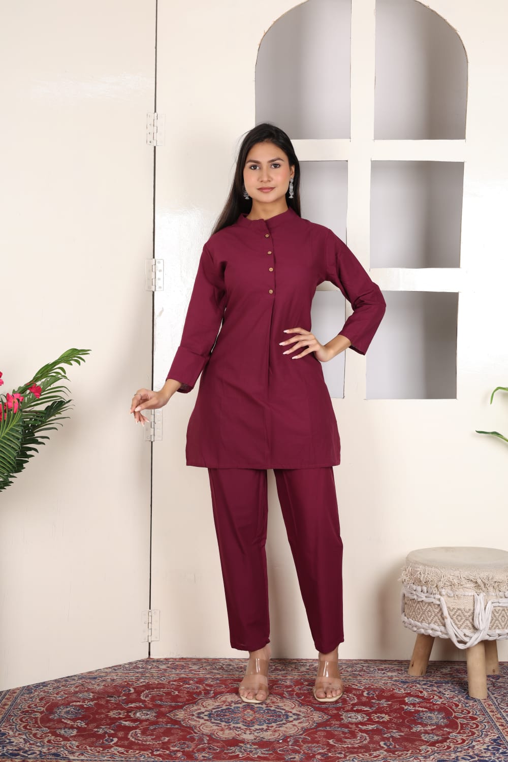 Wine Solid Co Ord Set Kurti Pant Pakistani Readymade Embroidery Set for Women