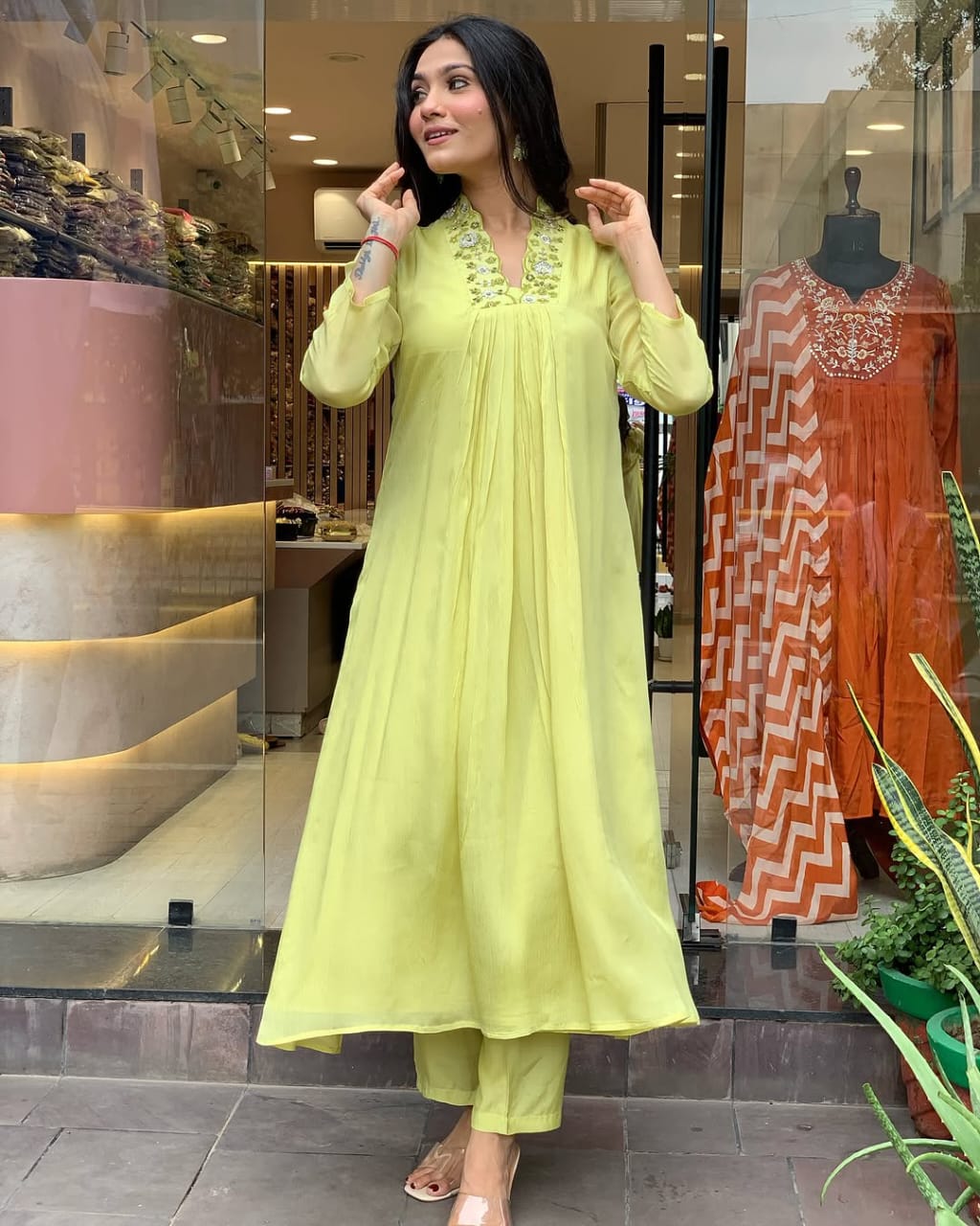Enhance your ethnic wardrobe with our Lemon Yellow Embroidered Anarkali Kurti Pant Dupatta Set for Women. This stunning set includes a flowy Anarkali-style kurta, matching pants, and an elegant dupatta, all intricately embroidered. The vibrant lemon yellow color adds a refreshing touch, making it perfect for special occasions. Crafted for both style and comfort, this set ensures you look graceful and feel comfortable throughout the day. Add a touch of elegance and sophistication to your collection with this beautiful ensemble.