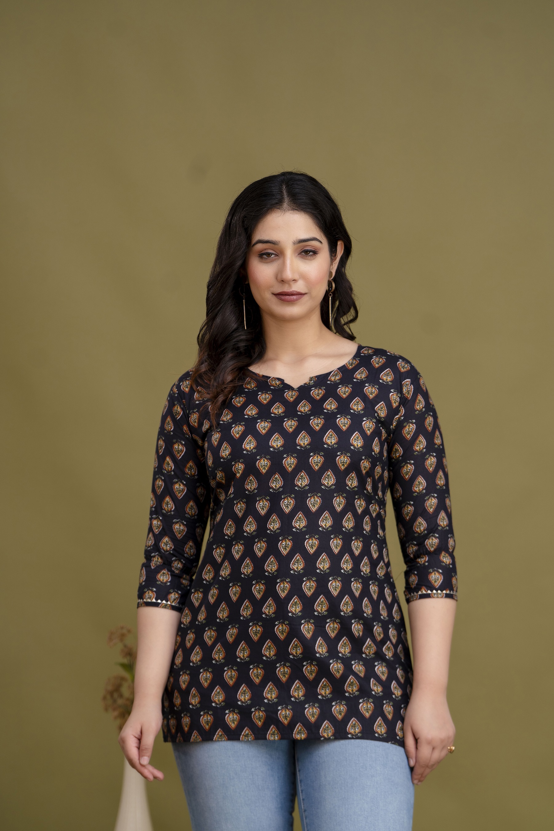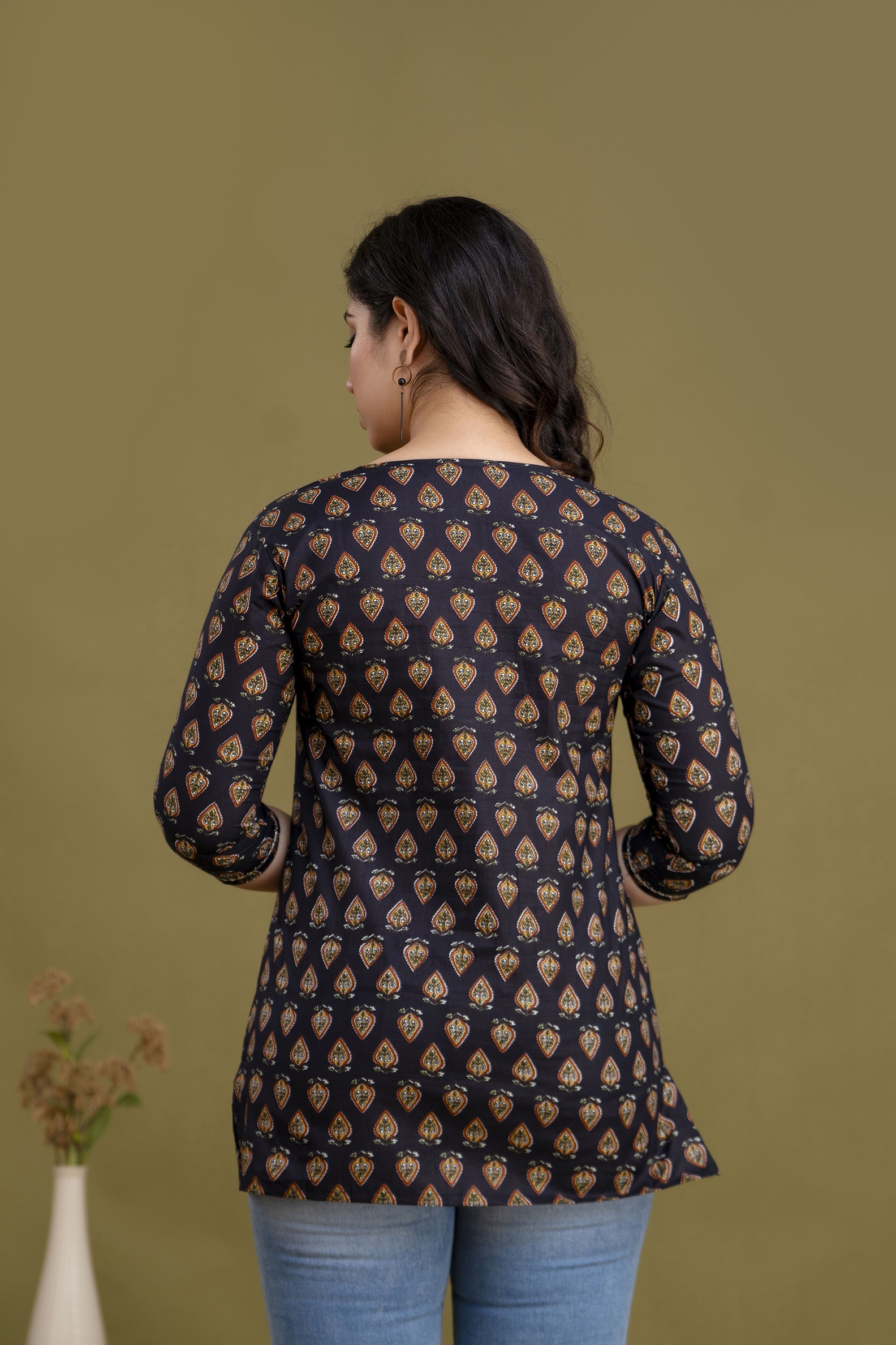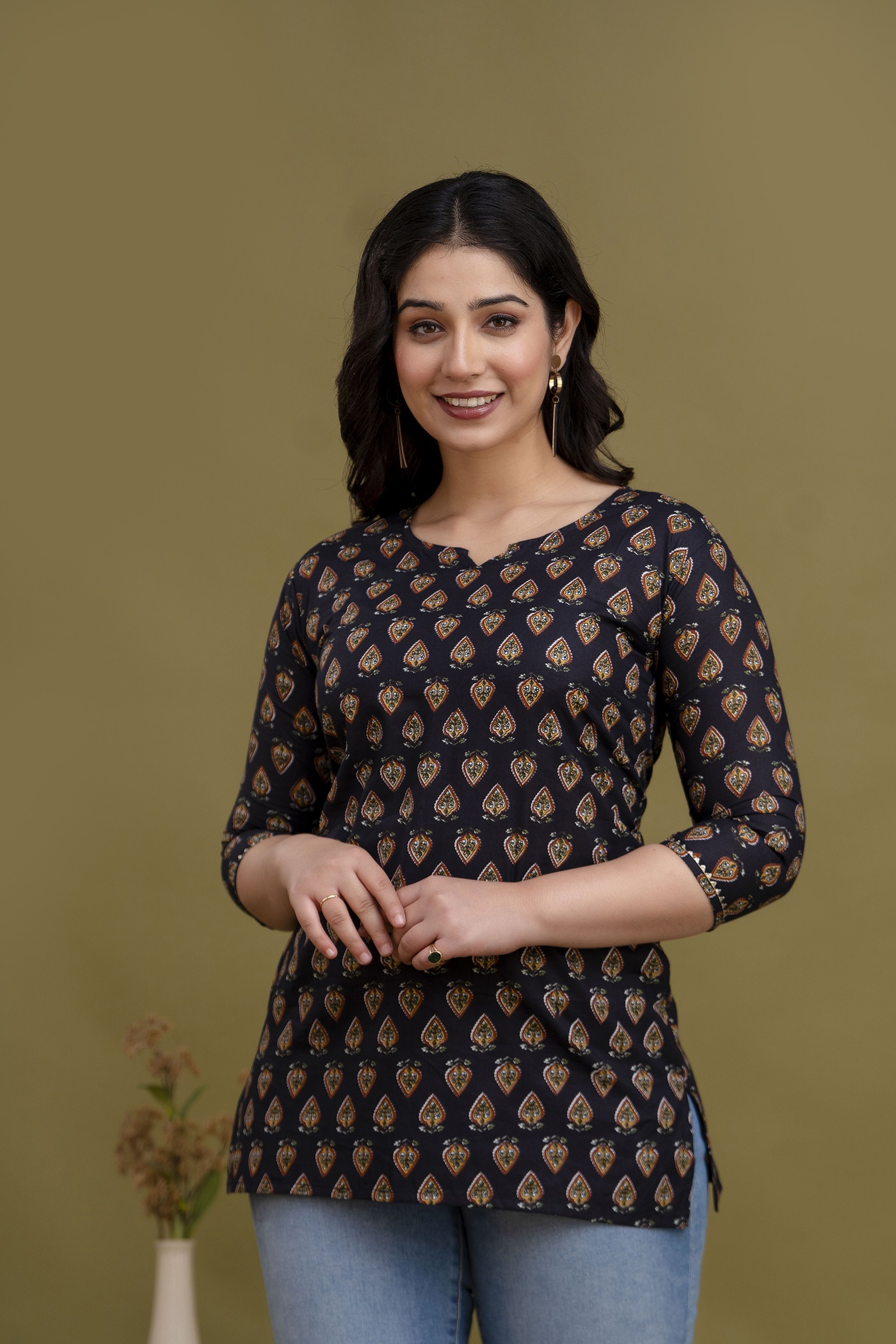 Elevate your everyday style with our Handblock Floral Print Cotton Top in a vibrant Black hue. Crafted from high-quality pure cotton, this top ensures both comfort and breathability. Featuring a classic design and 3/4 sleeves, it boasts a stunning floral print created with non-reactive colors, ensuring lasting vibrancy and charm. Perfectly designed to pair with your favorite jeans or pants, this top brings a chic and sophisticated touch to any casual ensemble. Whether you're heading out for a casual day with friends or a relaxed evening at home, this versatile top is sure to become a staple in your wardrobe, adding a touch of elegance and effortless style to your everyday look.