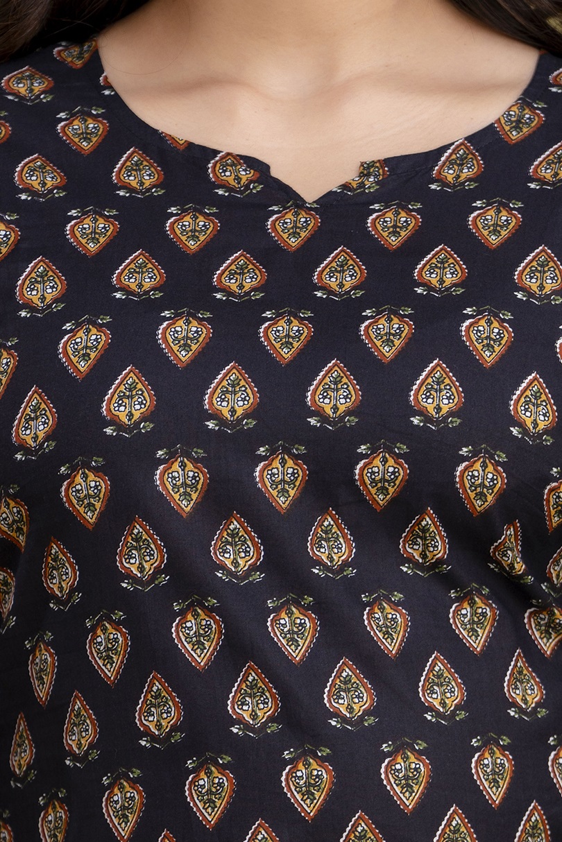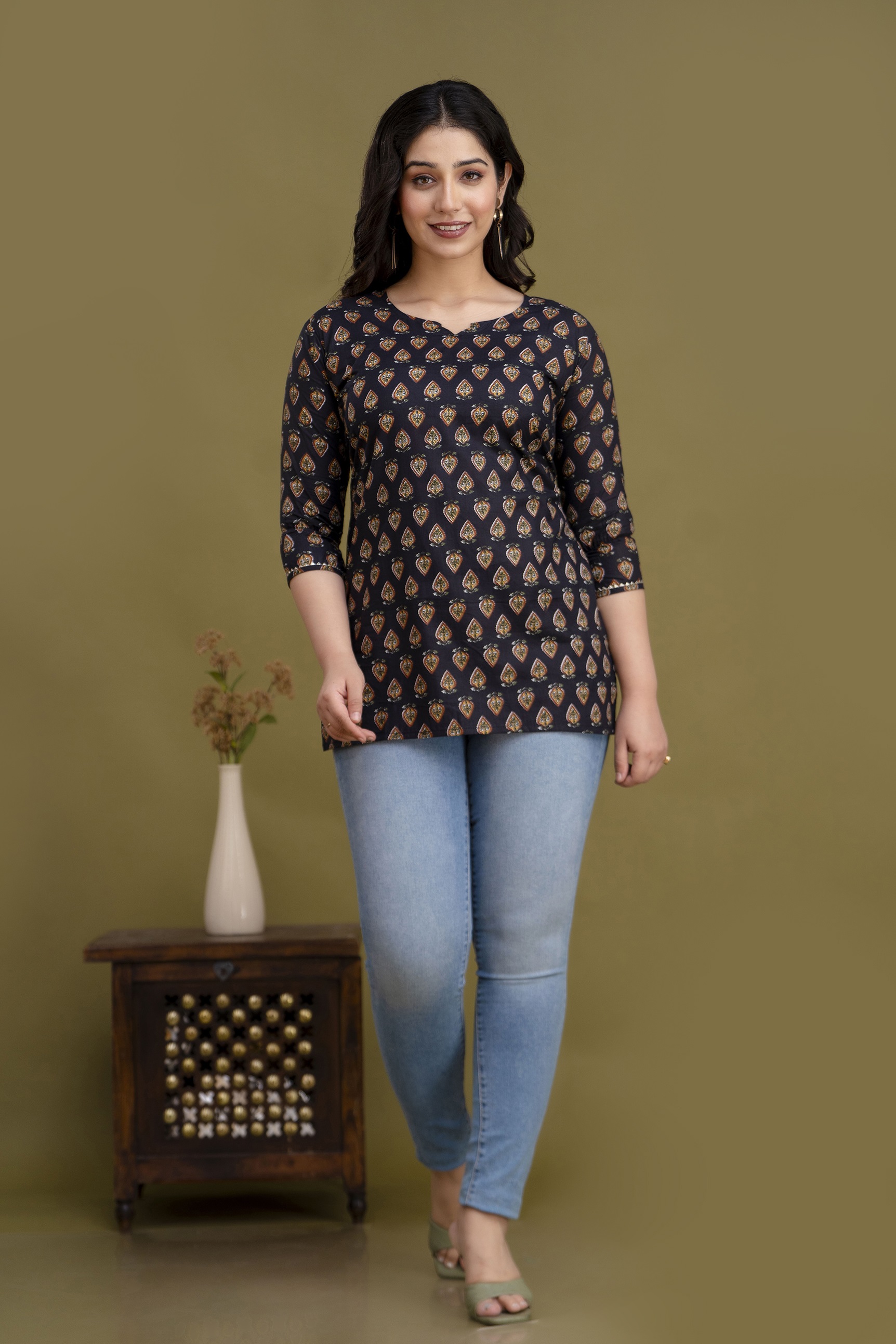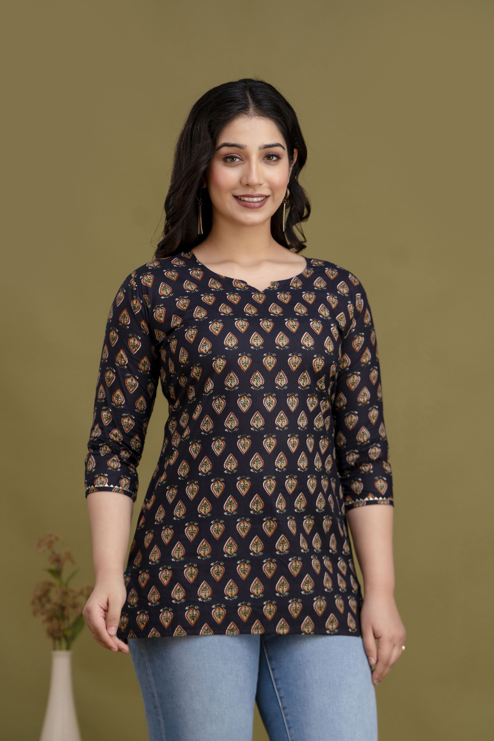 Elevate your everyday style with our Handblock Floral Print Cotton Top in a vibrant Black hue. Crafted from high-quality pure cotton, this top ensures both comfort and breathability. Featuring a classic design and 3/4 sleeves, it boasts a stunning floral print created with non-reactive colors, ensuring lasting vibrancy and charm. Perfectly designed to pair with your favorite jeans or pants, this top brings a chic and sophisticated touch to any casual ensemble. Whether you're heading out for a casual day with friends or a relaxed evening at home, this versatile top is sure to become a staple in your wardrobe, adding a touch of elegance and effortless style to your everyday look.