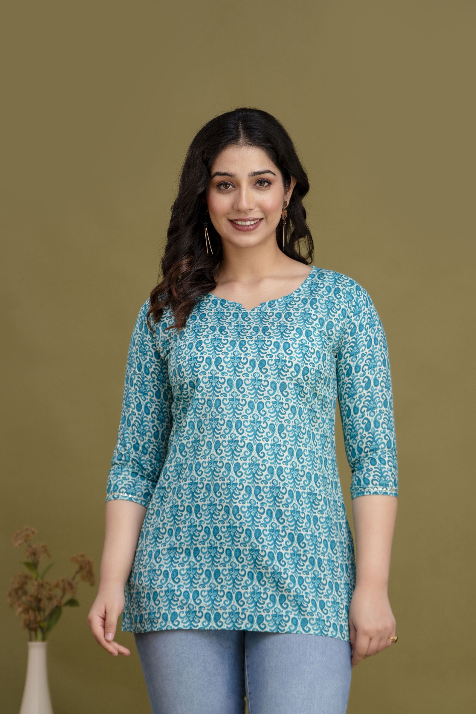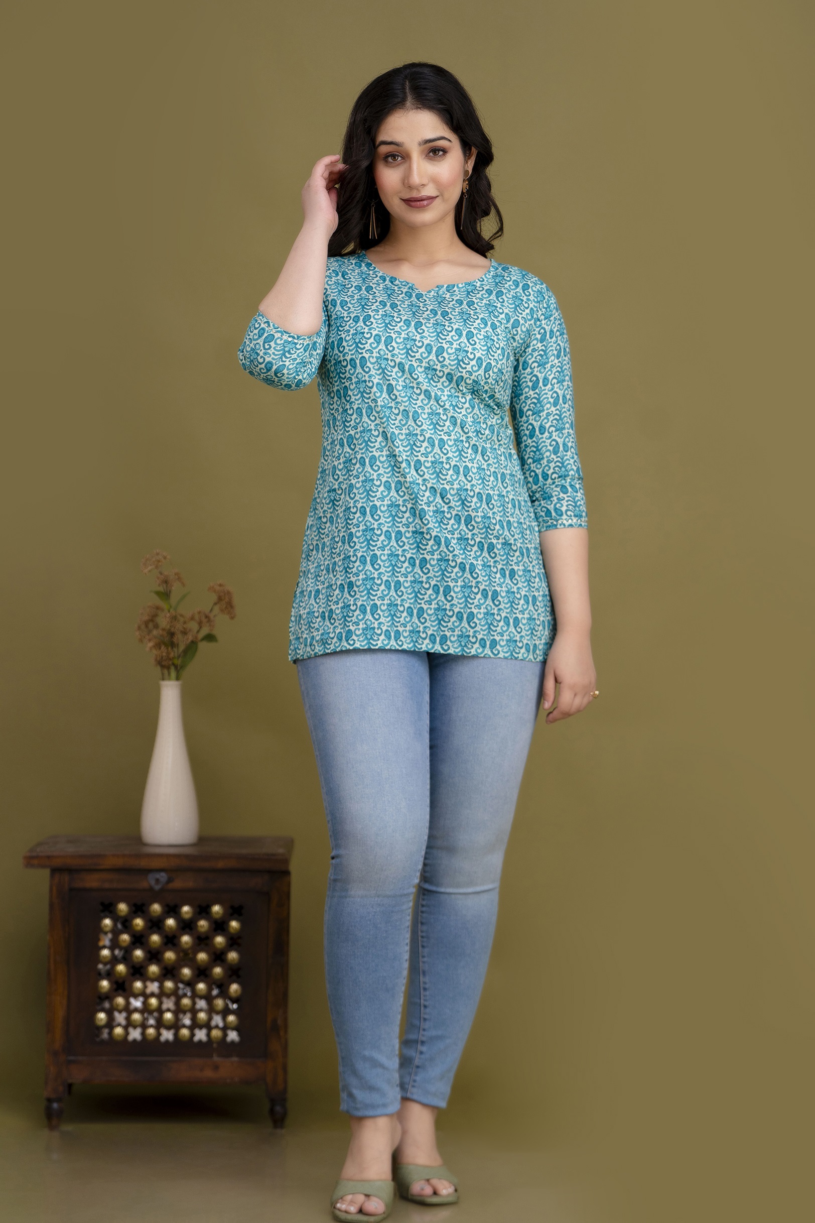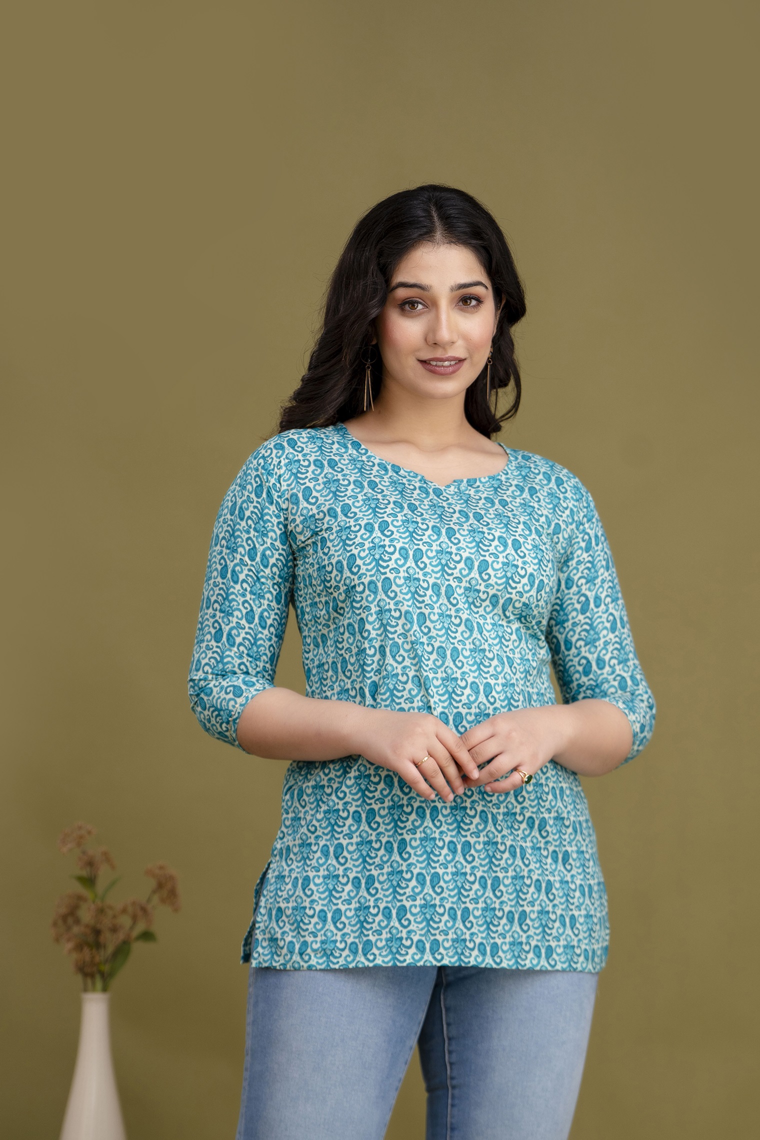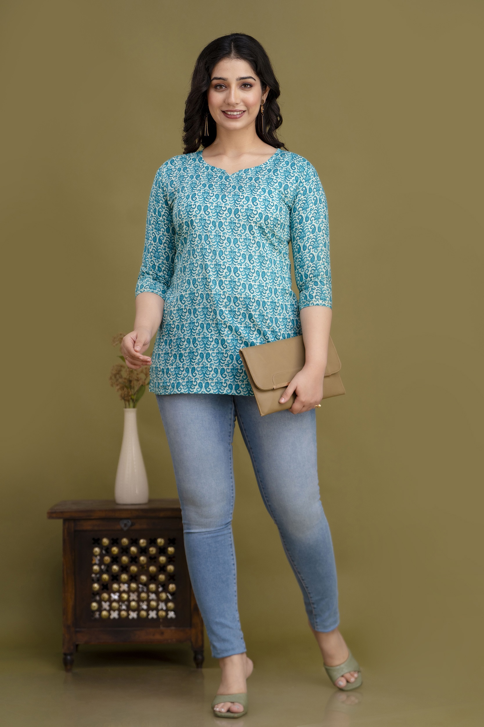 Elevate your everyday style with our Handblock Print Cotton Top. Crafted from high-quality pure cotton, this top ensures both comfort and breathability. Featuring a classic design and 3/4 sleeves, it boasts a stunning floral print created with non-reactive colors, ensuring lasting vibrancy and charm. Perfectly designed to pair with your favorite jeans or pants, this top brings a chic and sophisticated touch to any casual ensemble. Whether you're heading out for a casual day with friends or a relaxed evening at home, this versatile top is sure to become a staple in your wardrobe, adding a touch of elegance and effortless style to your everyday look.