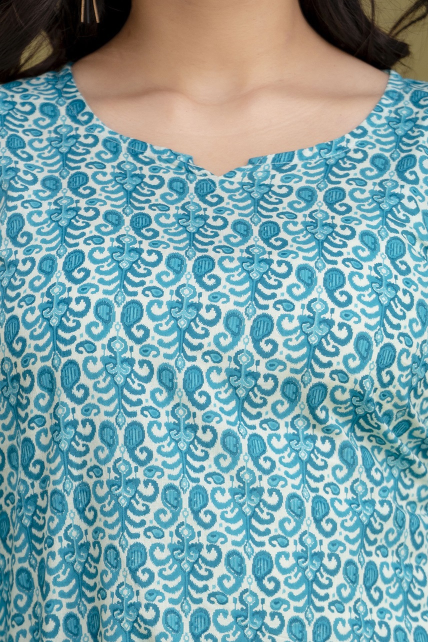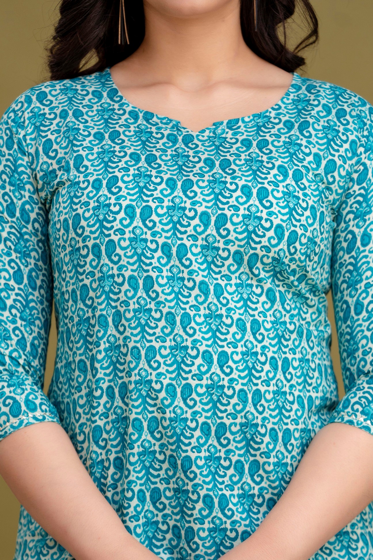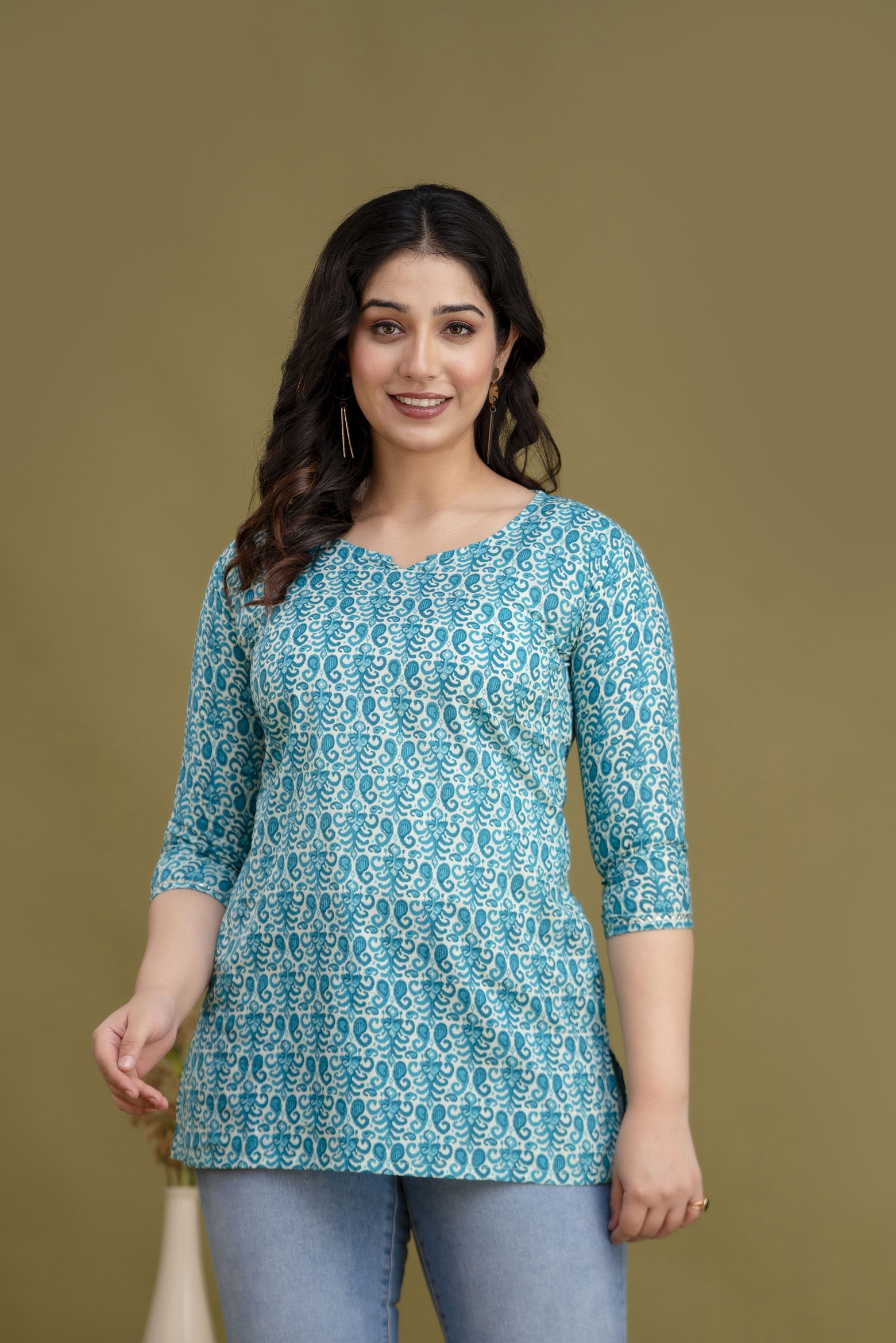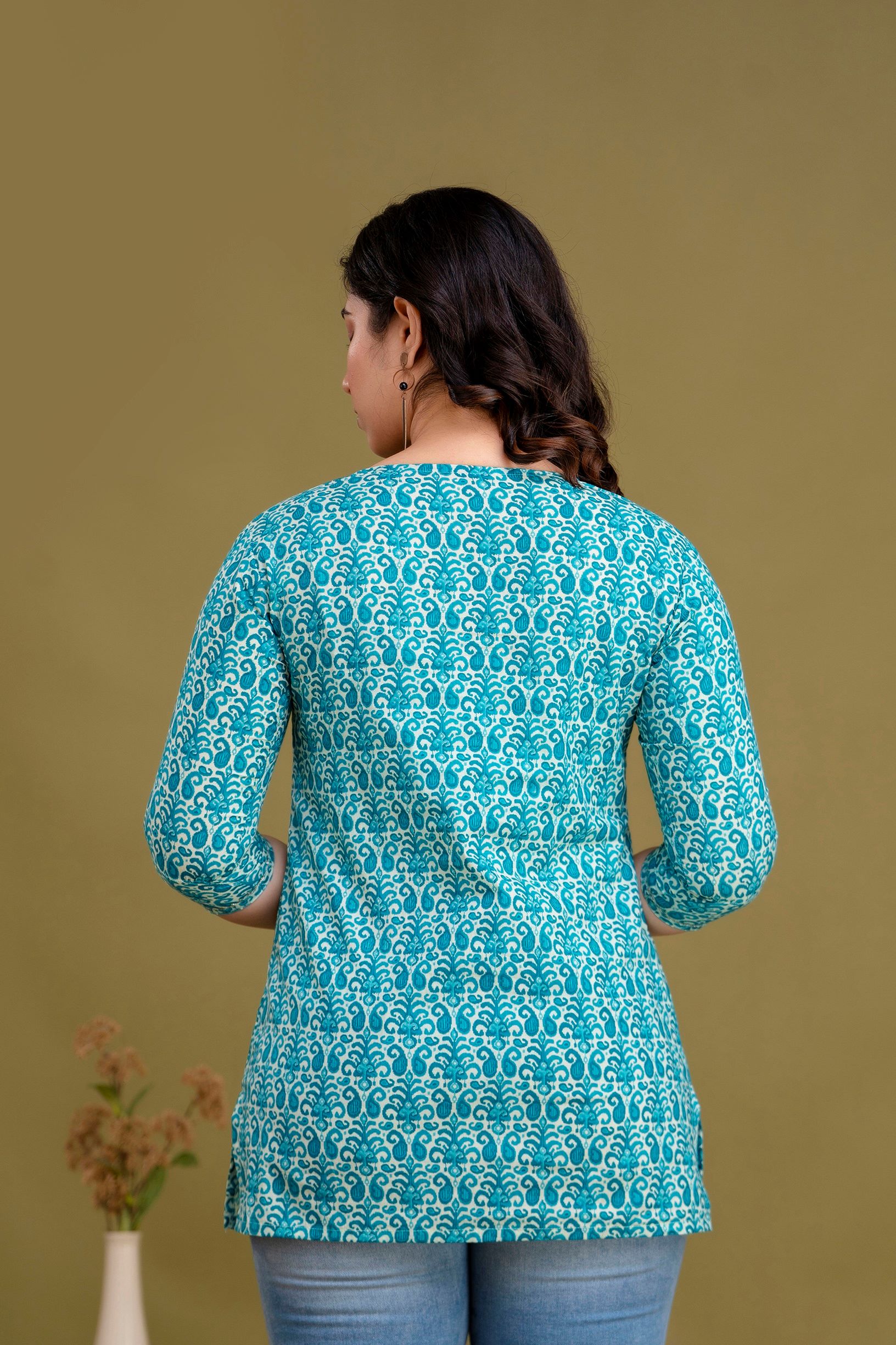 Elevate your everyday style with our Handblock Print Cotton Top. Crafted from high-quality pure cotton, this top ensures both comfort and breathability. Featuring a classic design and 3/4 sleeves, it boasts a stunning floral print created with non-reactive colors, ensuring lasting vibrancy and charm. Perfectly designed to pair with your favorite jeans or pants, this top brings a chic and sophisticated touch to any casual ensemble. Whether you're heading out for a casual day with friends or a relaxed evening at home, this versatile top is sure to become a staple in your wardrobe, adding a touch of elegance and effortless style to your everyday look.