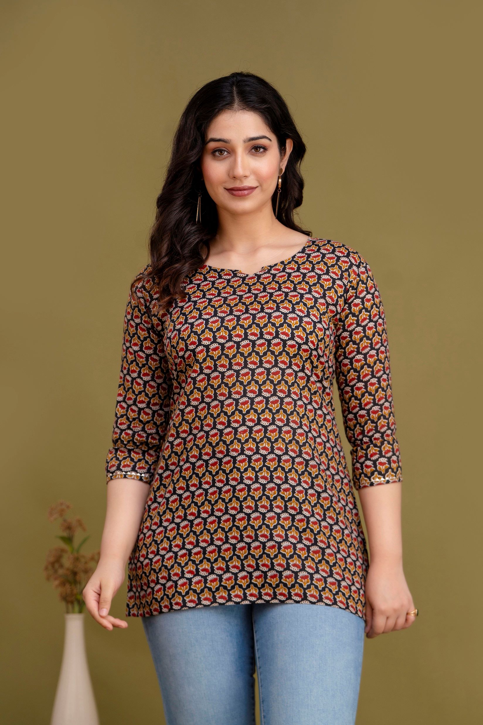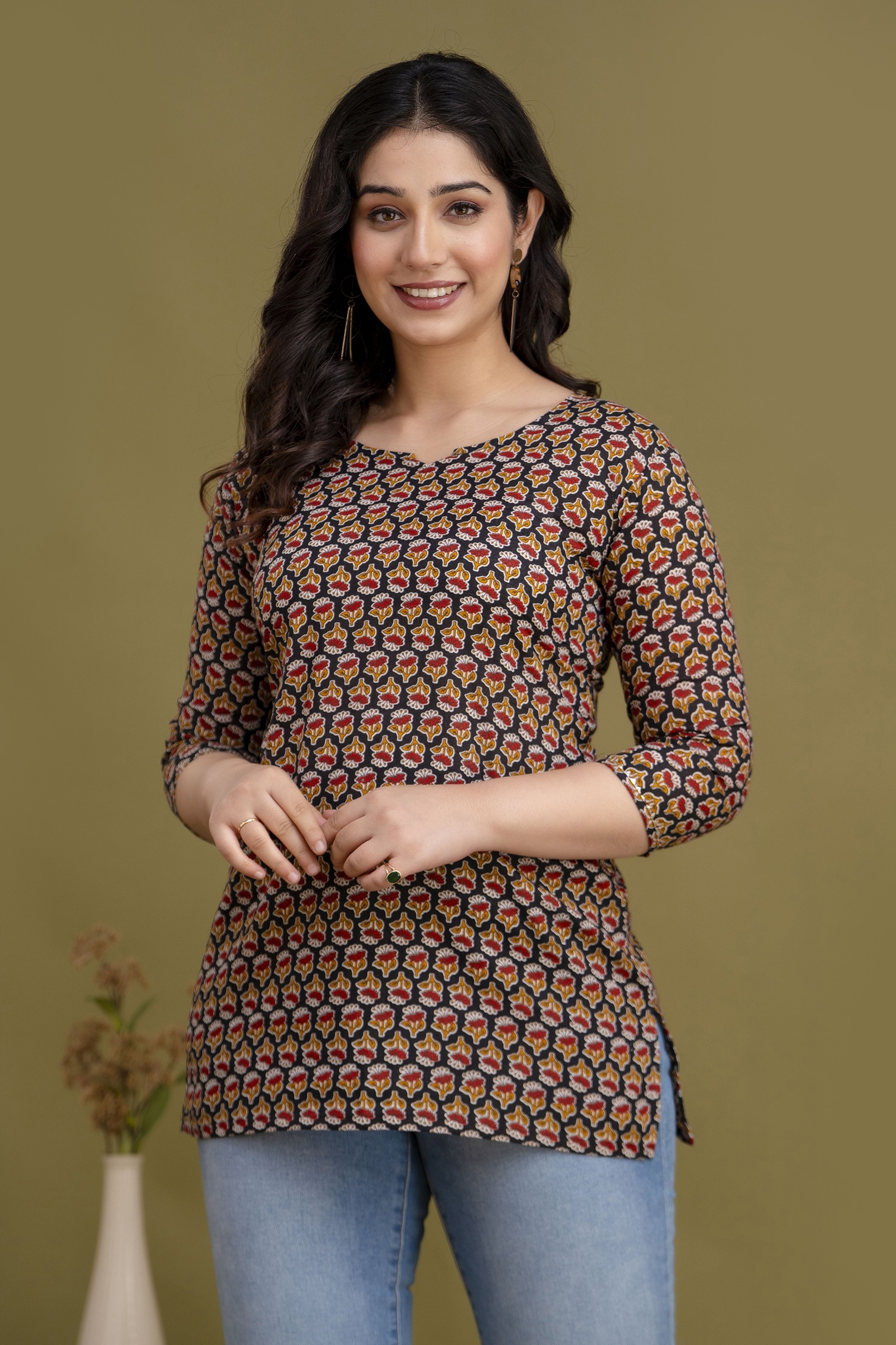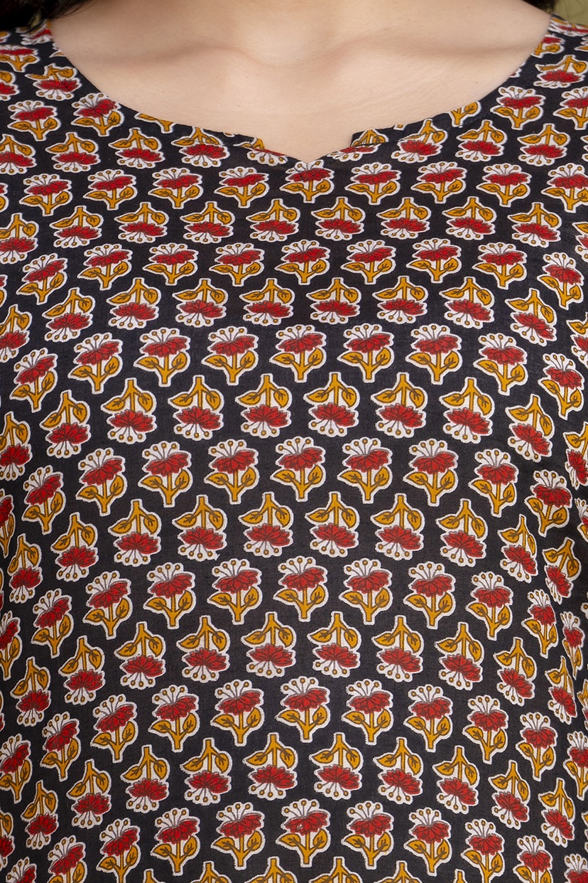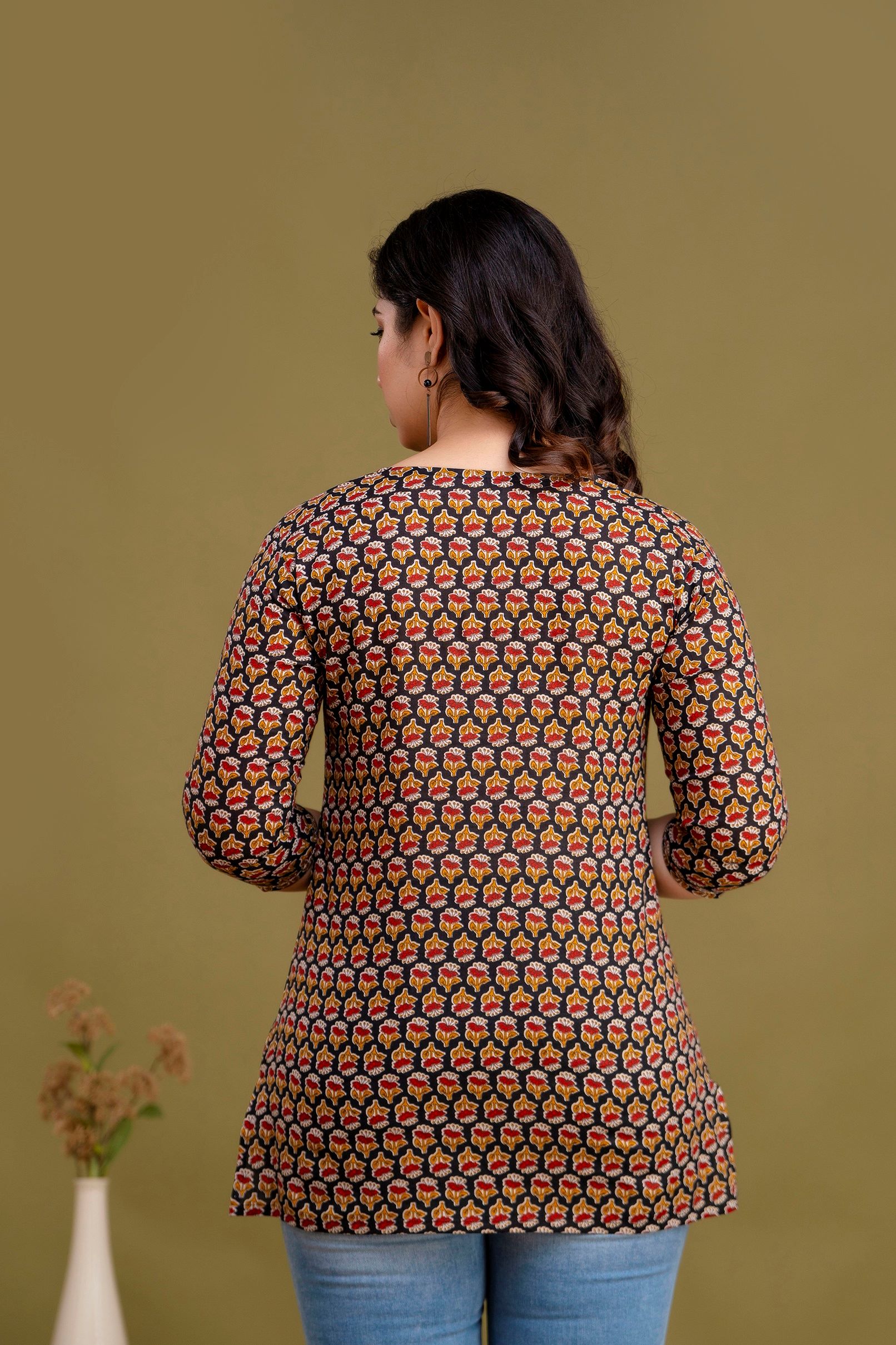 Black Floral Block Printed Top Cotton Short Kurti Tunic for Women