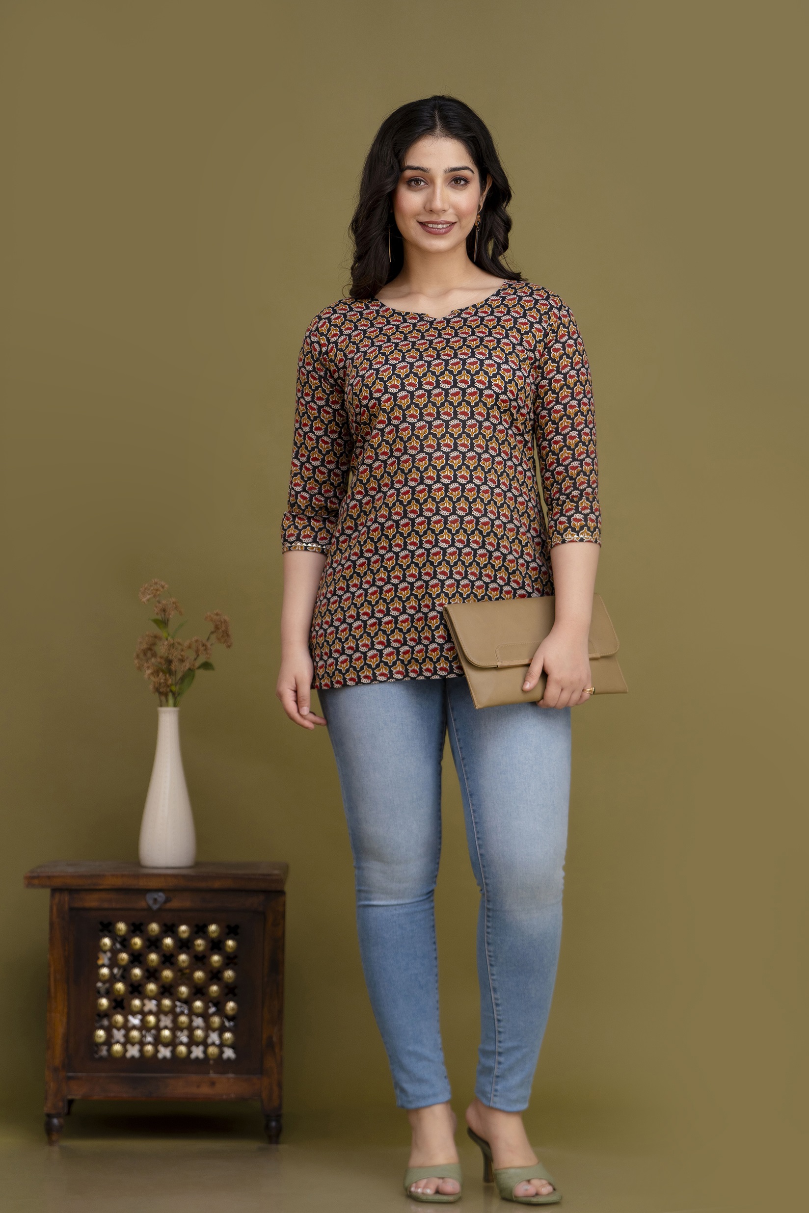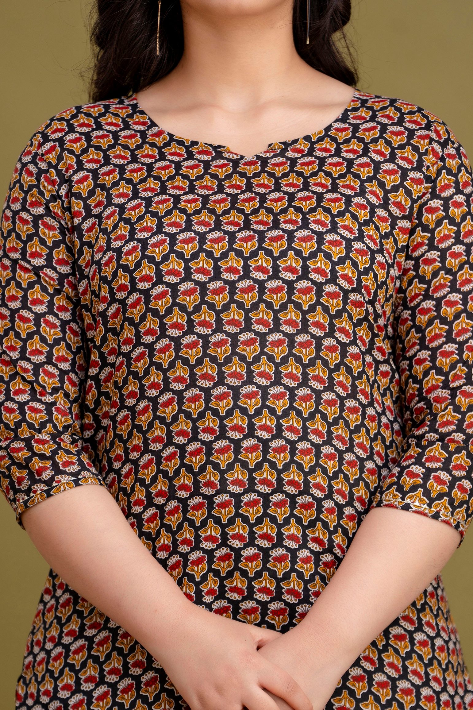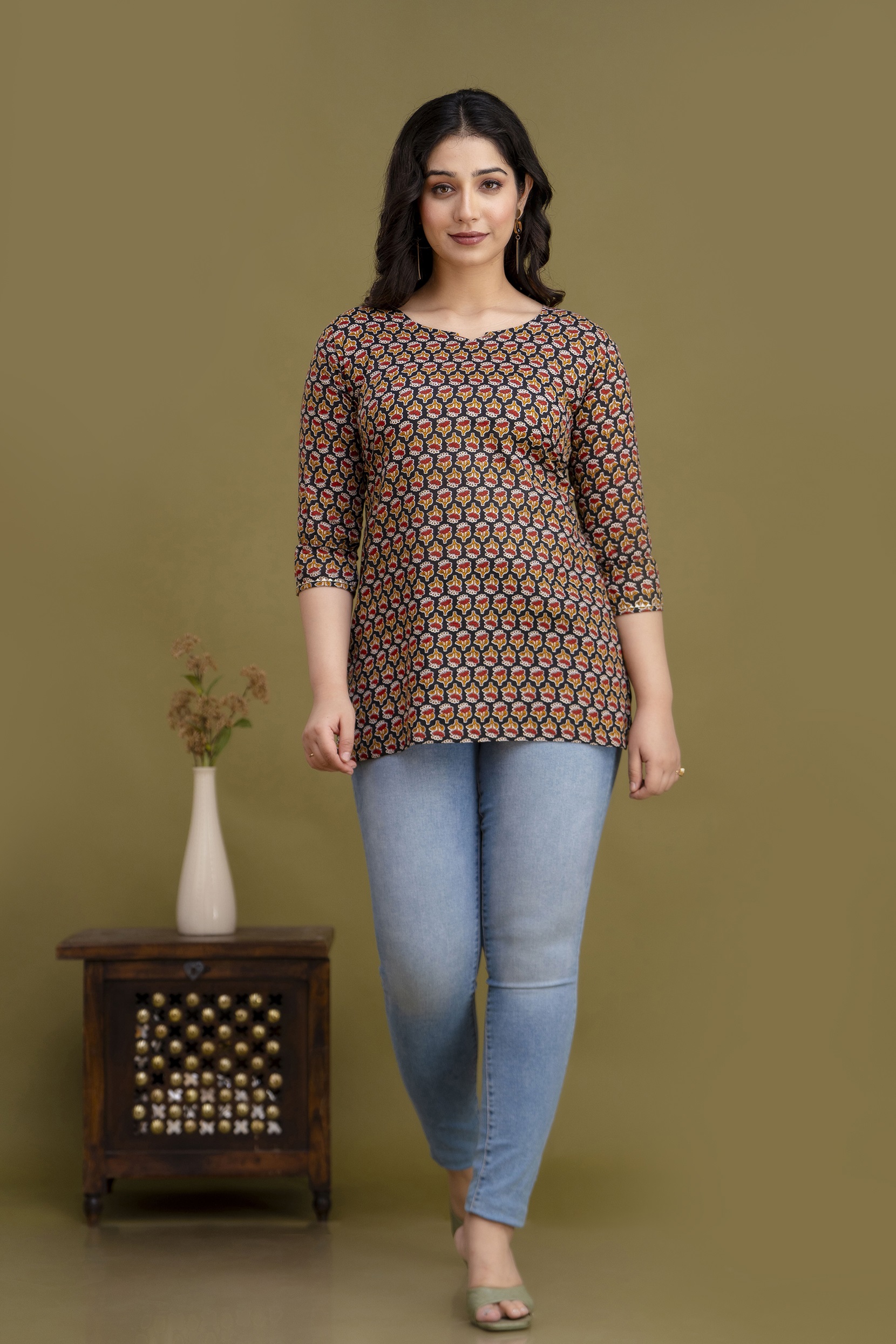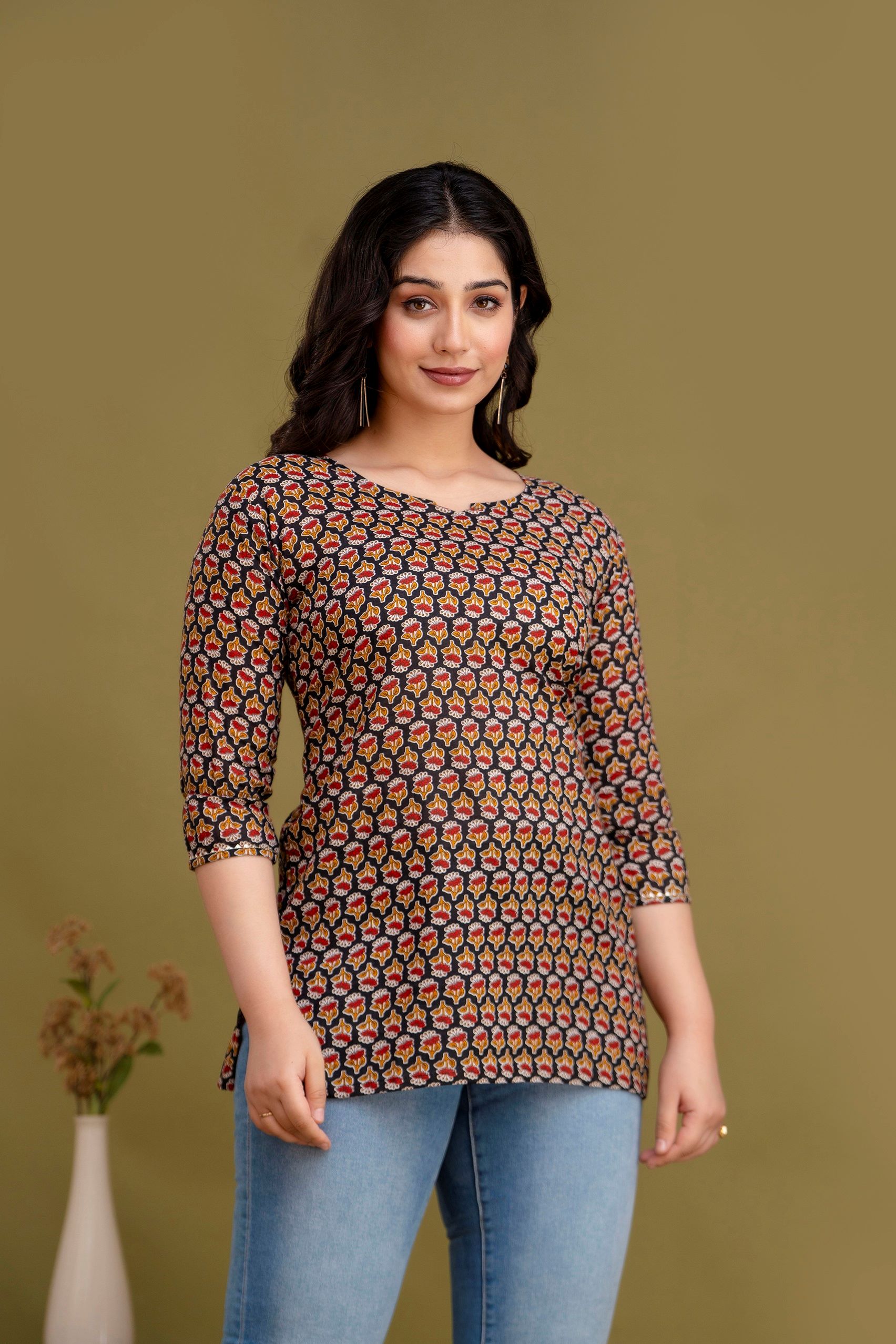 Black Floral Block Printed Top Cotton Short Kurti Tunic for Women