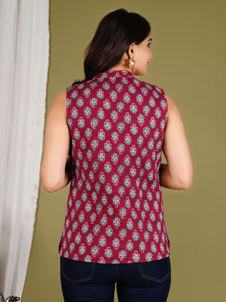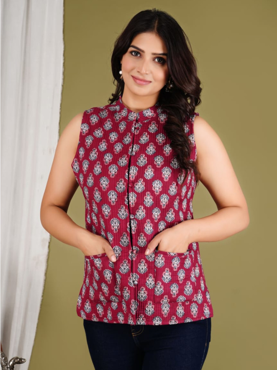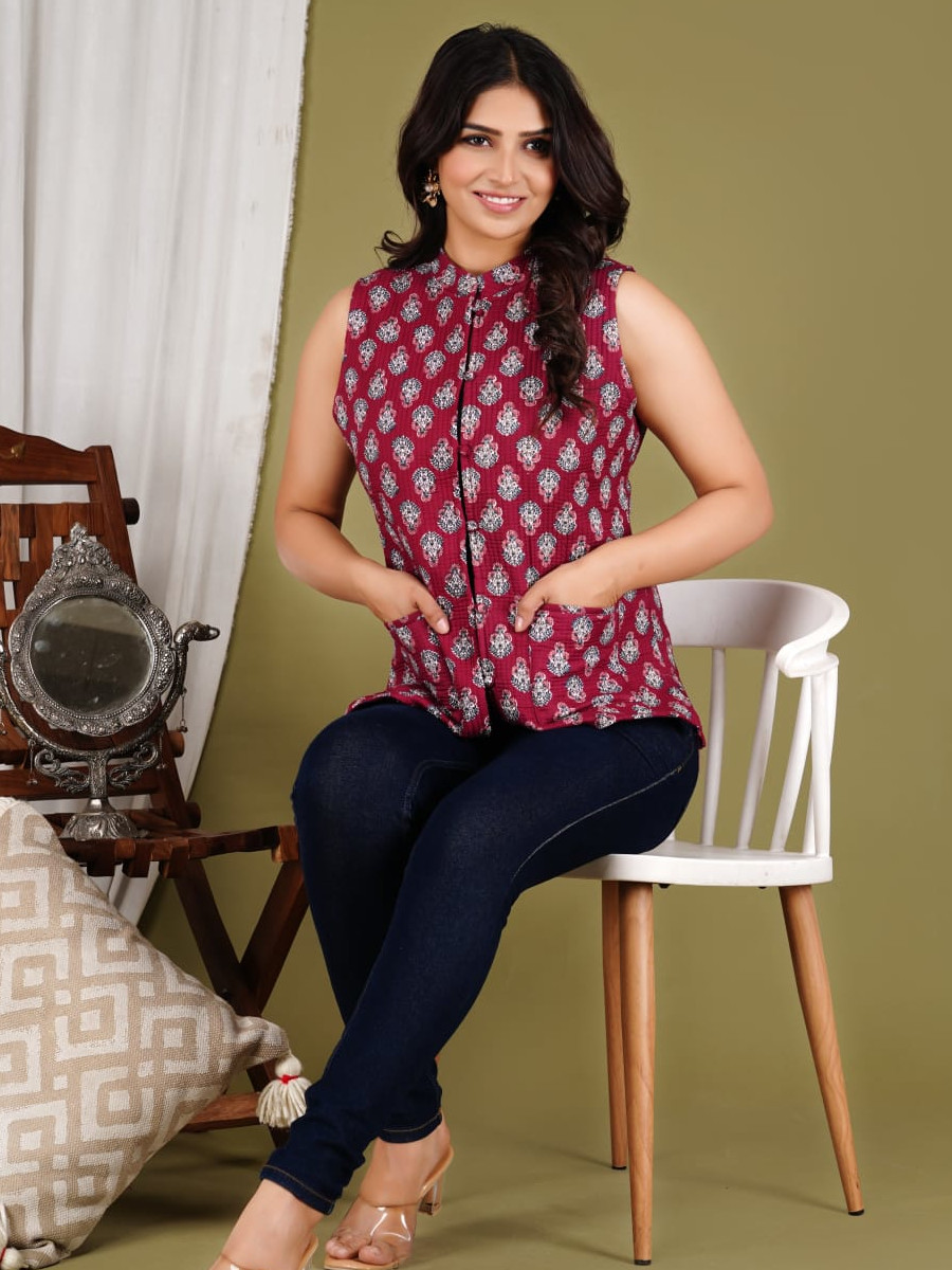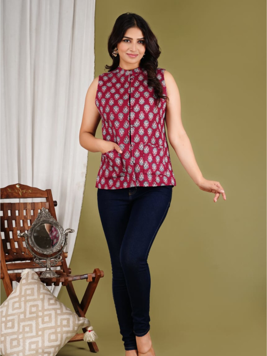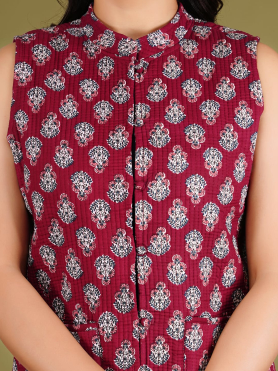 Introducing our Maroon Floral Block Printed Reversible Cotton Sleeveless Quilted Jacket! This versatile and stylish jacket features beautiful intricate floral prints on both sides, providing two distinct looks in one. Made from premium cotton for comfort and breathability, it's perfect for layering in any season. The sleeveless design and lightweight quilting add warmth without bulk, making it an essential addition to your wardrobe. Elevate your outfit with this chic and eco-friendly reversible jacket!