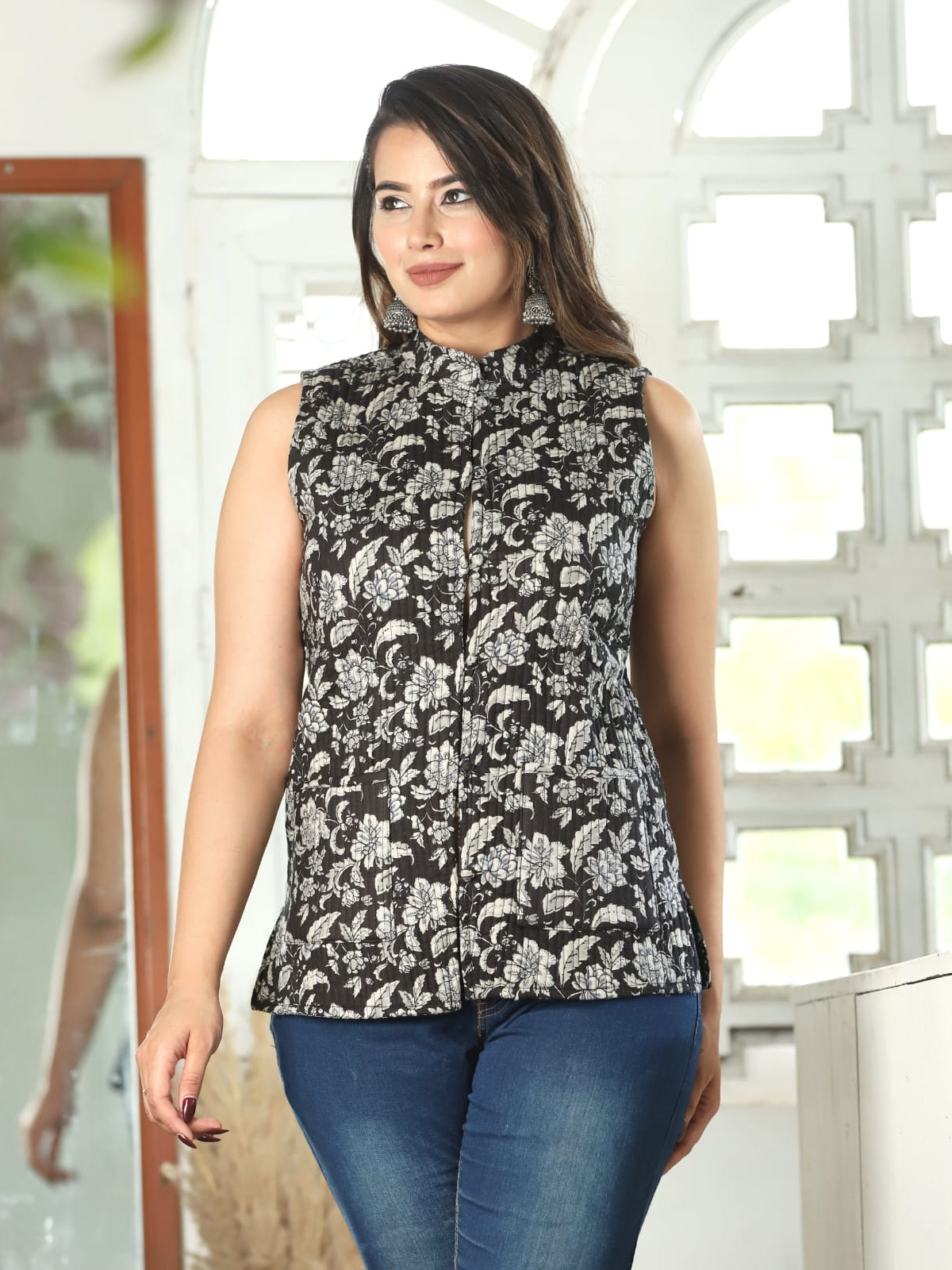 Julia Black Floral Hand Block Printed Reversible 2 side Cotton Sleeveless Quilted Kantha Jacket