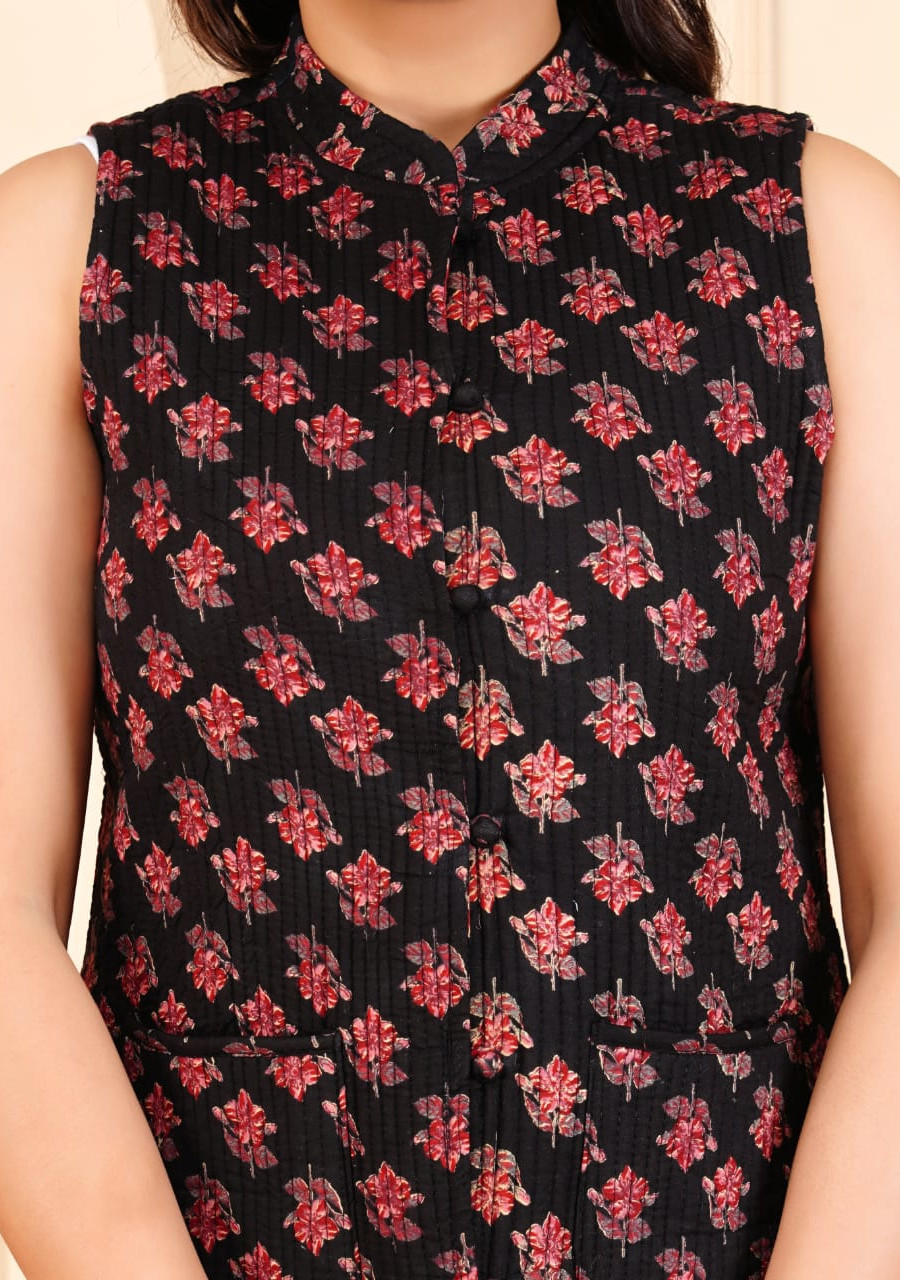 Black Floral Hand Block Sanganeri Printed Cotton Sleeveless Stylish Quilted Jacket for Women - Reversible 2 side