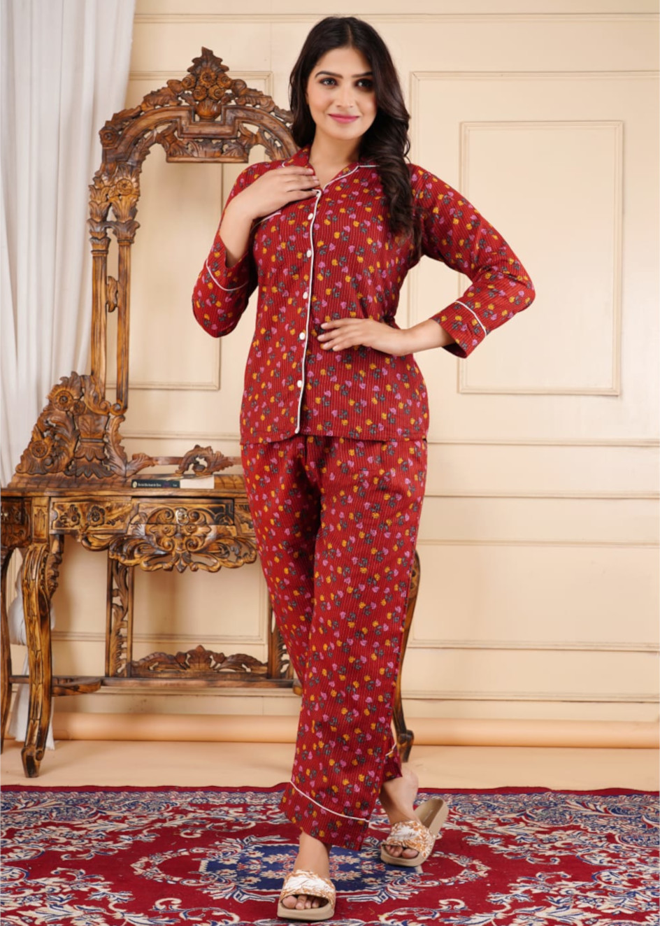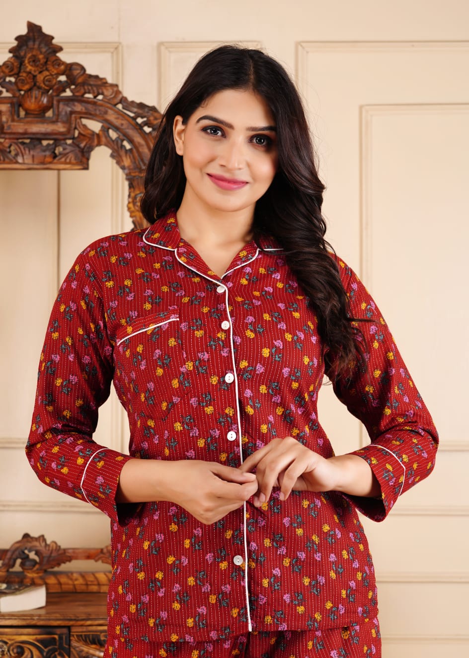 Elevate your relaxation with our Cotton Lounge Wear. Featuring a delightful Red hue, this PJ is adorned with a charming floral print on a serene base. Crafted from premium cotton, it ensures unparalleled comfort and style. Ideal for lounging at home or casual outings, this night suit adds a touch of elegance to your everyday wear. Embrace the perfect blend of relaxation and sophistication with this beautiful ensemble.