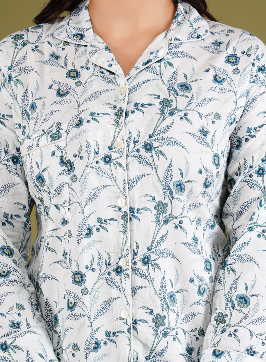Elevate your relaxation with our Cotton Lounge Wear. Featuring a delightful Ivory hue, this PJ is adorned with a charming floral print on a serene base. Crafted from premium cotton, it ensures unparalleled comfort and style. Ideal for lounging at home or casual outings, this night suit adds a touch of elegance to your everyday wear. Embrace the perfect blend of relaxation and sophistication with this beautiful ensemble.