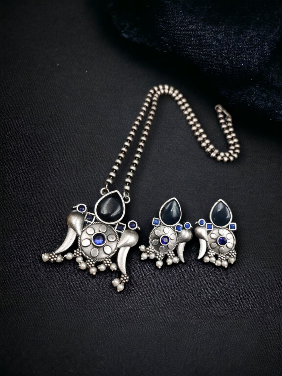 Blue Indian Ethnic Antique Style Monalisa Stone Silver Oxidized Necklace with Earrings