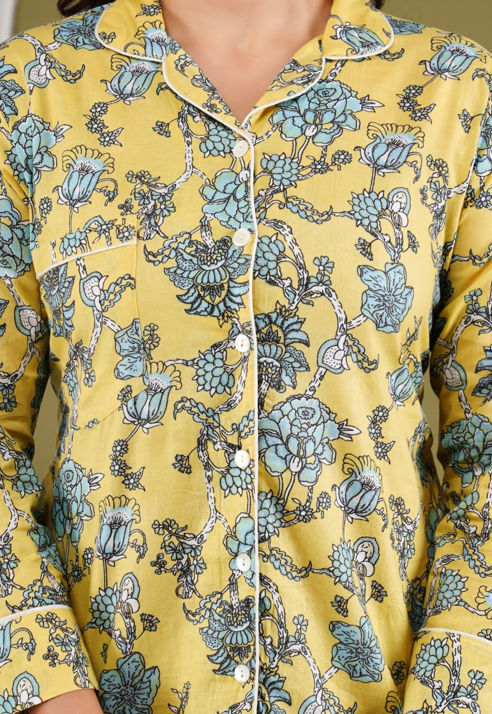 Yellow Cotton Floral Print PJ Night Wear Lapel Collar Night Suit Lounge Wear Pyjama Co Ord Set for Girls